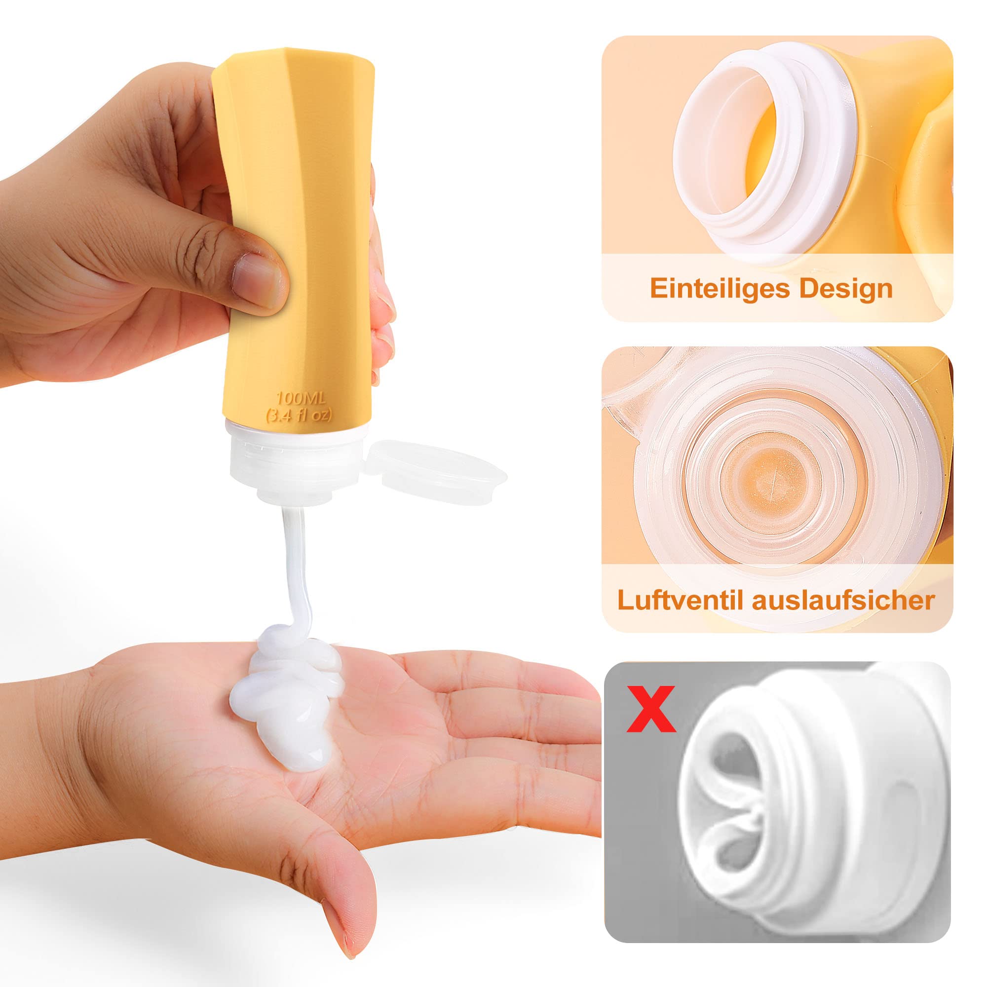 Die Reiseflaschen bestehen aus weichem, flexiblem Silikon, das ein einfaches Befuellen und komfortables Dosieren ermoeglicht. Auch dickfluessige Produkte lassen sich durch leichtes Druecken muhelos entnehmen, ohne dass Rueckstaende im Behaelter verbleiben. Die breite Oeffnung erleichtert zudem das saubere Nachfuellen und die gruendliche Reinigung.