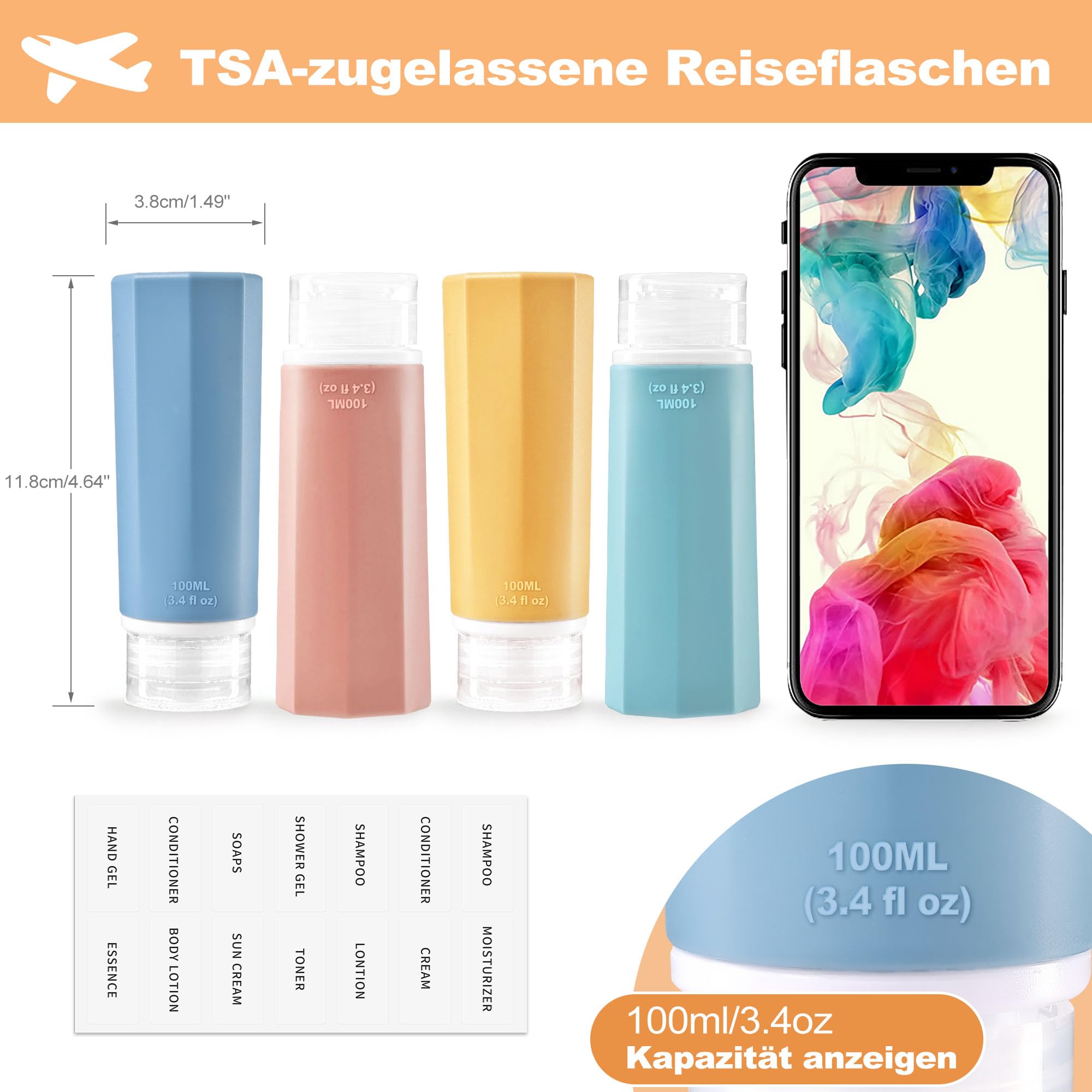 Opret 4 Stück Silikon Reiseflaschen Set, 100ml Reiseflaschen zum Befüllen Kosmetik Shampoo Flüssigkeiten, Auslaufsicher Nachfüllbare Leer Reiseset Reisegröße Behälter Travel Bottles Set Travel Kit
