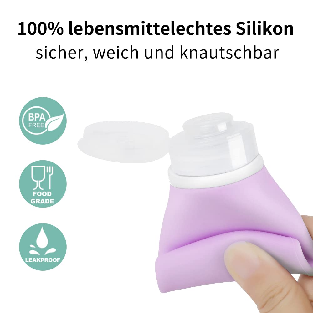 Die Reiseflaschen bestehen aus weichem, flexiblem Silikon, das ein einfaches Befuellen und komfortables Dosieren ermoeglicht. Auch dickfluessige Produkte lassen sich durch leichtes Druecken muhelos entnehmen, ohne dass Rueckstaende im Behaelter verbleiben. Die breite Oeffnung erleichtert zudem das saubere Nachfuellen sowie die gruendliche Reinigung.