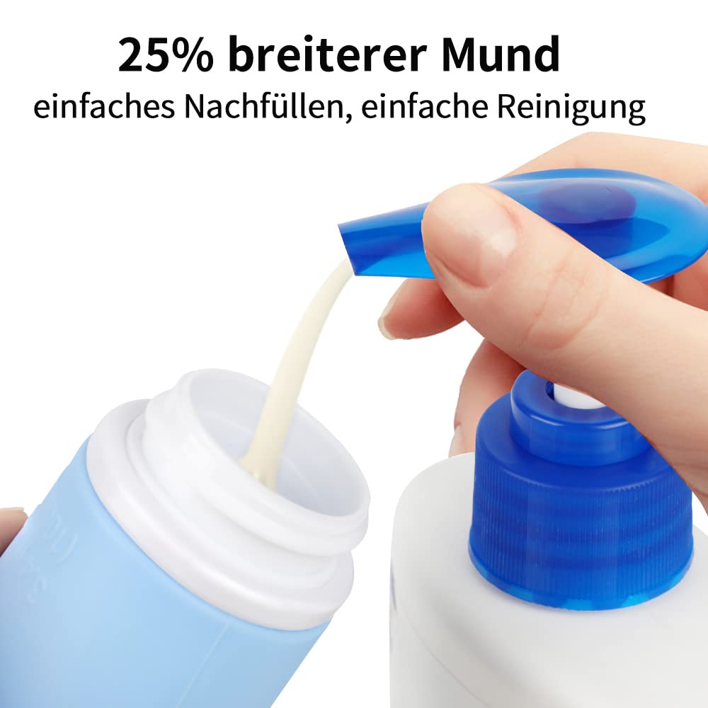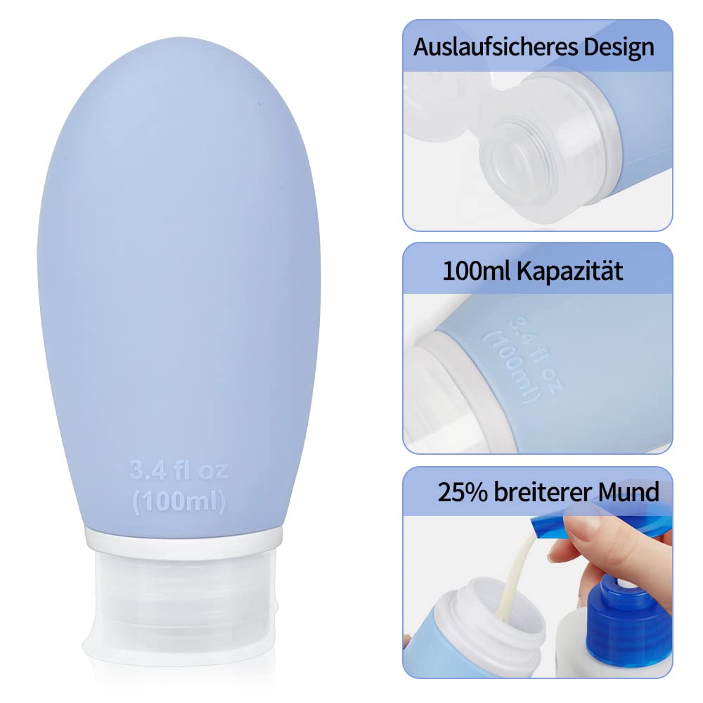Die Reiseflaschen bestehen aus weichem, flexiblem Silikon, das ein einfaches Befuellen und komfortables Dosieren ermoeglicht. Auch dickfluessige Produkte lassen sich durch leichtes Druecken muhelos entnehmen, ohne dass Rueckstaende im Behaelter verbleiben. Die breite Oeffnung erleichtert zudem das saubere Nachfuellen und die gruendliche Reinigung.