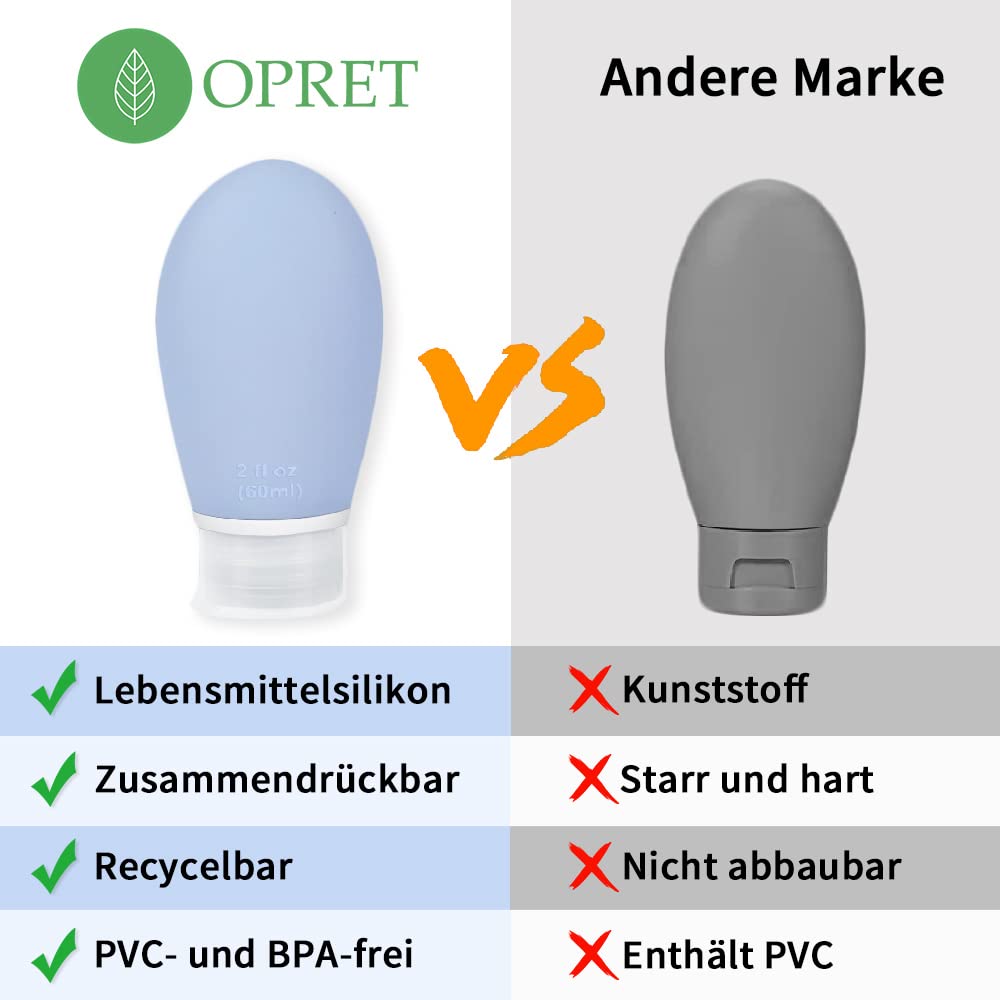 Das Opret Silikon Reiseflaschen Set ist die perfekte Wahl fuer alle, die ihre Pflegeprodukte platzsparend, sicher und komfortabel auf Reisen transportieren moechten.