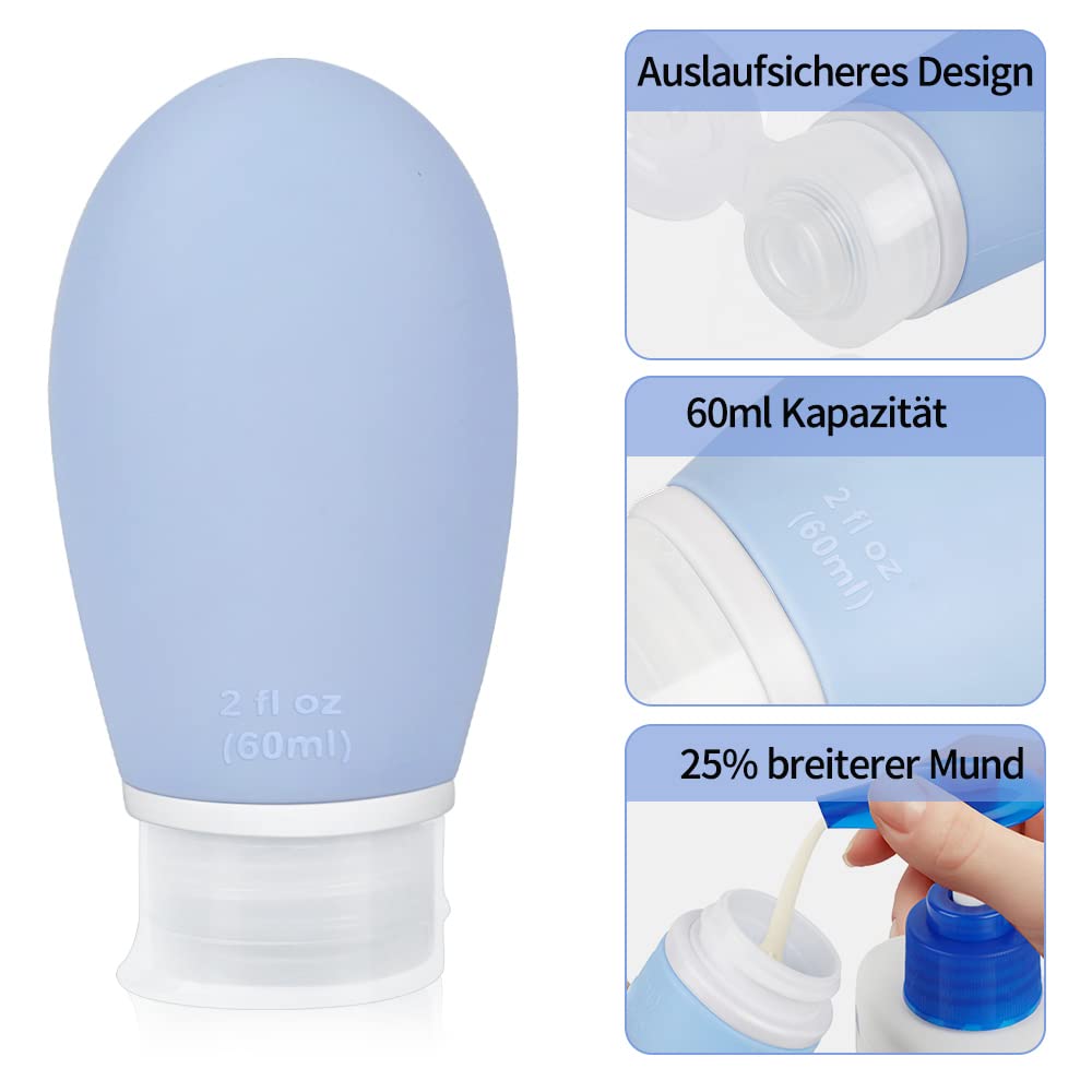Die Reiseflaschen bestehen aus weichem, flexiblem Silikon, das ein einfaches Befuellen und komfortables Dosieren ermoeglicht. Auch dickfluessige Produkte lassen sich durch leichtes Druecken muhelos entnehmen, ohne dass Rueckstaende im Behaelter verbleiben. Die breite Oeffnung erleichtert zudem das saubere Nachfuellen sowie die gruendliche Reinigung.