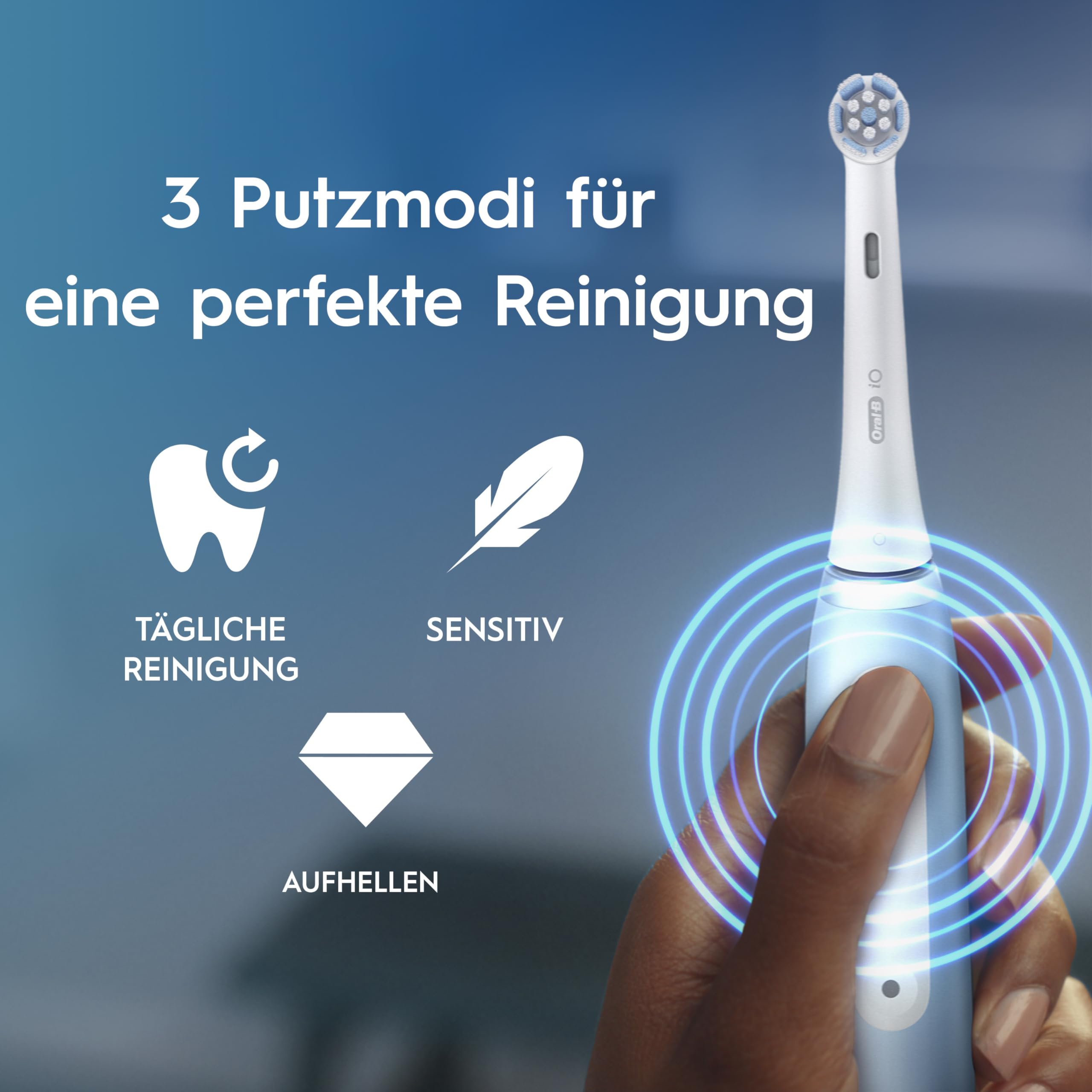 • SCHÜTZT DAS ZAHNFLEISCH mit der iO Andruckkontrolle – die Einzige von Oral-B, die mit grünem Licht den OPTIMALEN DRUCK für eine effektive und sanfte Reinigung anzeigt