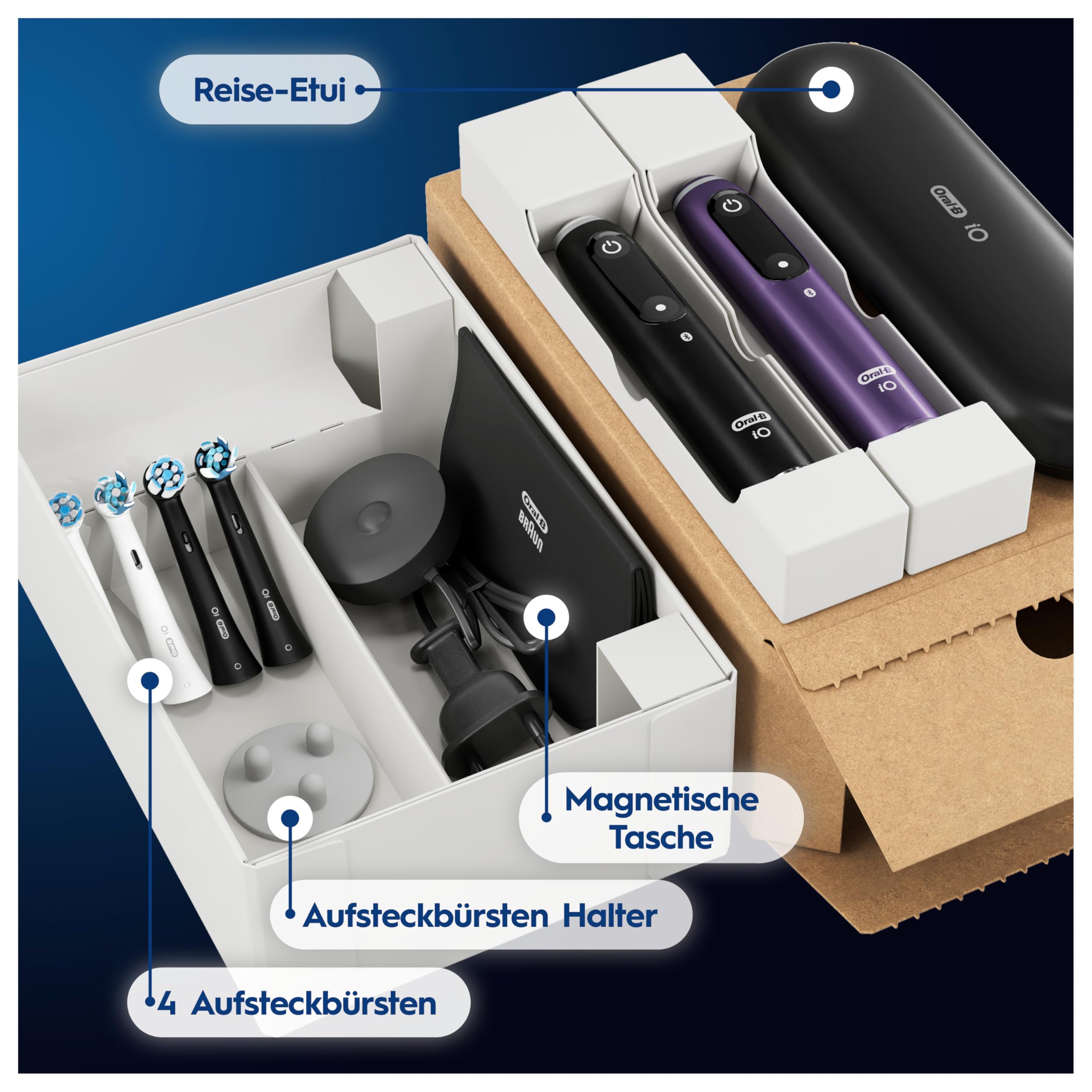 Oral-B iO Series 8 Plus Edition Doppelpack Elektrische Zahnbürste/Electric Toothbrush, PLUS 4 Aufsteckbürsten, 6 Modi für Zahnpflege, Reiseetui, Designed by Braun, black/violet