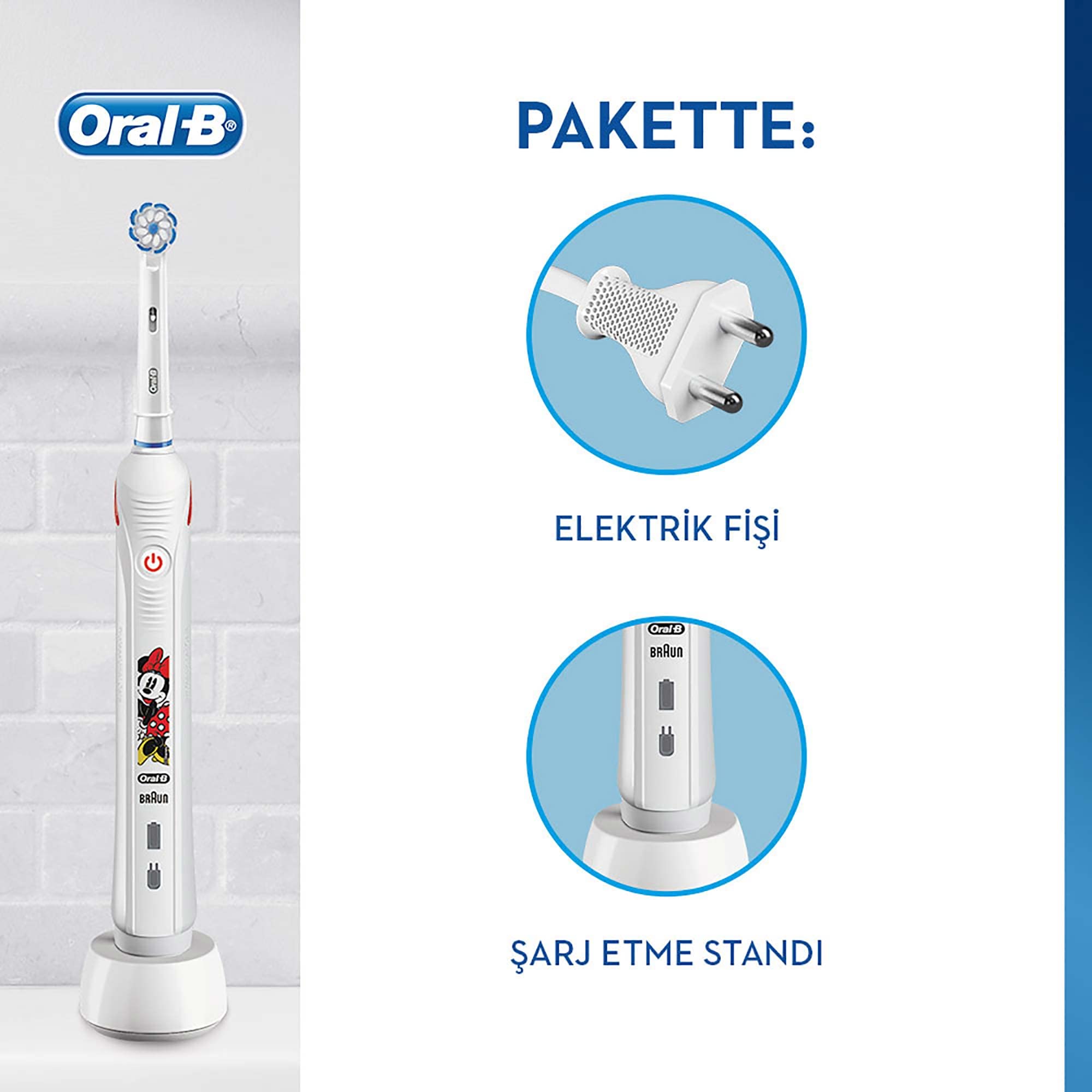 Oral-B Junior Minnie Mouse Elektrische Zahnbürste für Kinder ab 6 Jahren, weiche Borsten & visuelle Andruckkontrolle für extra Zahnfleischschutz, 2 Putzprogramme inkl. Sensitiv, Timer, weiss