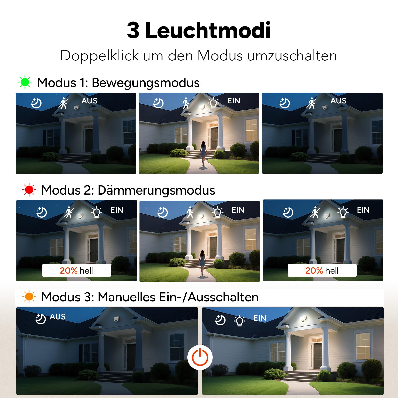 OREiN 3000LM Aussenstrahler mit bewegungsmelder 27W (230W), 2700/4000/6500K Wandlampe mit 3 Leuchtmodi, DIY-Sensor, 160-Leds IP65 LED Aussenwandleuchte Flutlicht, Upgraded Einbau, Weiss