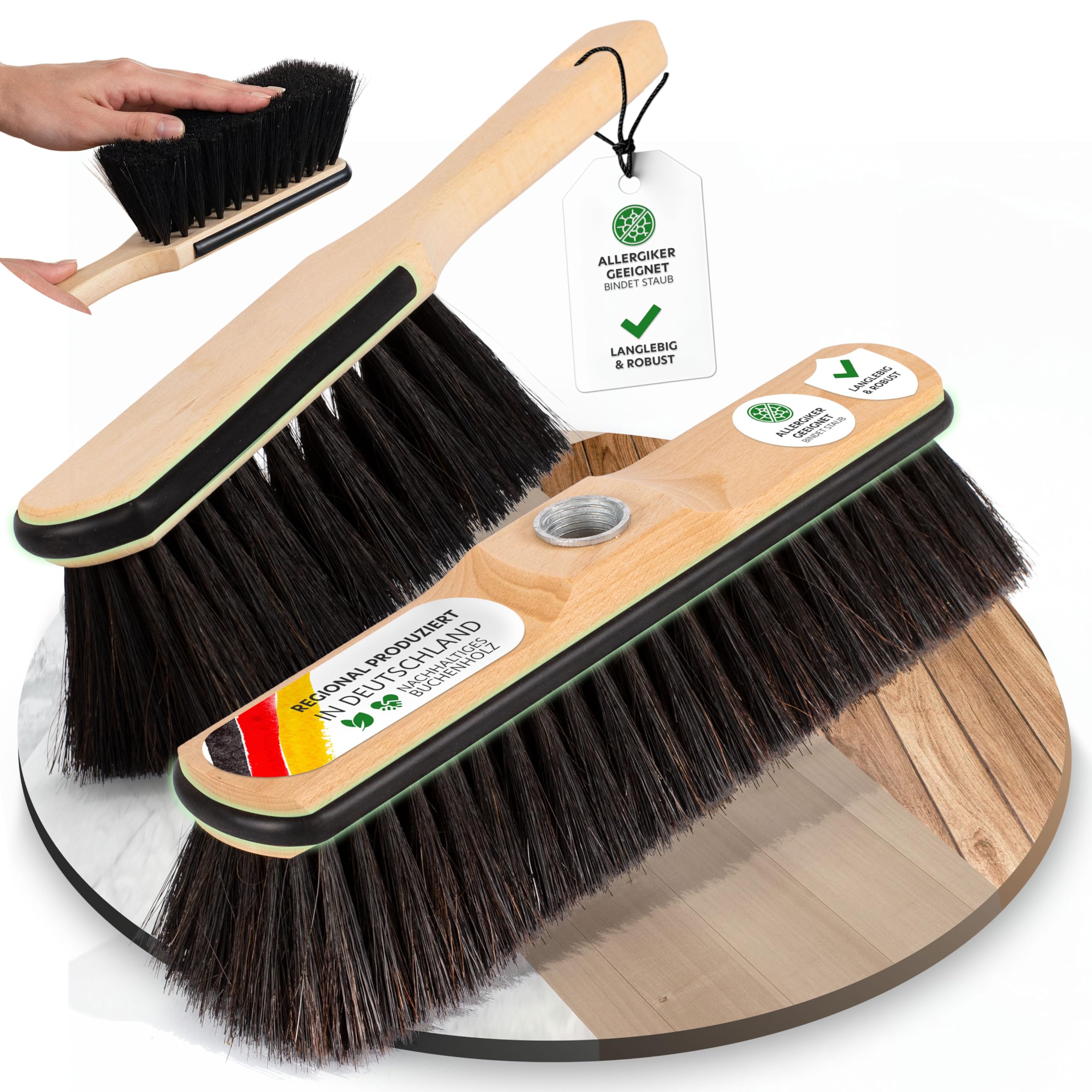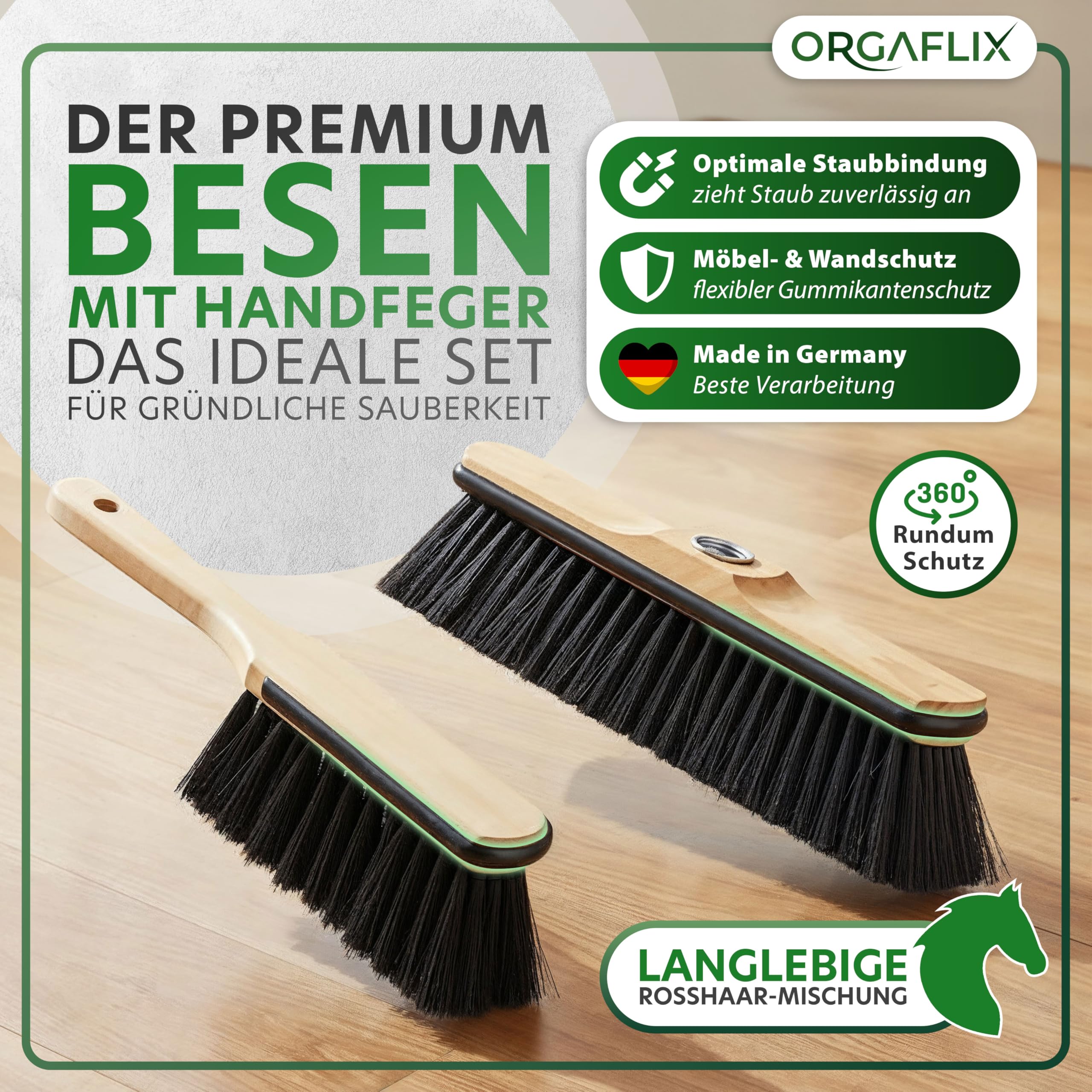 ORGAFLIX Premium Besen mit Handfeger ohne Stiel mit Kantenschutz, extra staubbindend durch hochwertige Rosshaarmischung, Zimmerbesen, Kehrbesen ohne Besenstiel, Rosshaarbesen, Made in Germany