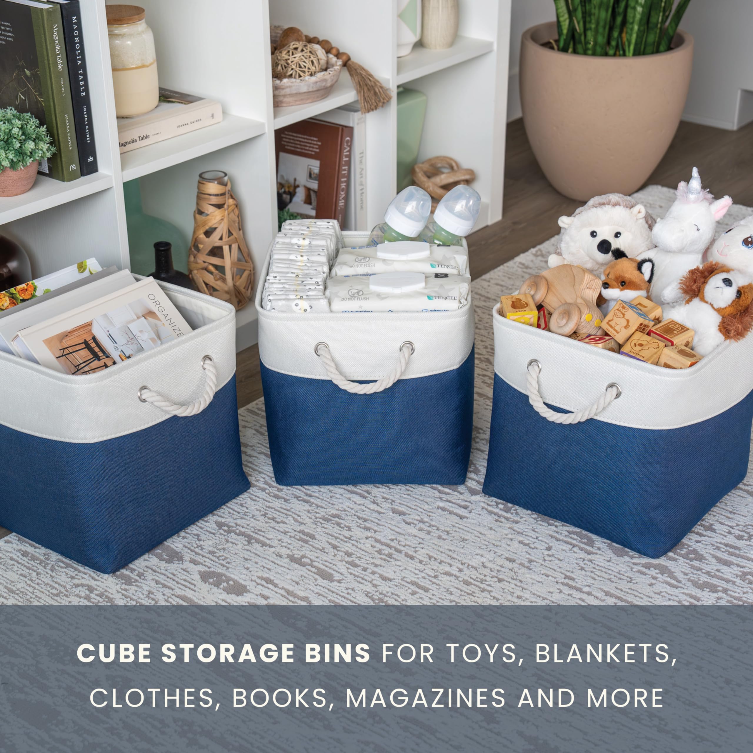 Mehrzweck-Würfel-Aufbewahrungsbehälter – eine clevere Wahl, um Ihr Leben ordentlich und organisiert zu halten. Diese Aufbewahrungsbehälter für Regale und Schränke können für Kleidung, Kinderspielzeug, Kinderzimmerartikel, zusätzliche Bettwäsche, Wäsche, Handtücher, Bettlaken und perfekt für Ihren Kallax verwendet werden Cube-Aufbewahrungseinheit. Dekorativer Stoff und Seilgriff – Diese vielseitigen Aufbewahrungskörbe zur Organisation Ihres Alltags sind aus dickem, hochwertigem Stoff gefertigt und mit Seilgriffen ausgestattet, um einem Wohnzimmer, Schlafzimmer, Büro oder persönlichen Raum eine stilvolle Note zu verleihen. Stilvolle, vielseitige und praktische Würfelkörbe – Wir bieten OrganiHaus-Aufbewahrungswürfel aus Stoff in verschiedenen Farben an, die zu Ihrem Raum passen, Bündel für die richtige Menge an Stauraum und Grössen, um sicherzustellen, dass Sie Dinge einfach dort aufbewahren können, wo Sie sie am meisten brauchen. Minimieren Sie die Unordnung im Alltag – Wenn Sie unsere würfelförmigen Aufbewahrungskörbe für Schränke und Regale in Ihr Zuhause integrieren, können Sie die Anzahl der von Ihrer Familie weggelassenen Dinge reduzieren und wertvollen Platz sparen, sodass Sie weniger Zeit mit dem Aufräumen verbringen müssen. Tragbares und langlebiges Design – Wir wissen, dass es in Ihrem Leben hektisch und unordentlich zugeht. Deshalb verfügen die OrganiHaus-Aufbewahrungswürfel für Regale und Schrankaufbewahrungsbehälter über einen Metallrahmen, um die Stabilität zu gewährleisten, sind platzsparend zusammenklappbar und verfügen über Griffe zum einfachen Tragen.