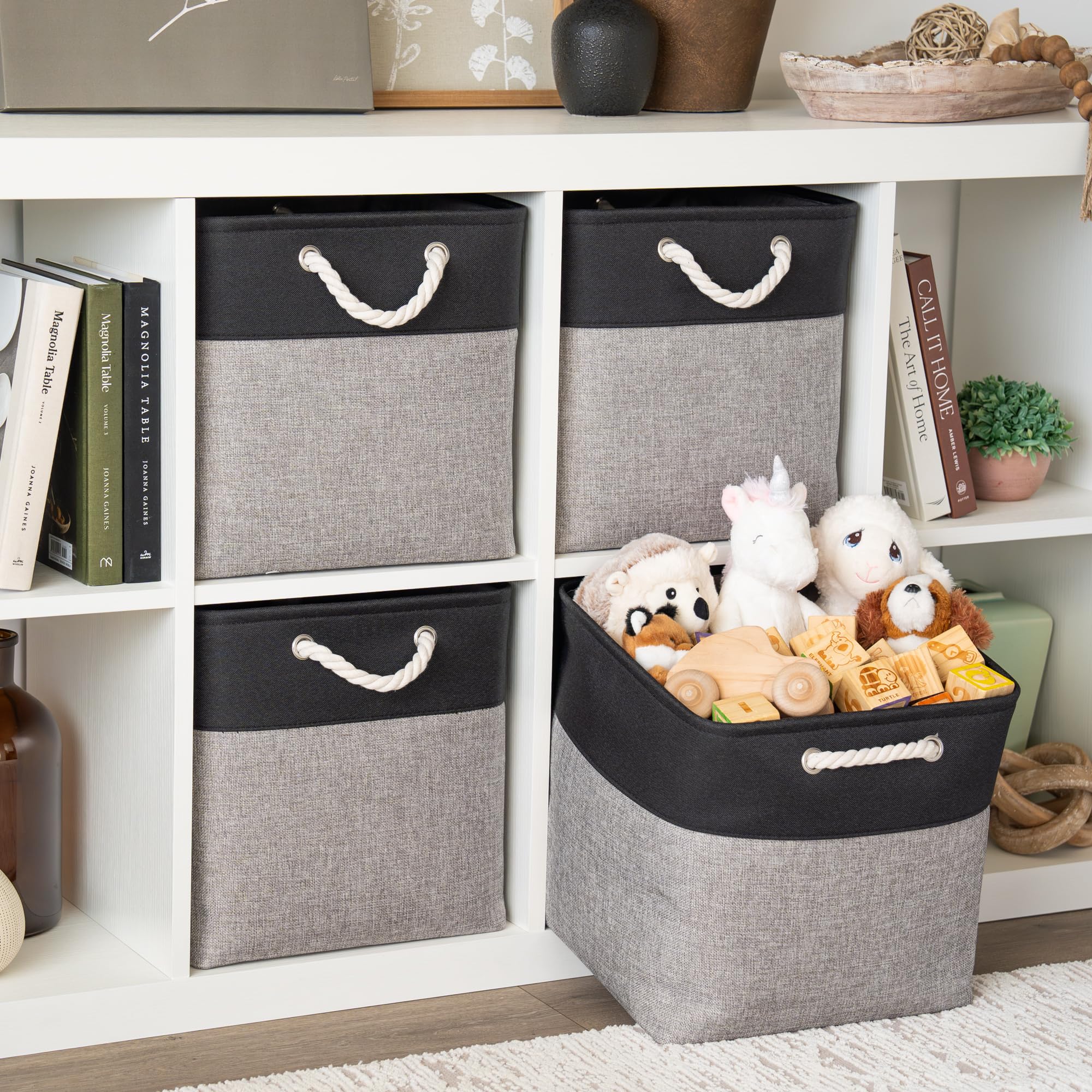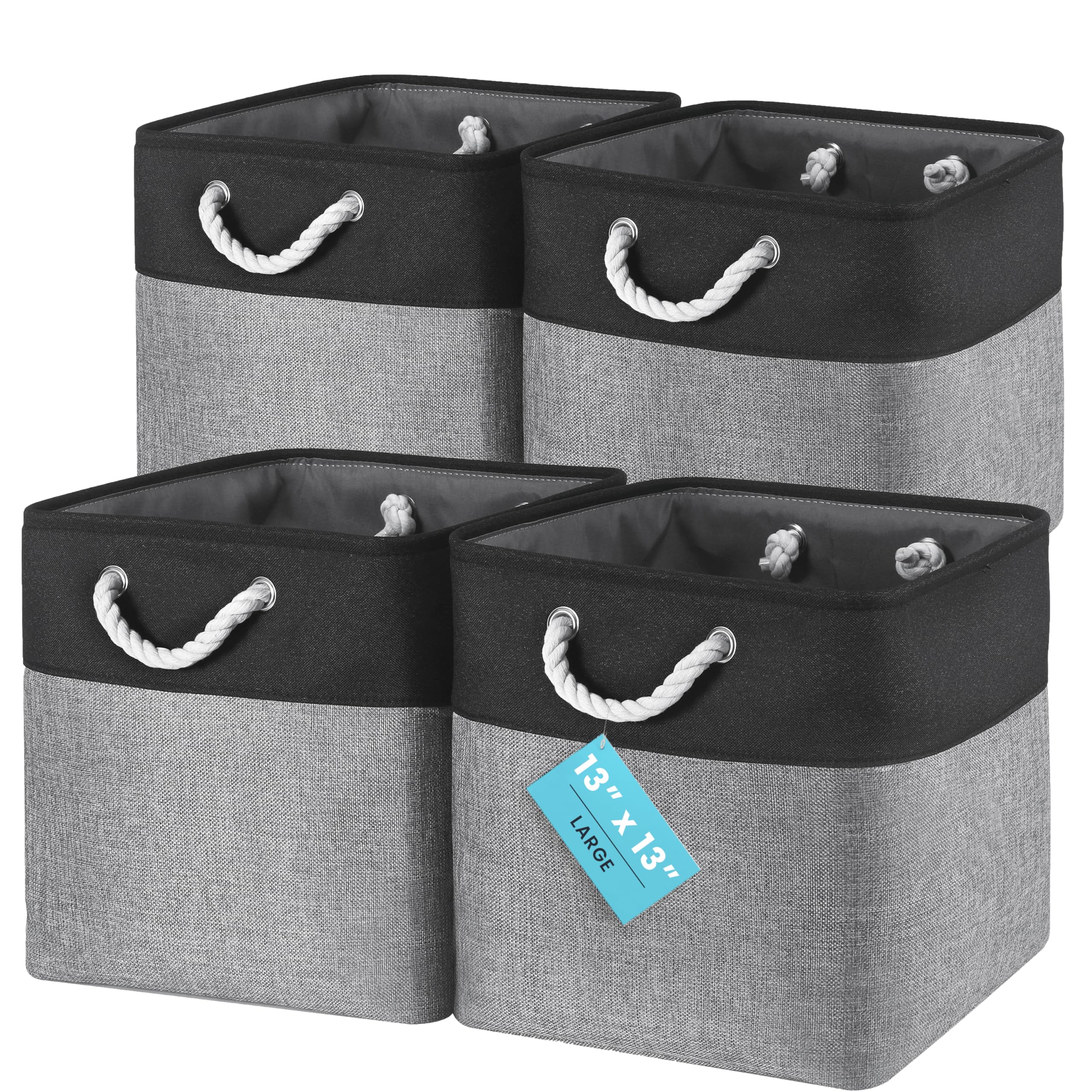 OrganiHaus Aufbewahrungsbox 33x33cm 4er-Set, Würfelkörbe aus Stoff mit Seilgriffen, Faltbare Aufbewahrungswürfel für Kallax Organizer, Ablagekörbe für das Kinderzimmer Grau schwarz