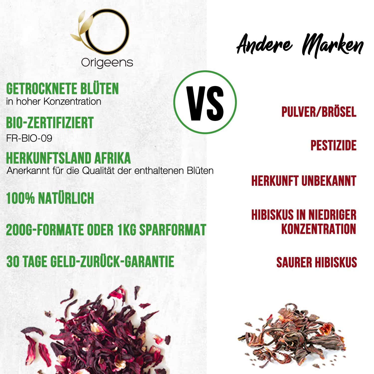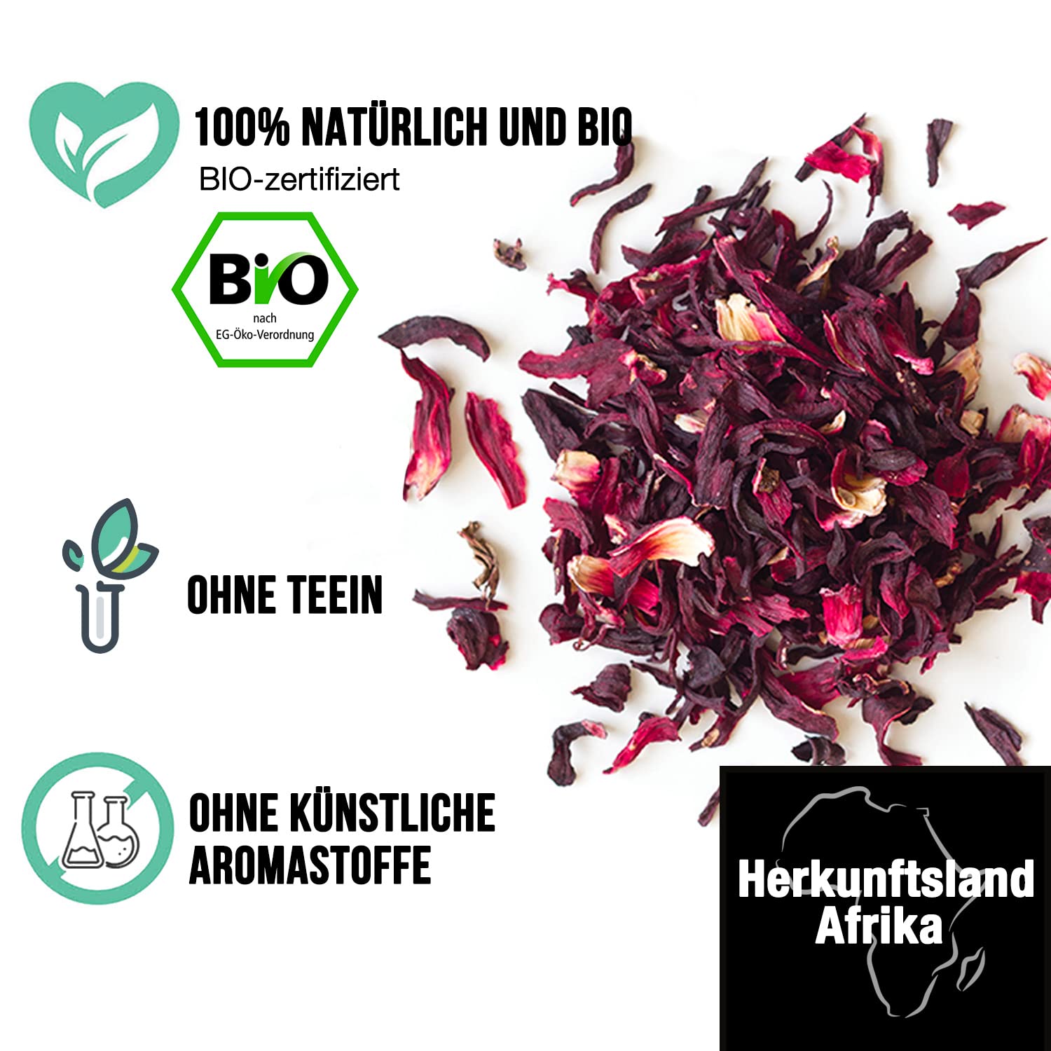 • ???? PREMIUM QUALITÄT - Unsere Hibiskusblüten werden von Hand geerntet, mehrere Tage lang auf natürliche Weise in der Sonne getrocknet und anschliessend sorgfältig sortiert. Dieser langwierige und aufwendige Prozess mit mehr als vier aufeinanderfolgenden Sortiervorgängen garantiert einen Hibiskus von aussergewöhnlicher Reinheit, leuchtender Farbe und zart-säuerlichem Geschmack
