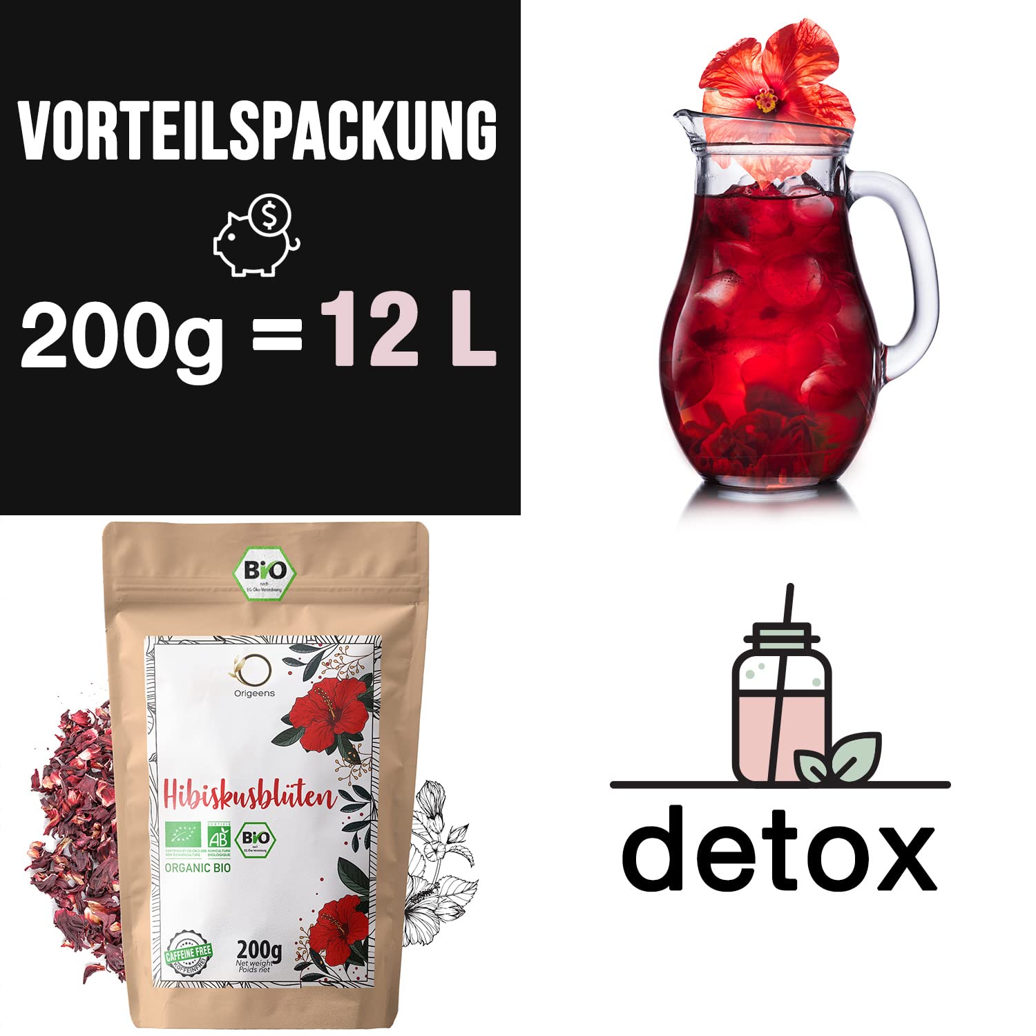 ORIGEENS HIBISKUSTEE BIO 200g Premiumqualität | Hibiskusblüten getrocknet für Tee, Früchtetee, Eistee, Karkade tee | Hibiskus Tee für Drainage Detox-Kur