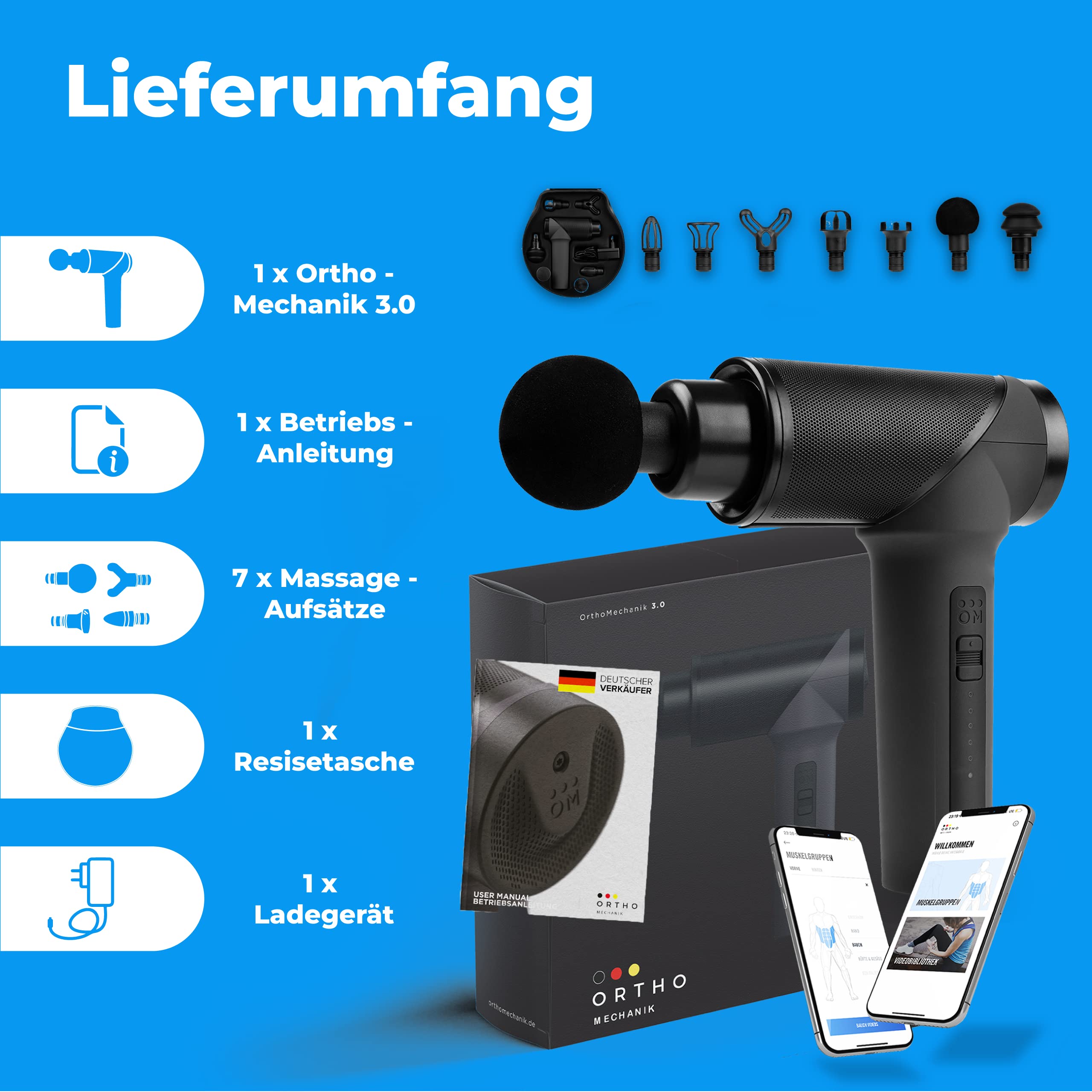 OrthoMechanik® 3.0 | OrthoGun | Hochwertige Massagepistole mit App & 7 Aufsätzen I inkl. Koffer | 160W Motor & 5 Intensitäten für Schmerzlinderung & Entspannung I Bis zu 360 Min. Laufzeit