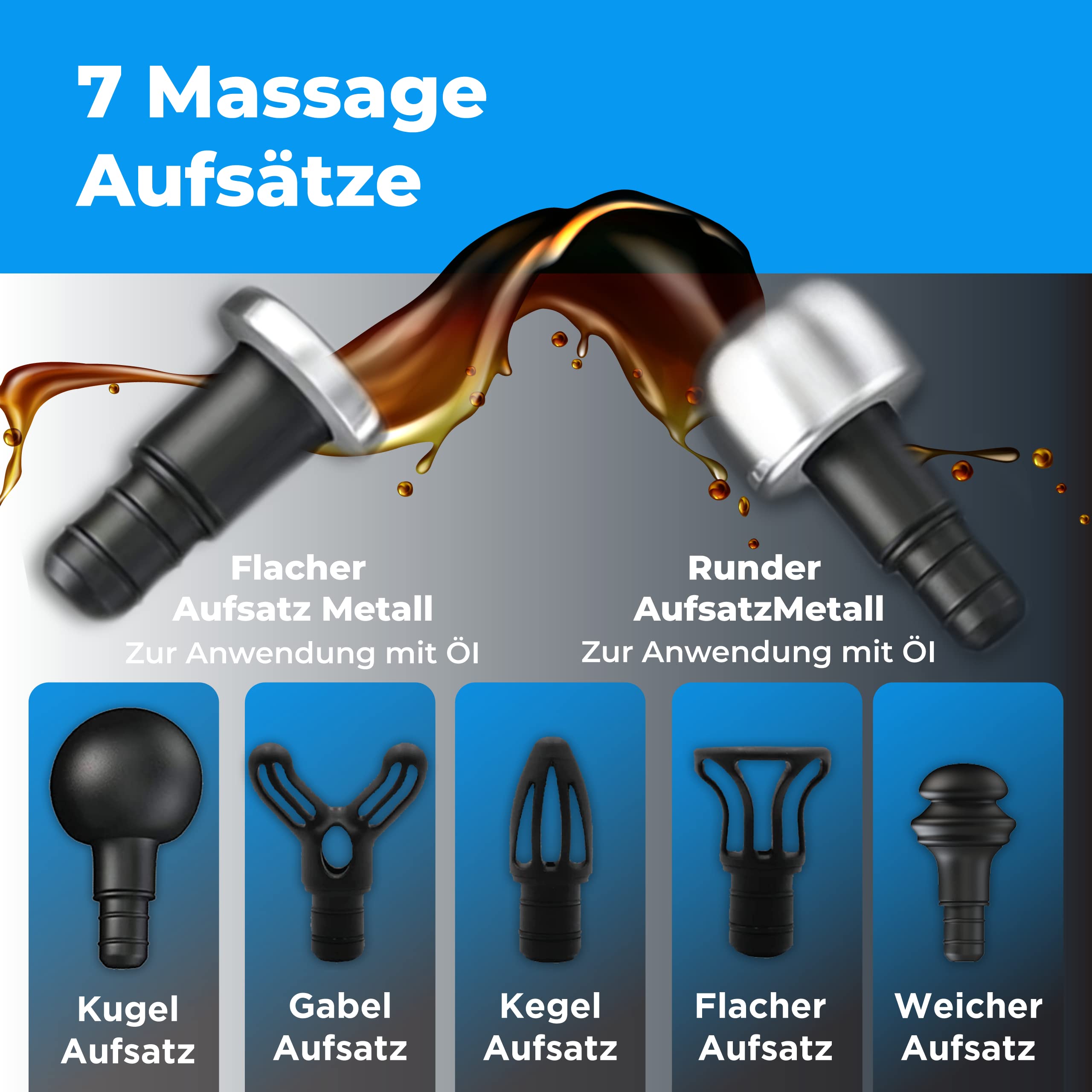 - ???? 7 Aufsätze, davon 2 Metallaufsätze, welche leicht zu reinigen und zur hygienischen Wiederverwendung, auch mit Massageölen geeignet sind. Durch das schnelle Aufladen der Faszien Pistole, ist deine Orthogun innerhalb von 30 Minuten wieder einsatzbereit.