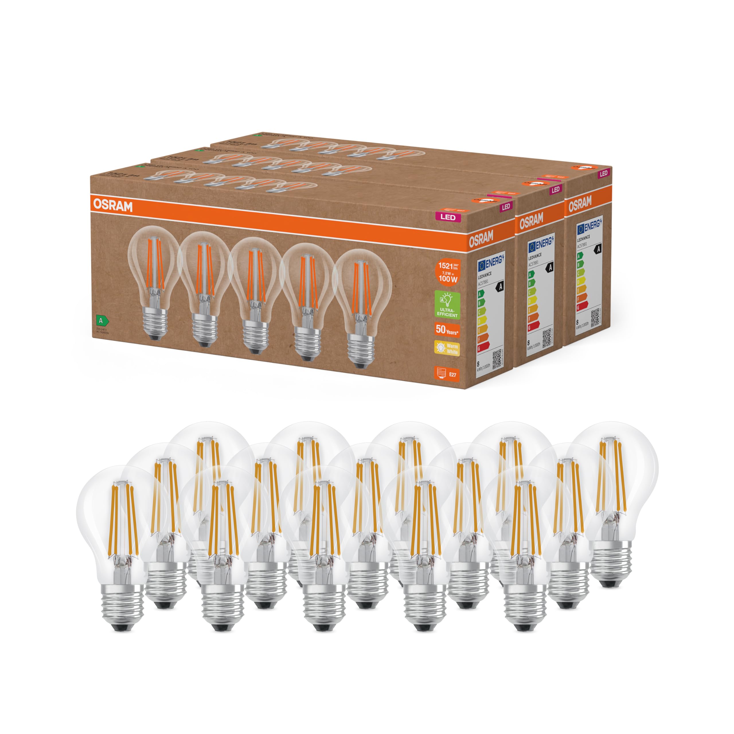 Osram Hocheffiziente LED Lampen mit Energieeffizienz Klasse A, Vorteilspack mit 15 Leuchtmittel, ersetzt herkömmliche 100W Glühbirnen, warmweiss(2700K), E27, Filament Glas