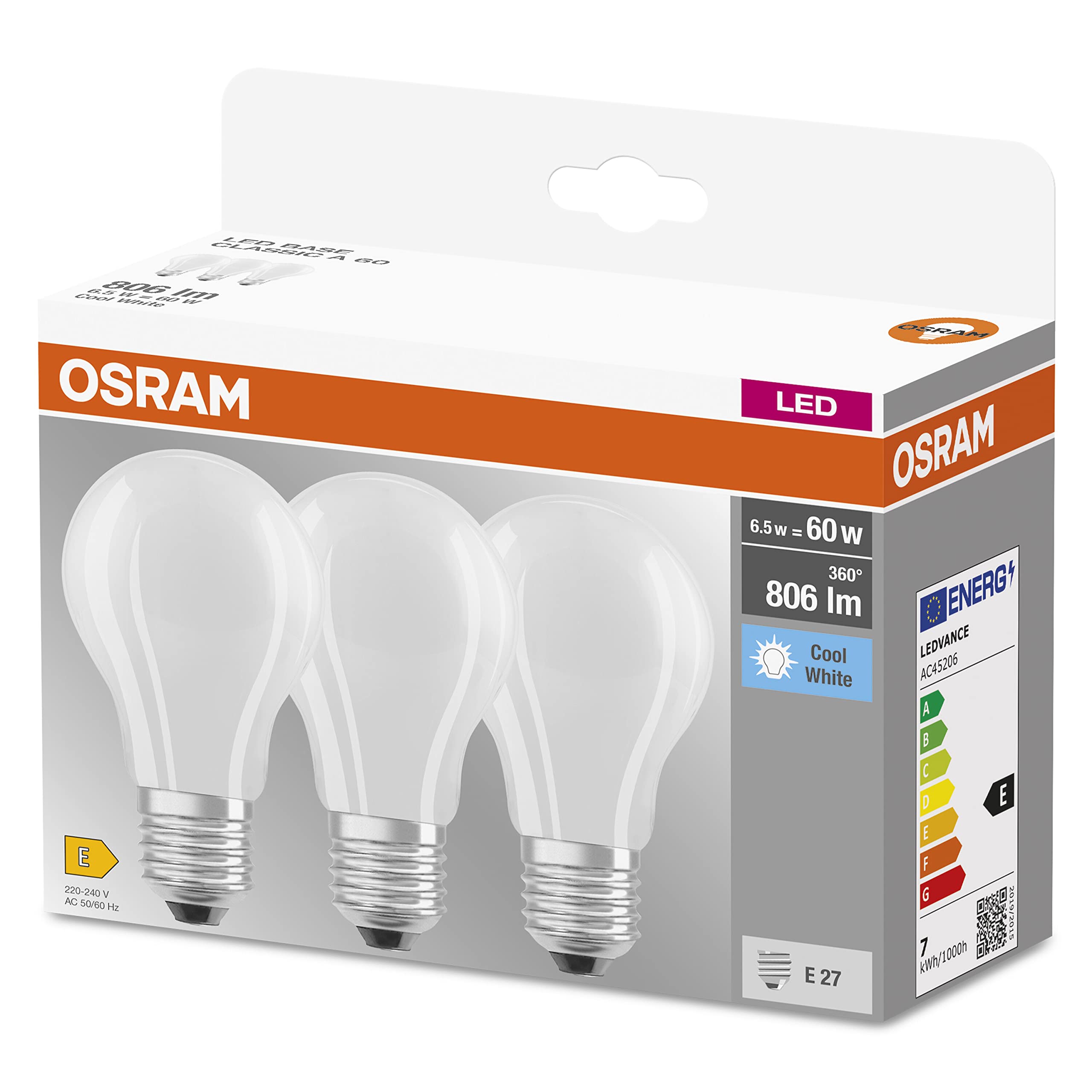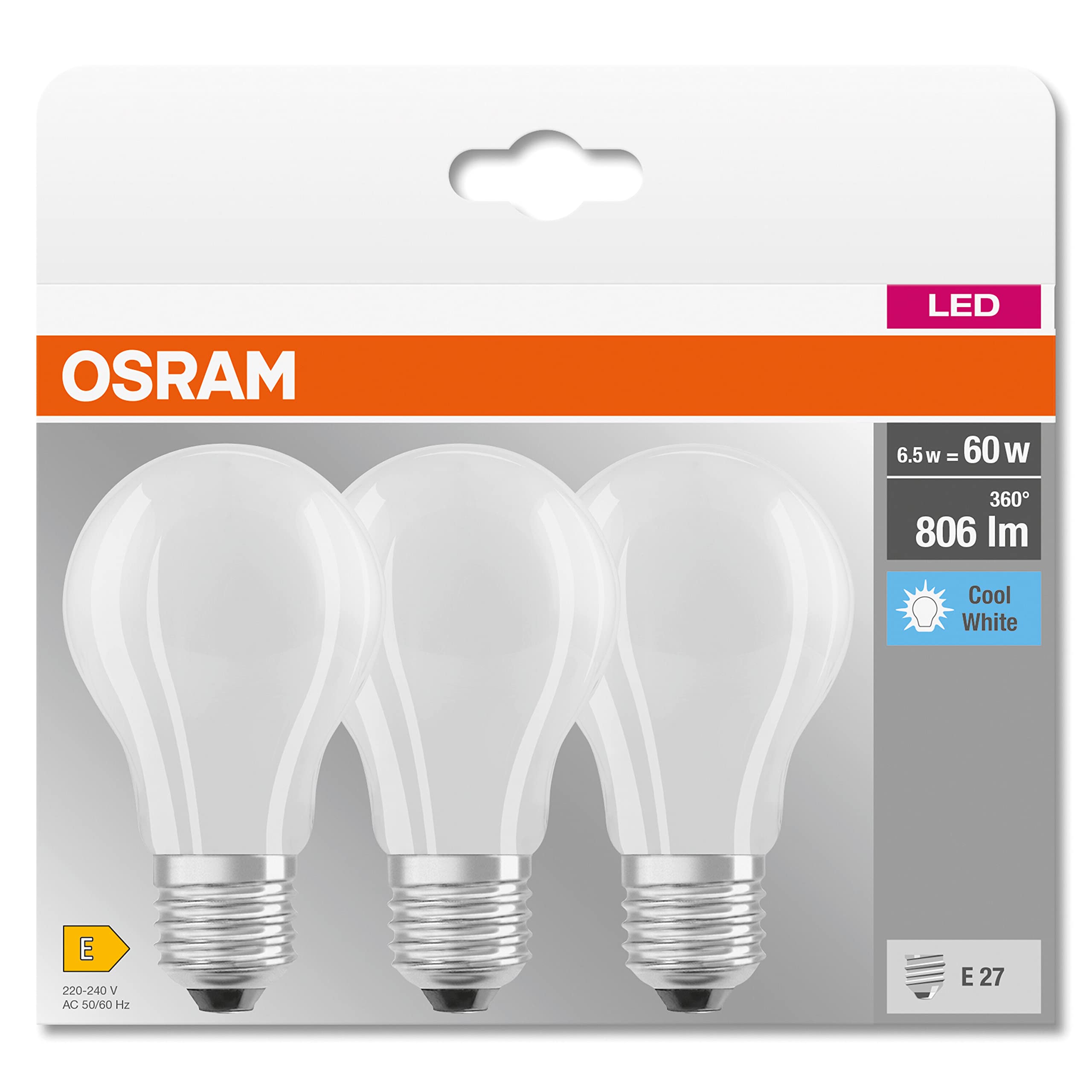 Osram LED BASE Classic A60, matte Filament LED-Lampen aus Glas für E27 Sockel, Birnenform, Kaltweiss (4000K), 806 Lumen, Ersatz für herkömmliche 60W-Glühbirnen, 3er-Box
