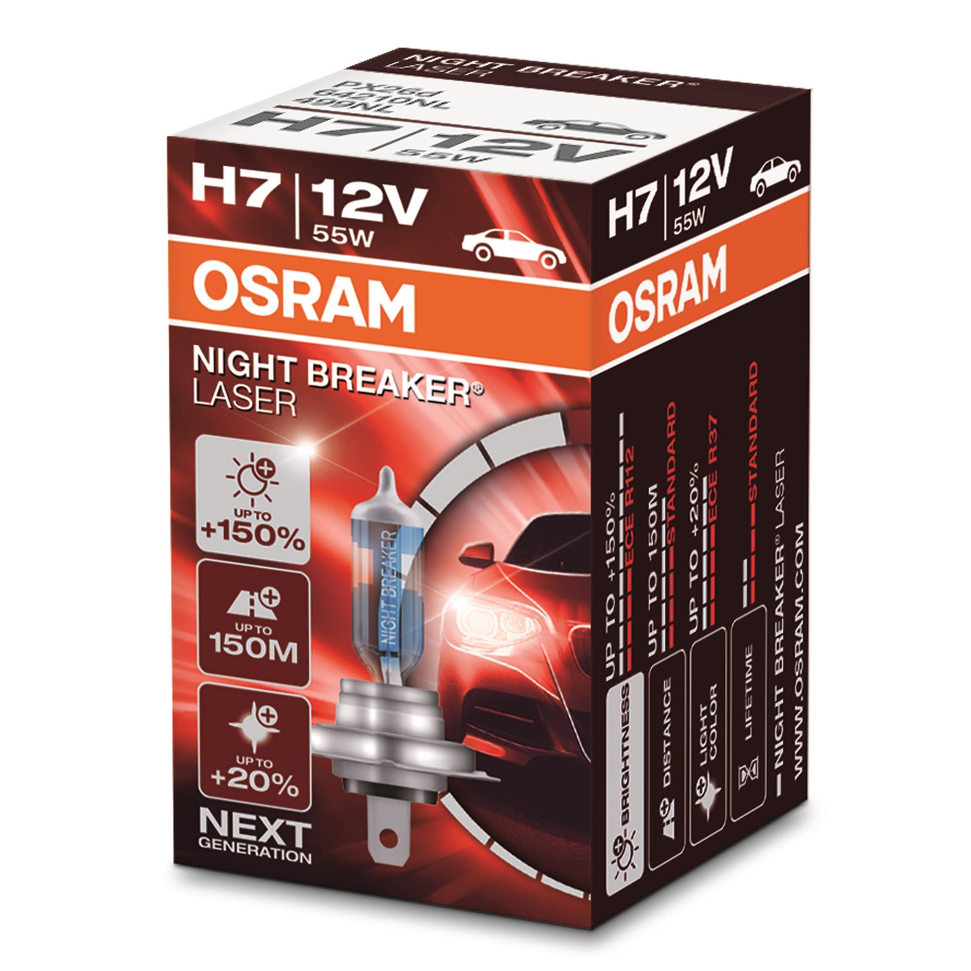Dank innovativer Laserablationstechnologie leuchten NIGHT BREAKER LASER Scheinwerferlampen im Vergleich zu den gesetzlichen Mindestanforderungen um bis zu 150% heller. Das hochentwickelte Filament sorgt für einen zusätzlichen Lichtschub. Damit erzielen die Lampen einen bis zu 150m langen Lichtkegel und ein bis zu 20% weisseres Licht im Vergleich zu den gesetzlichen Mindestanforderungen. Mehr Licht und bessere Sicht können Fahrer dabei unterstützen, Verkehrsgefahren schneller zu erkennen und darauf zu reagieren. Darüber hinaus besticht die OSRAM NIGHT BREAKER LASER durch einzigartiges Design (lasergravierter Produktname) und ein komplettes Portfolio (H1, H3, H4, H7, H8, H11, HB3, HB4).