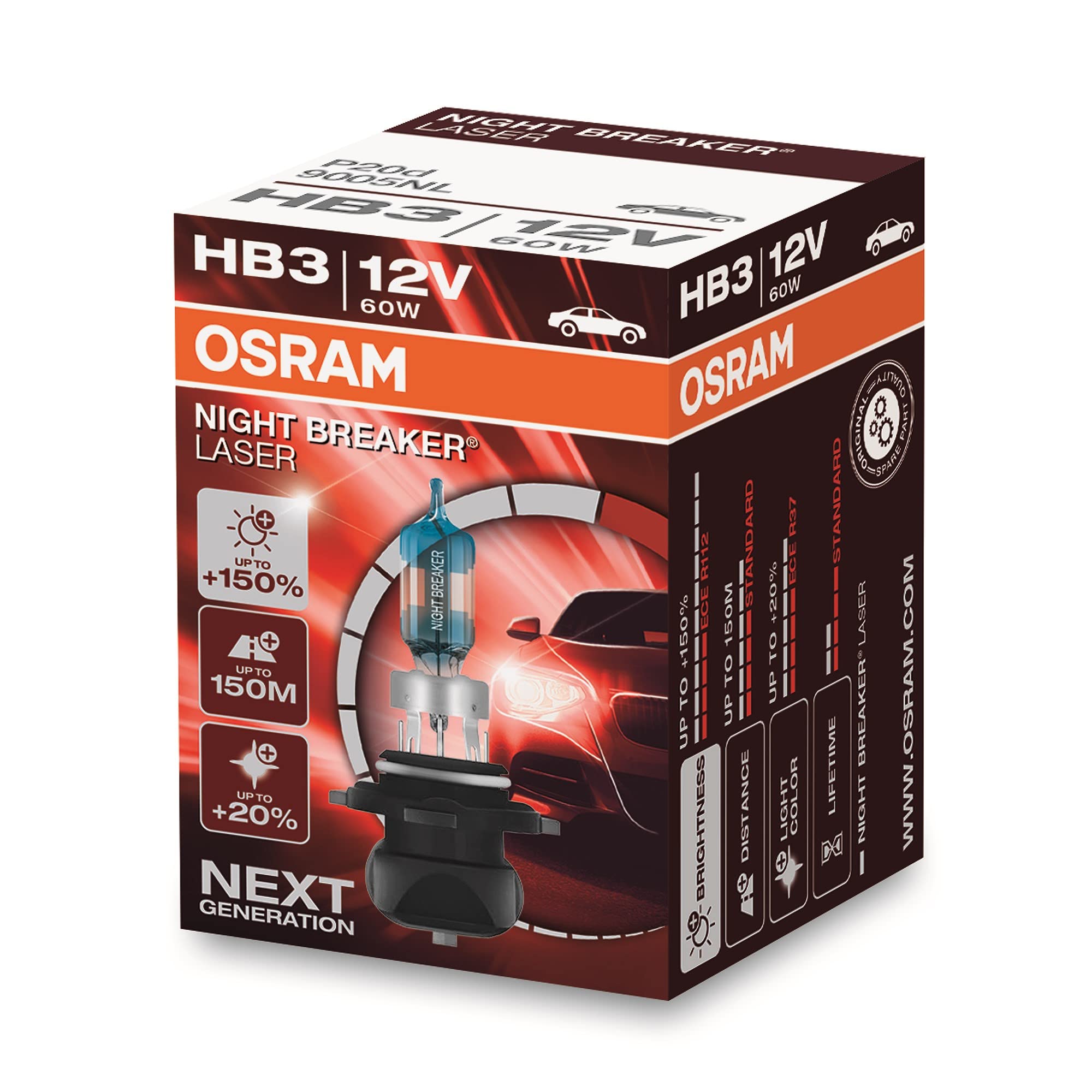 Osram NIGHT BREAKER LASER HB3, +150% mehr Helligkeit, Halogen-Scheinwerferlampe, 9005NL, 12V PKW, Faltschachtel (1 Lampe)