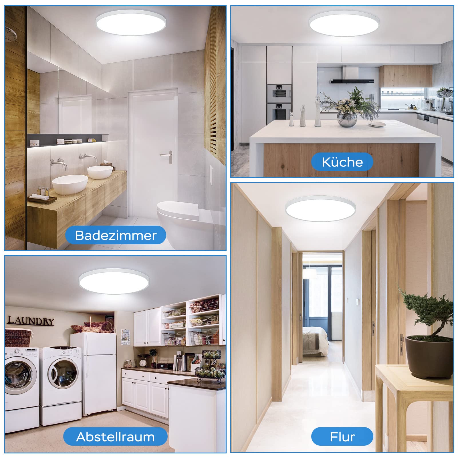 OUILA LED Deckenleuchte 24W-2400LM-6500K 1.LED deckenlampe spart deutlich Energie Ersetzen Sie Ihre 200W Glühbirnen durch unsere 24 Watt LED deckenleuchte und sparen Sie 90% Ihrer Stromrechnung. Die ultralange Lebensdauer von 25000 Stunden reduziert die Häufigkeit und die Kosten des Lampenwechsels. 2.Das Licht ist gleichmässig und hell 2400LM Lichtleistung, hell genug Licht, perfekt für einen Raum von 9 - 20 m² 3.Blendschutz Nehmen Sie eine hochwertige und besser lichtdurchlässige weisse Schale flaches Design an, verbessern Sie gleichzeitig helleres Licht, keine Blendung oder Flimmern, schützen Sie Ihre Augen und die Ihrer Familie. Elegantes Design passend für verschiedene Beleuchtungsstile. 4.Hoher Farbwiedergabeindex Haben Sie einen hohen Farbwiedergabeindex von CRI80+, bringen Sie das Licht näher an die echte und ursprüngliche Farbe des Objekts und schützen Sie die Augen besser. 5.wasserdicht Deckenleuchte Schutzart IP44, lässt Sie entspannt die Leuchte im Badezimmer verwenden Es kann auch Staub und Mücken verhindern, es sauber und schön halten und muss nicht häufig gereinigt werden. 6.Einfache Installation Einfache Montage, mit dem mitgelieferten Zubehör können Sie die Deckenleuchte auch ohne Hilfe eines Elektrikers selbst montieren.
