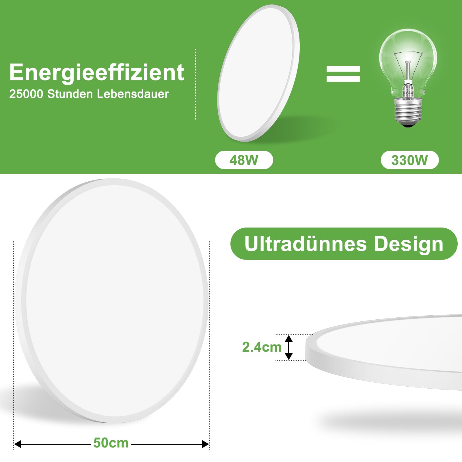 OUILA LED Deckenleuchte Flach Rund - Ø50CM Deckenlampe LED 48W 4000K 4800LM IP44 Wasserdichte Badezimmer Lampe, Küchenlampe Deckenleuchte Neutralweiss für Küche Bad Schlafzimmer Flur Keller