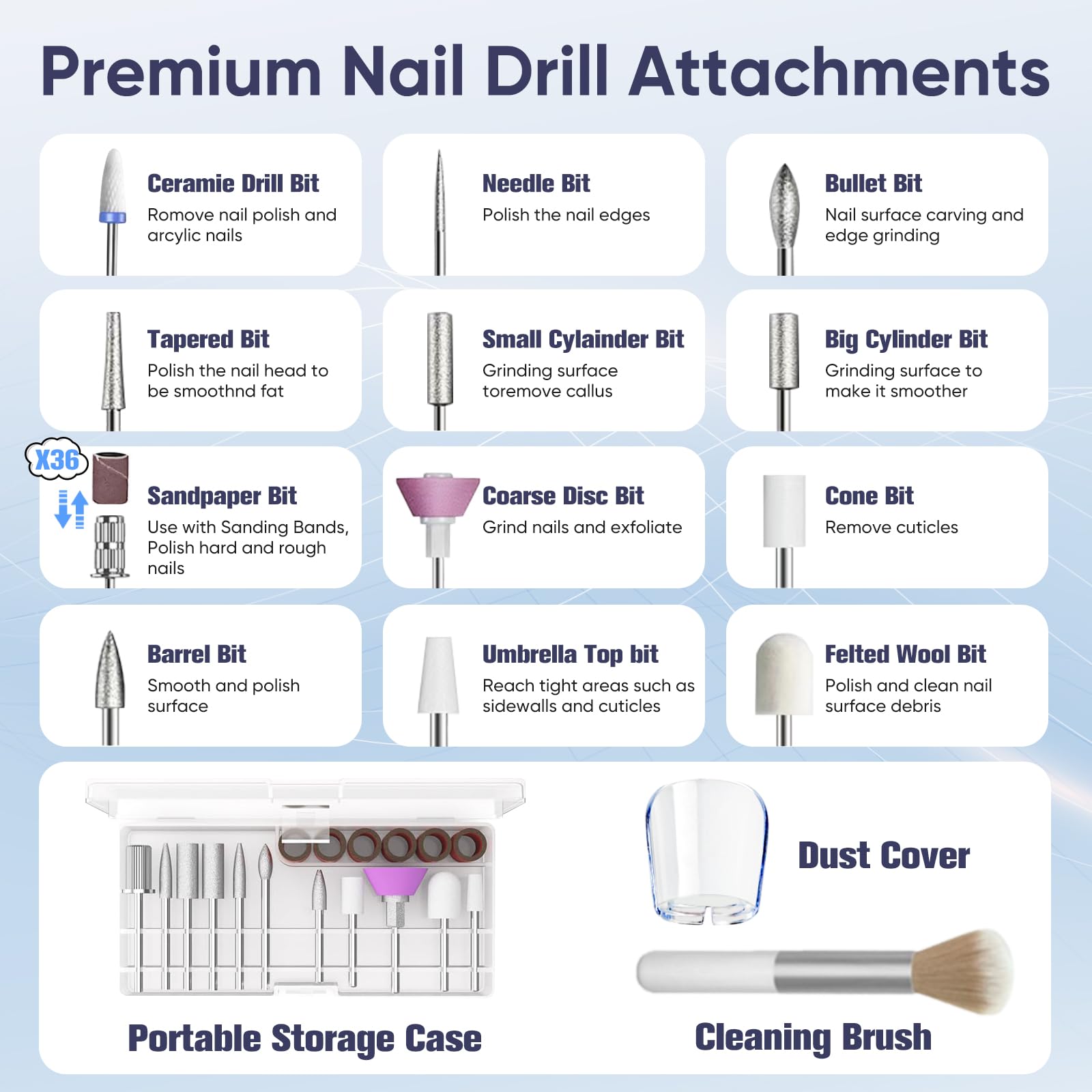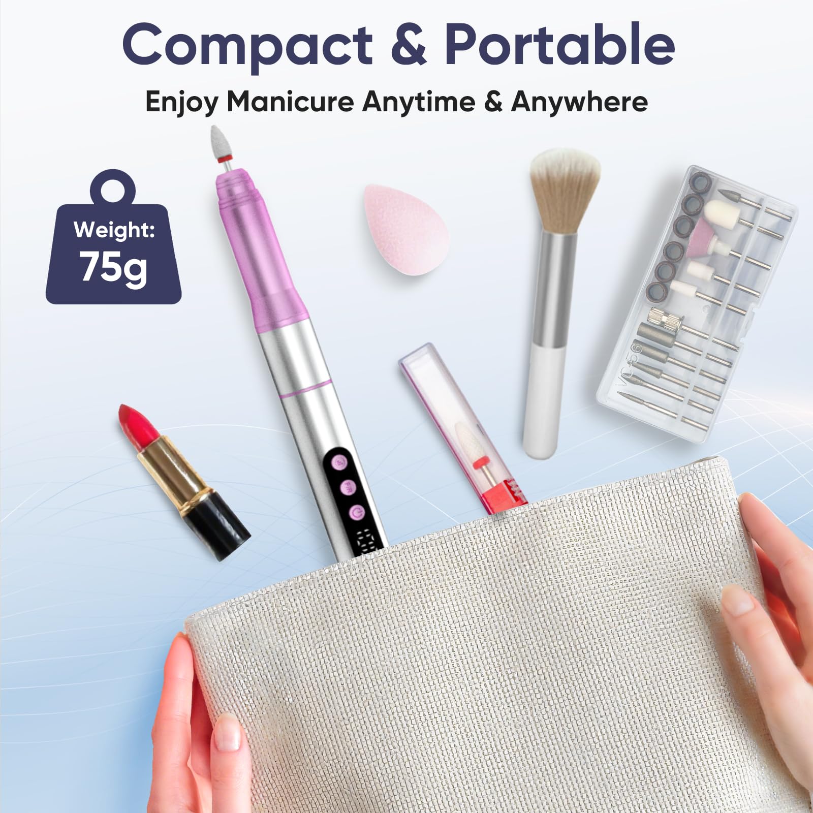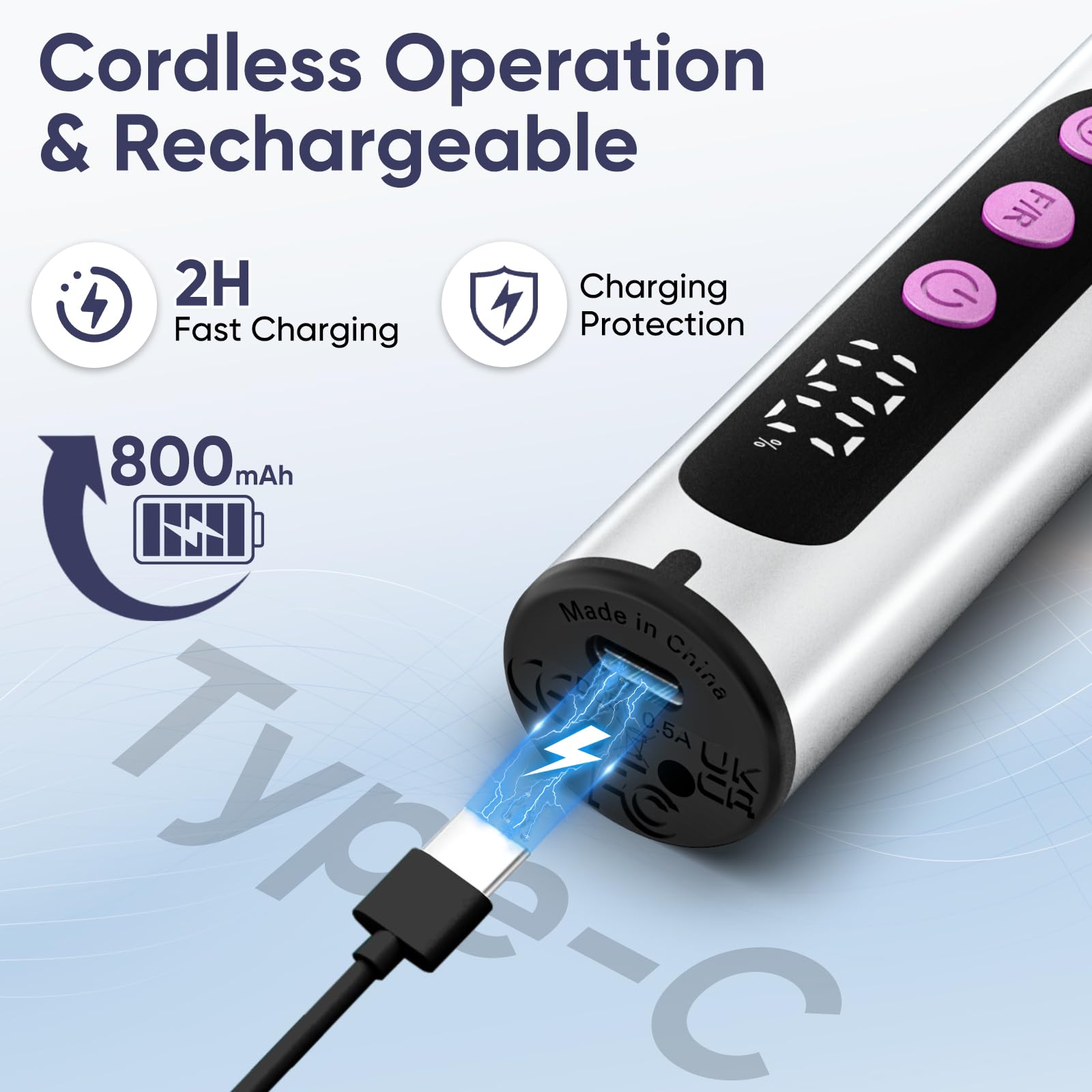 Der Oukzon Nagelfraeser ist eine kabellose elektrische Nagelfeile fuer die Manikuere und Pedikuere. Er eignet sich fuer die Bearbeitung von Gelnaegeln, Acrylnageln und Naturnaegeln und ist sowohl fuer die Heimanwendung als auch fuer den professionellen Einsatz konzipiert.