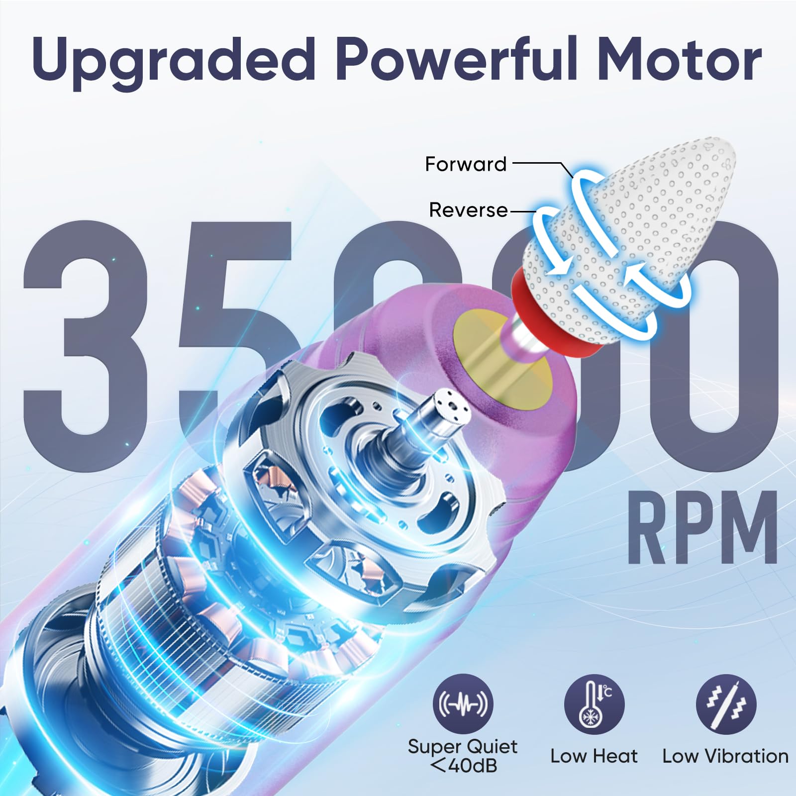Der elektrische Nagelfraeser arbeitet mit einer maximalen Drehzahl von bis zu 35.000 Umdrehungen pro Minute (Herstellerangabe) und bietet fuenf Geschwindigkeitsstufen fuer unterschiedliche Anwendungen. Die einstellbare Drehrichtung ermoeglicht die Nutzung im Vorwaerts- und Rueckwaertslauf und ist damit auch fuer Linkshaender geeignet.
