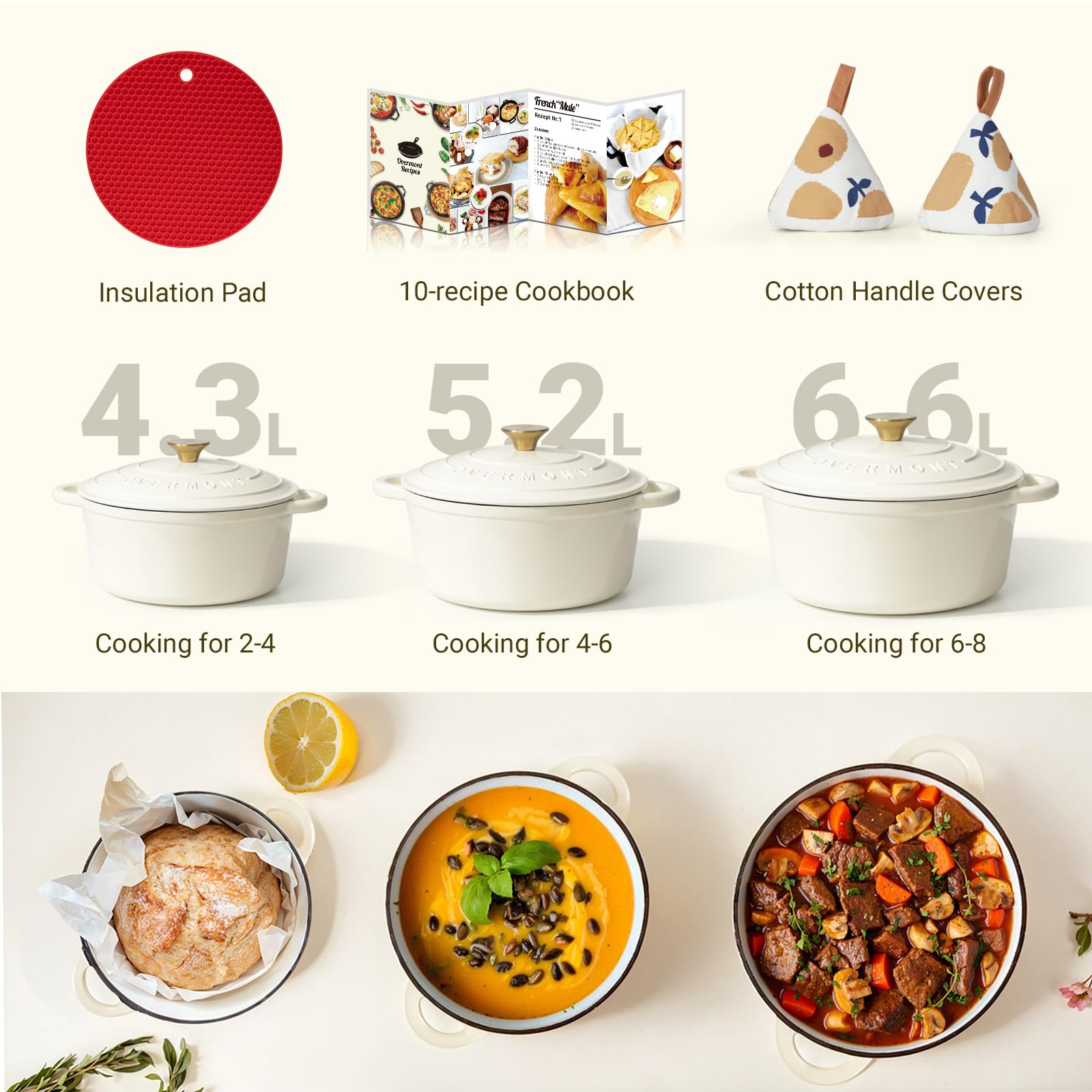 Overmont Bräter Emaille Gusseisen Topf - Schmortopf 26cm backofengeeignet - mit Deckel und Kochbuch - für Küche Backen Schmoren Braten Weiss