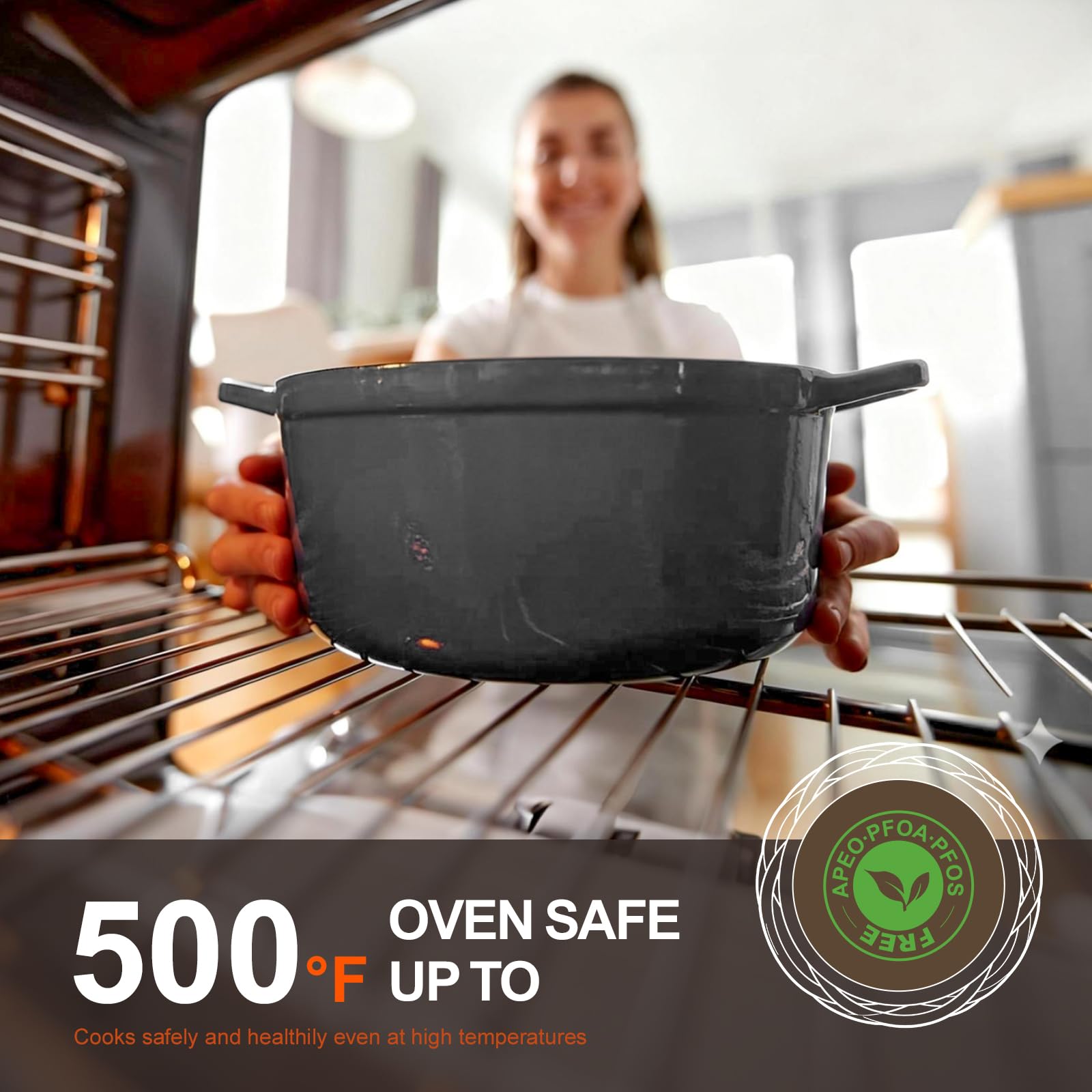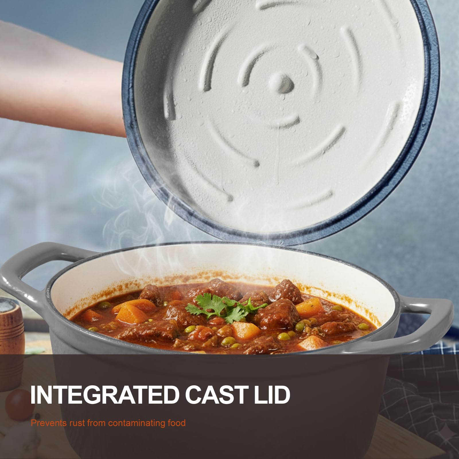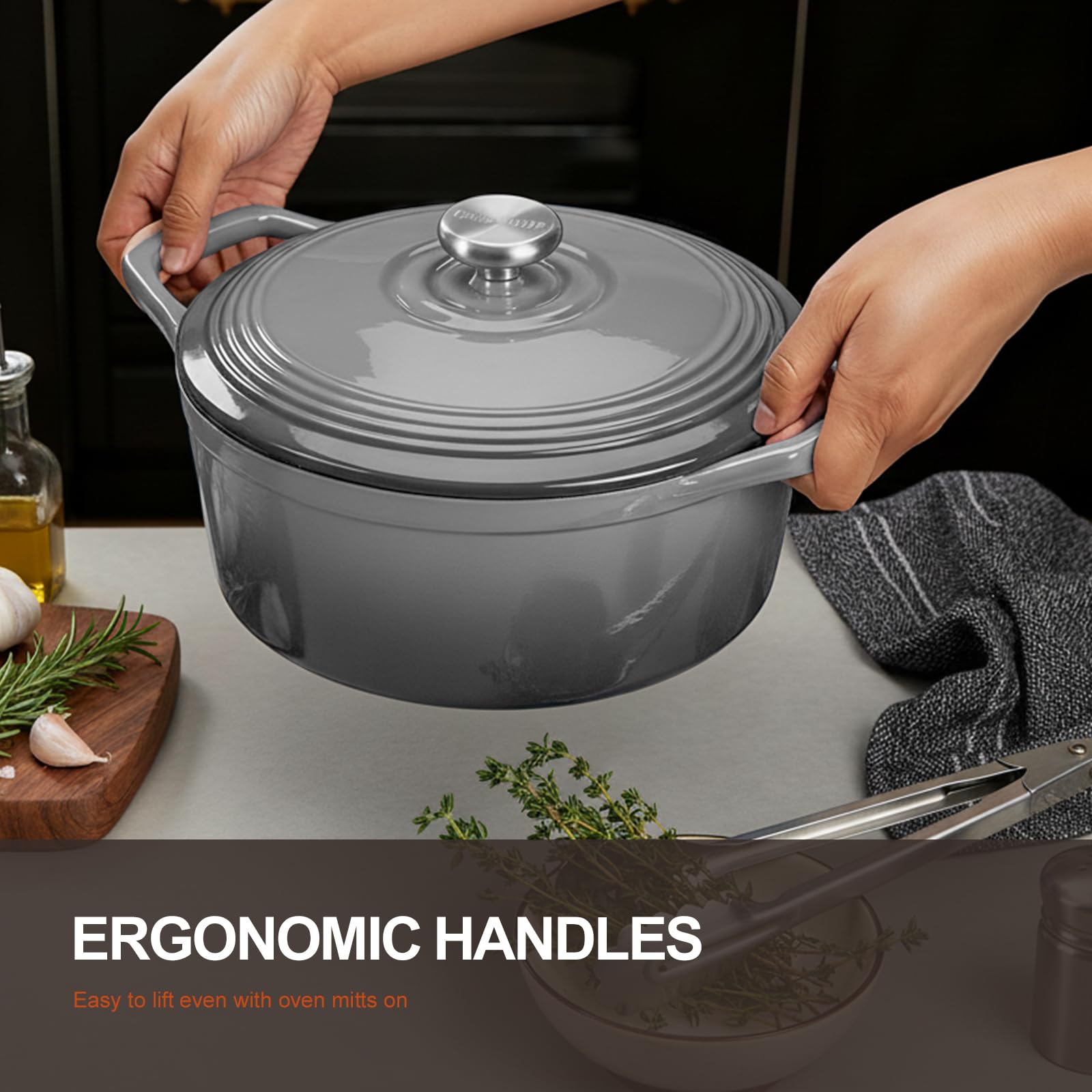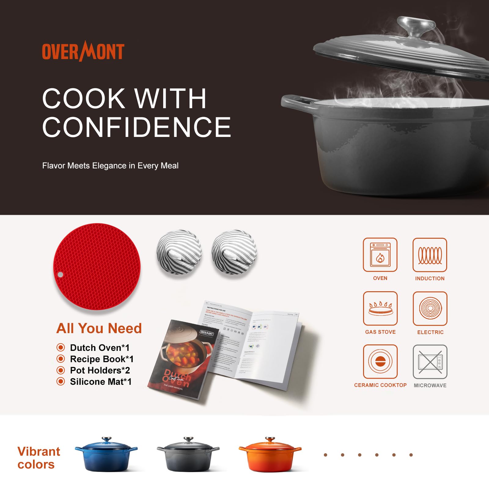 Overmont Bräter Emaille Gusseisen Topf - Schmortopf 26cm backofengeeignet - mit Deckel und Kochbuch - für Küche Backen Schmoren Braten Grau