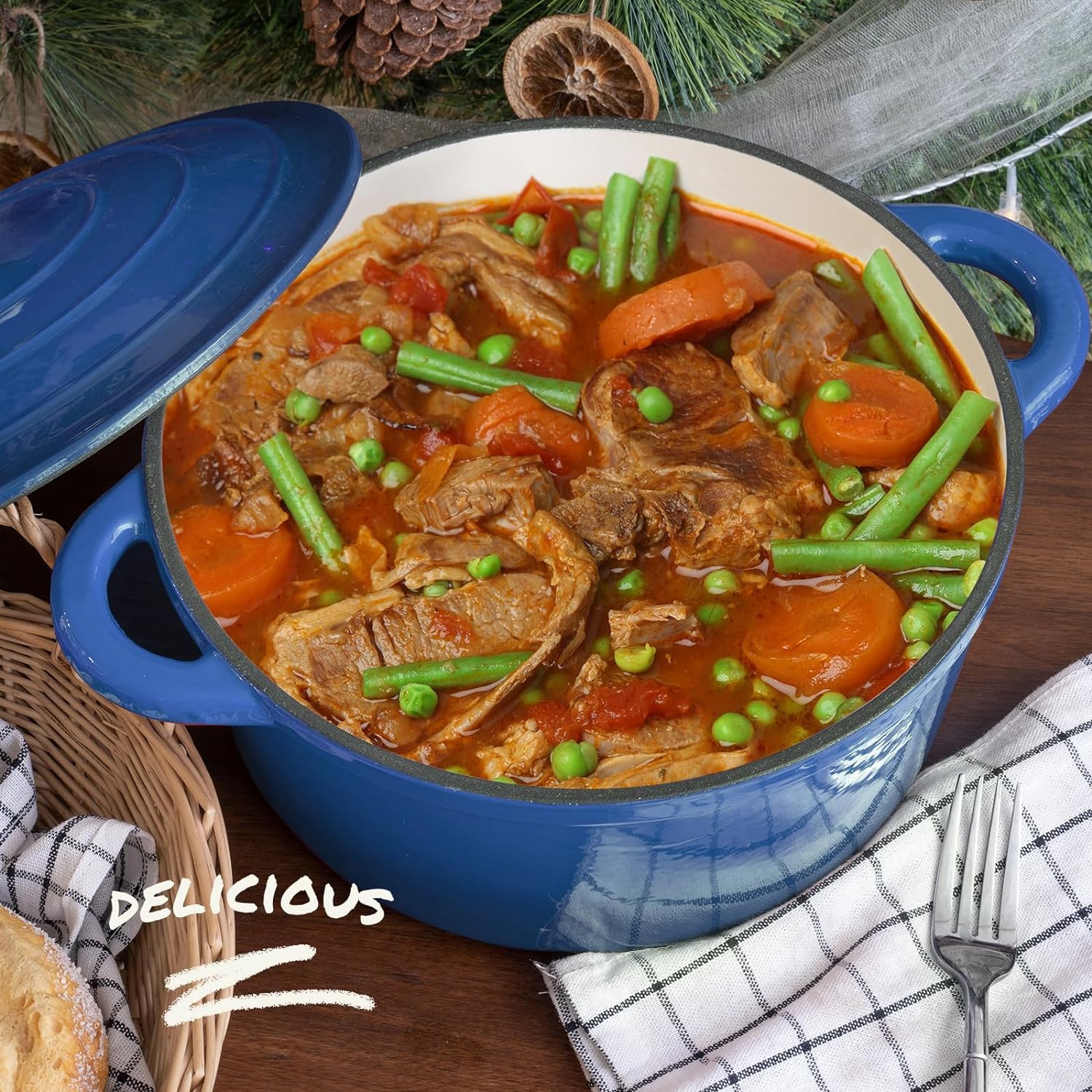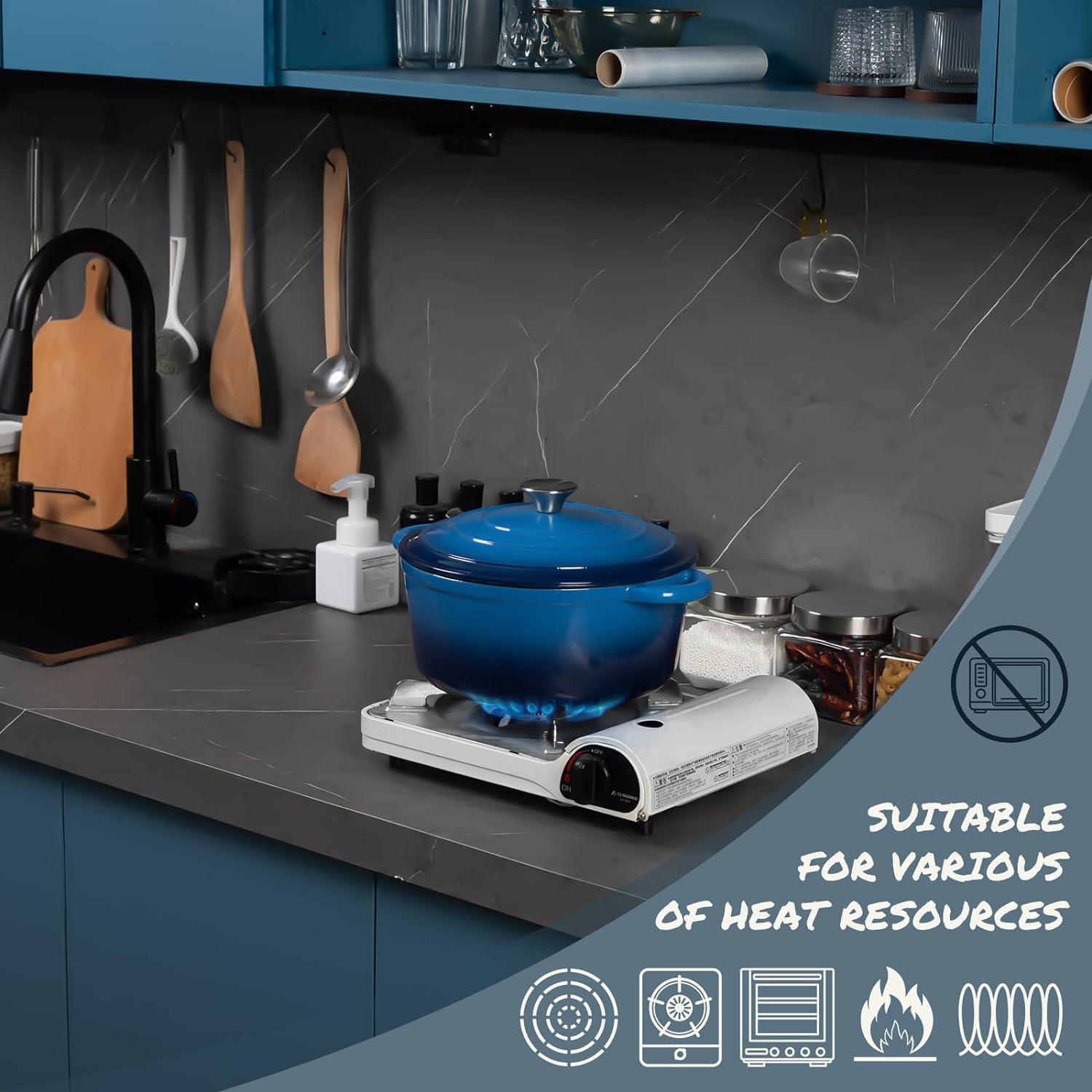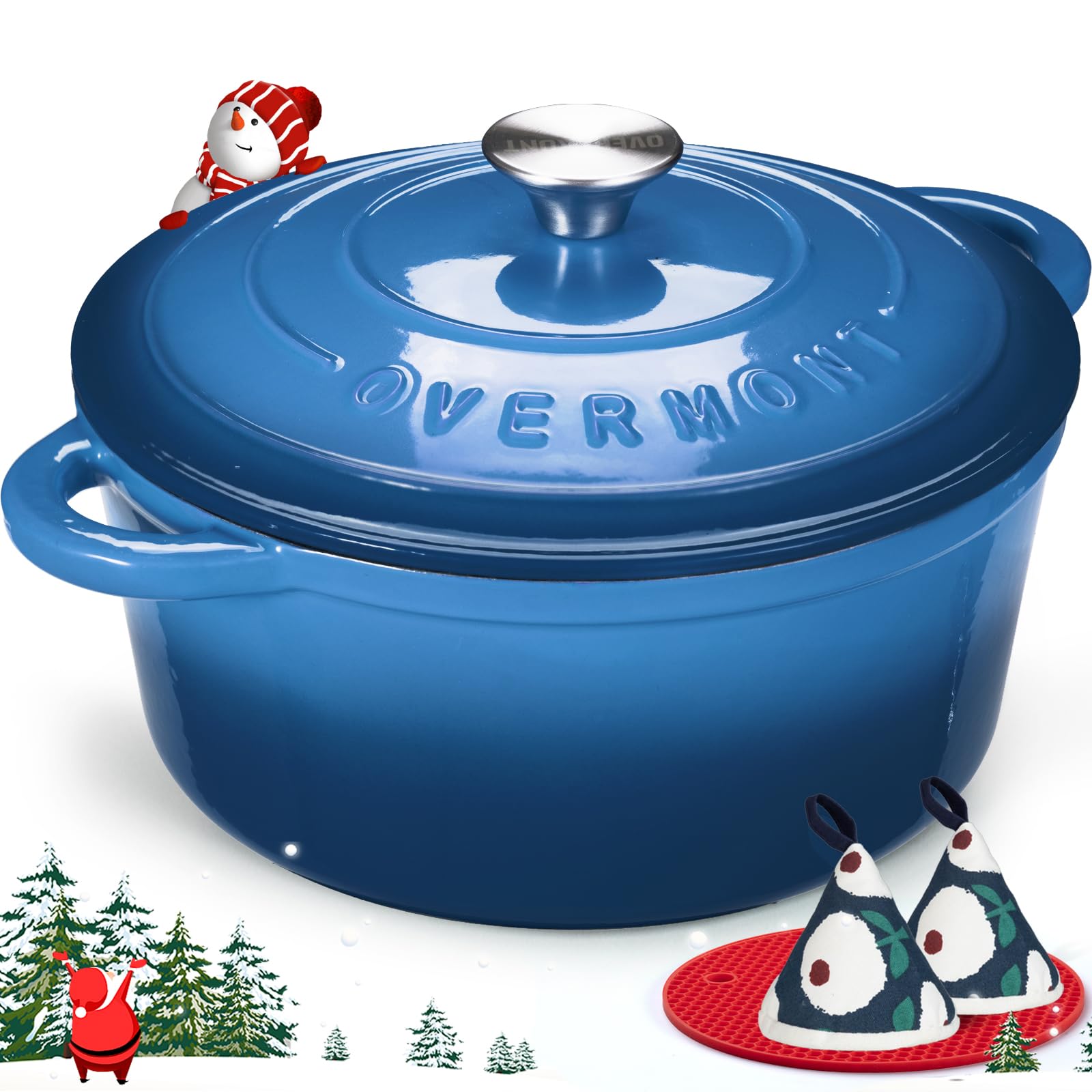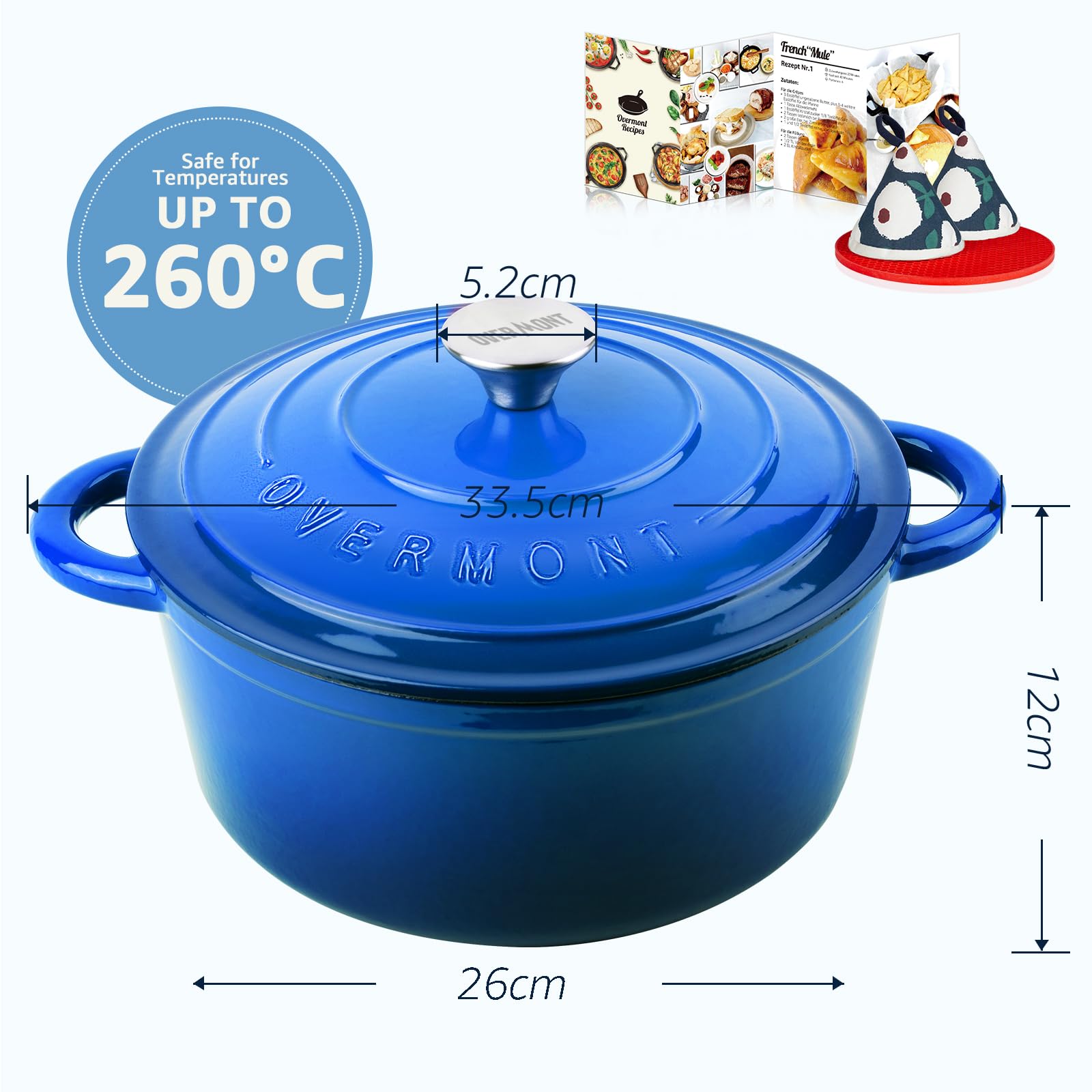 Overmont Schmortopf Gusseisen Topf 26cm - Emaille Bräter mit Deckel backofengeeignet - mit Kochbuch - für Küche Backen Schmoren Braten Blau