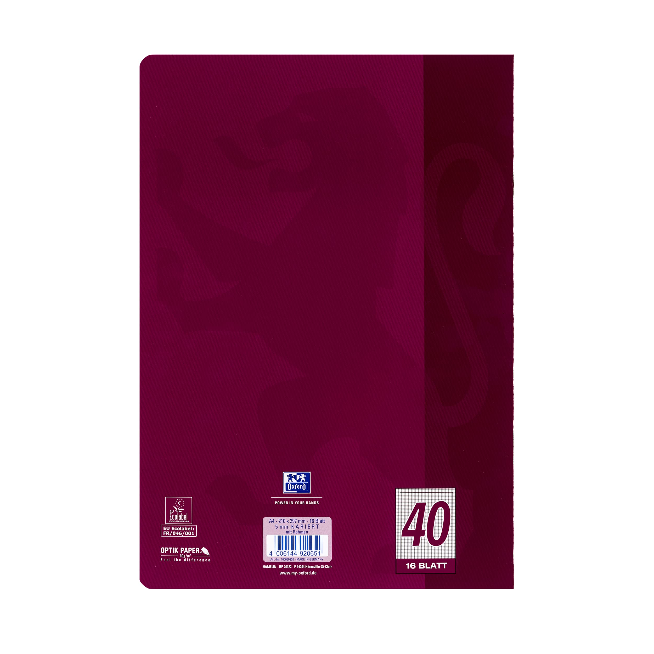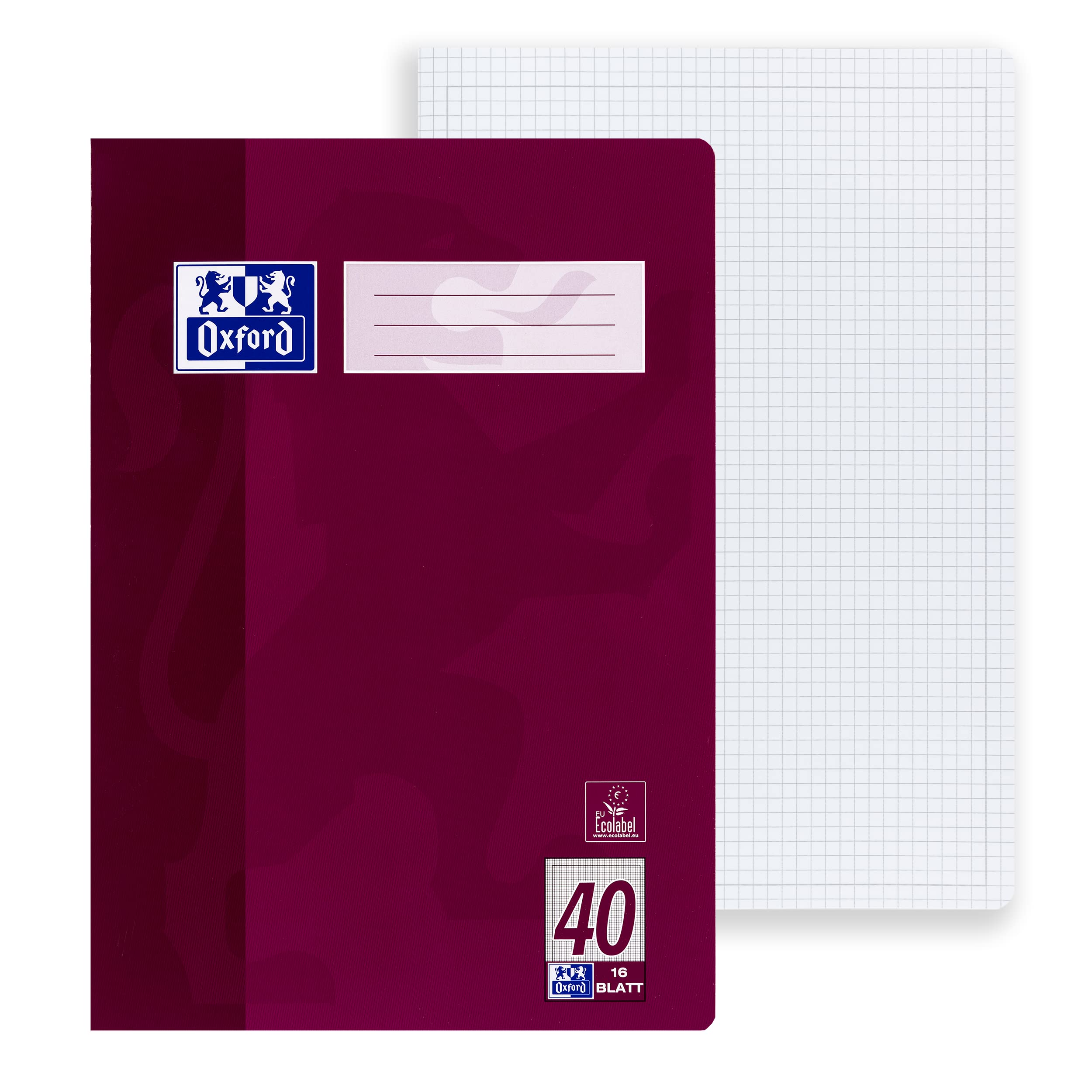Mit dem ersten Schulheft beginnt der Ernst des Lebens.Die ersten geschriebenen Wörter und Texte sind etwas ganz besonderes für jeden Schüler. Für den optimalen Start in die Schullaufbahn bietet Oxford ein umfangreiches Sortiment: Von der Grundschule bis zur Oberstufe, bei Oxford gibt es alle gängigen Lineaturen in vielen verschiedenen Farben. Hausaufgabenhefte, Oktavhefte und Notenhefte ergänzen das Sortiment.Oxford Optik PaperDas hochwertige Papier (Optik Paper) hat eine seidenglatte Oberfläche, die für ein optimales Schriftbild sorgt und damit das Schreiben für die Schüler erleichtert. Das Papier ist bewusst etwas dicker und stabiler (90 g/m²) als Standardpapier (70 bis 80 g/m²), damit beide Seiten des Papiers beschrieben werden können, ohne dass die Tinte auf der Rückseite durchschlägt.ProduktdetailsStarker Umschlag: abwischbar und mit Glanz-LookBeschreibbare EtikettenLineatur 40 - kariert 5 mm mit Rahmen16 Blatt Fomat: A4VE: Packung mit 15 StückDas Heft trägt das EU Ecolabel & ist damit gut für die Umwelt
