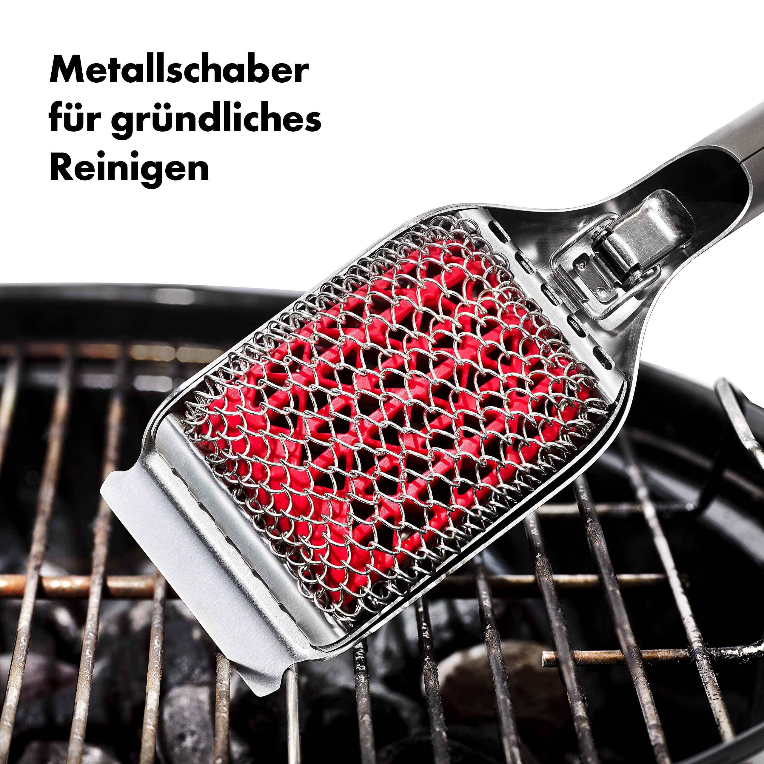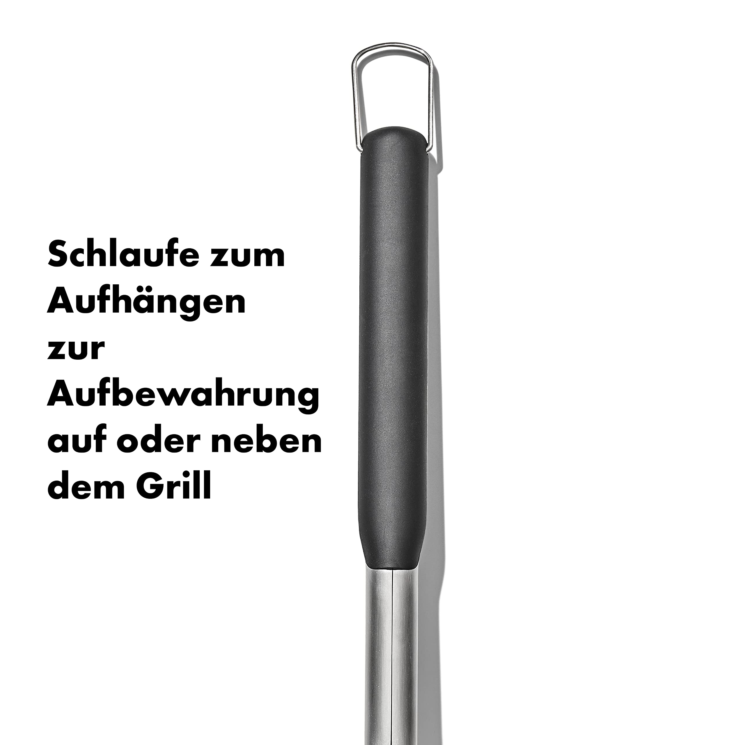 Mit der OXO Good Grips Grillbürste ohne Borsten mit austauschbarem Kopf ist die Reinigung nach dem Grillen keine lästige Pflicht mehr. Sie brauchen nicht zu warten, bis der Grill vollständig abgekühlt ist, bevor Sie schrubben und kratzen. Die langlebigen Edelstahlspulen in Kombination mit dem flexiblen Silikon sorgen für eine gründliche Reinigung der Grillroste, und das borstenfreie Design lässt keine Rückstände zurück. Der integrierte Metallschaber verfügt über Aussparungen, um Grillroste zu umgehen und festsitzende Lebensmittel abzuschaben. Körper und Kopf aus rostfreiem Stahl sind hoch hitzebeständig für die Reinigung von heissen Grills geeignet. Der abgewinkelte Kopf und der lange Griff mit weichem Griff ermöglichen eine gute Hebelwirkung, ohne dass Ihre Hände zu nahe kommen müssen. Ausserdem verfügt der Griff über eine Schlaufe zum Aufhängen zur Aufbewahrung auf dem Grill oder in seiner Nähe. Der Bürstenkopf lässt sich zur gründlichen Reinigung leicht abnehmen oder durch einen neuen Bürstenkopf (separat erhältlich) ersetzen, um die Lebensdauer Ihrer Grillbürste zu verlängern. Griff und Kopf sind spülmaschinengeeignet. Die Bürste kann auf allen Grills ausser solchen mit Keramikbeschichtung verwendet werden.