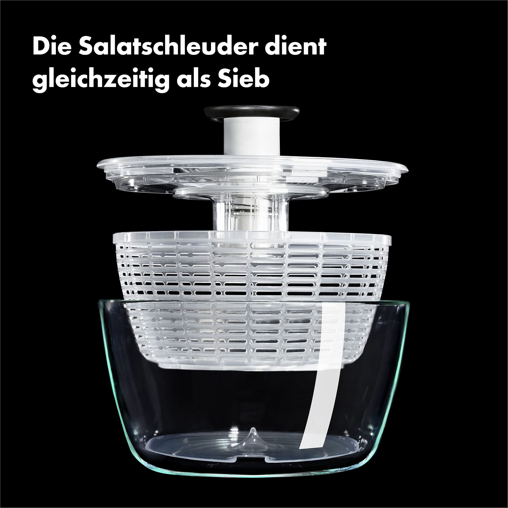 Die OXO Good Grips Salatschleuder aus Glas ist der schnelle und einfache Weg, um Salat oder Kräuter zu trocknen – drücken Sie einfach den weichen, rutschfesten Knopf. Der Schleuderkorb dient gleichzeitig als Sieb, sodass Sie Salat und mehr mit Leichtigkeit abspülen können. Der rutschfeste Boden verhindert ein Verrutschen, und die patentierte eingebaute Bremstaste stoppt die Salatschleuder blitzschnell zum Entladen. Geben Sie Ihren Salat in die Schüssel und servieren Sie ihn direkt darin: Die langlebige Schale ist aus Borosilikatglas und lässt sich problemlos auf dem Tisch präsentieren. Verschieben Sie einfach den Verschluss, um die Pumpe bündig mit dem Deckel für eine kompakte Lagerung zu fixieren. Der Deckel lässt sich zur einfachen Reinigung auseinandernehmen. Das Fassungsvermögen der Schale beträgt 5,9 l; das Fassungsvermögen des Korbes beträgt 4,1 l. Spülmaschinenfest.