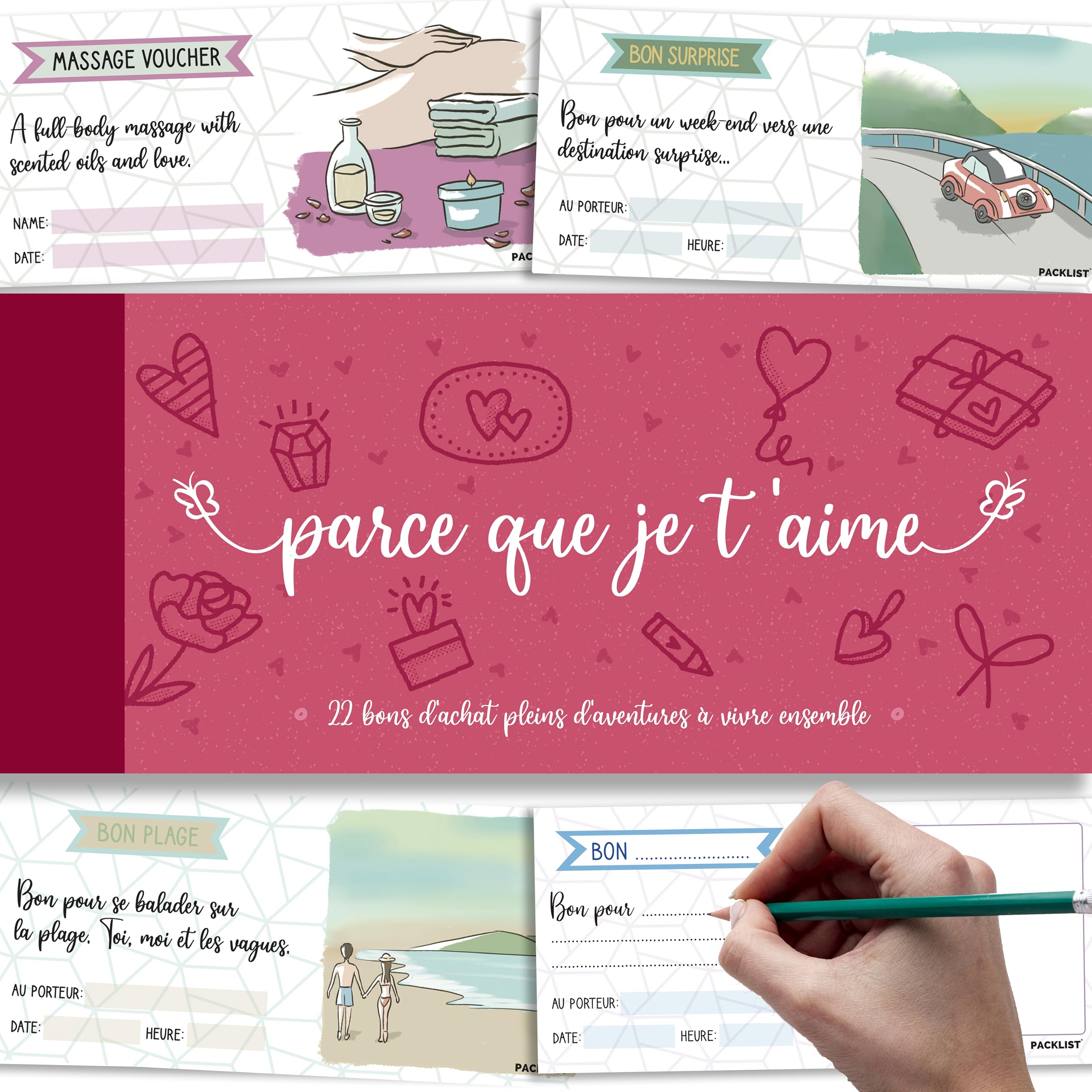 • ❤️ 22 AVENTURES POUR RENDRE AMOUREUX - 16 plans parfaits pour s'amuser ensemble + 6 bons vierges à personnaliser à votre guise. « Bon massage » « Bon évasion » « Bon surprise » « Bon SPA » ... et bien d'autres encore.