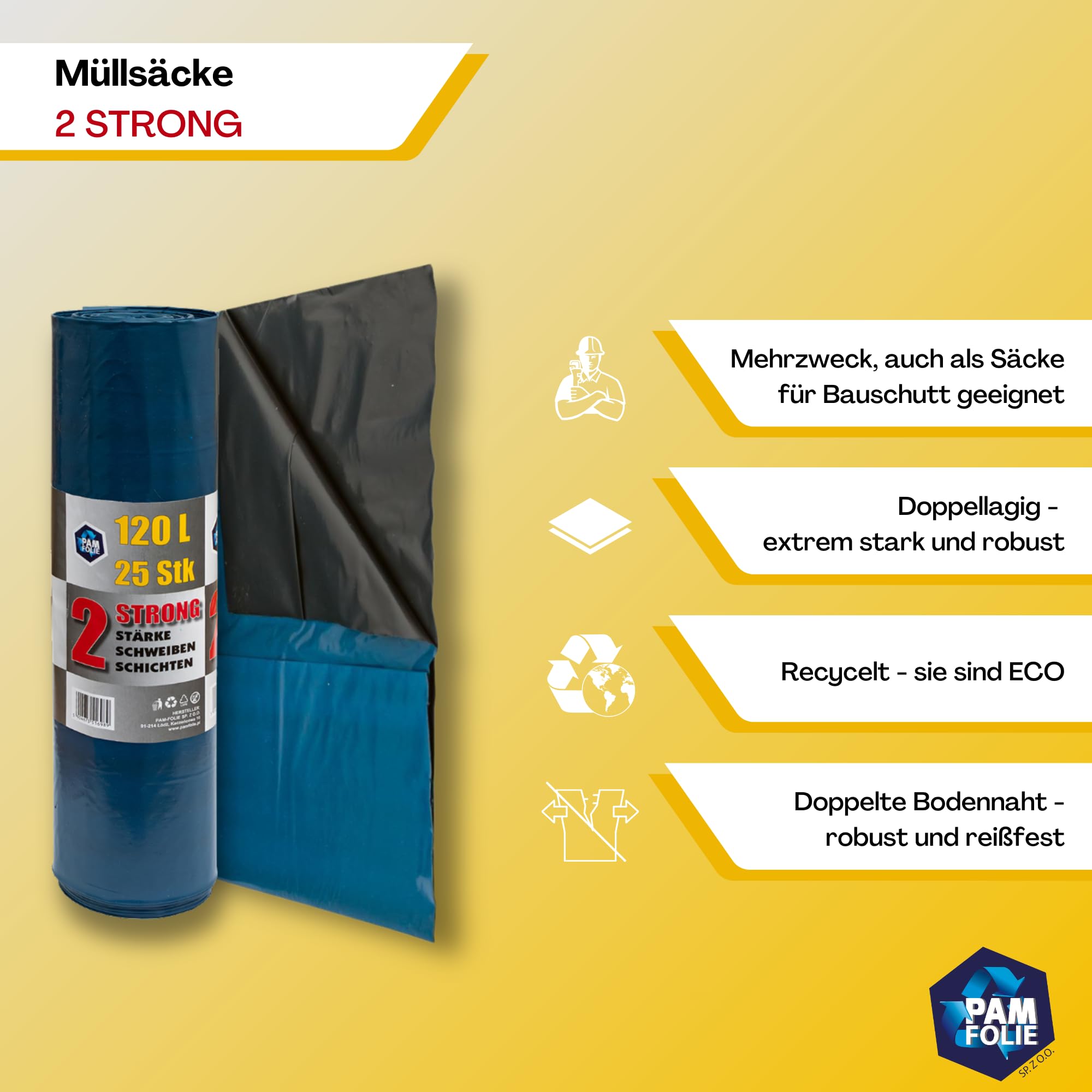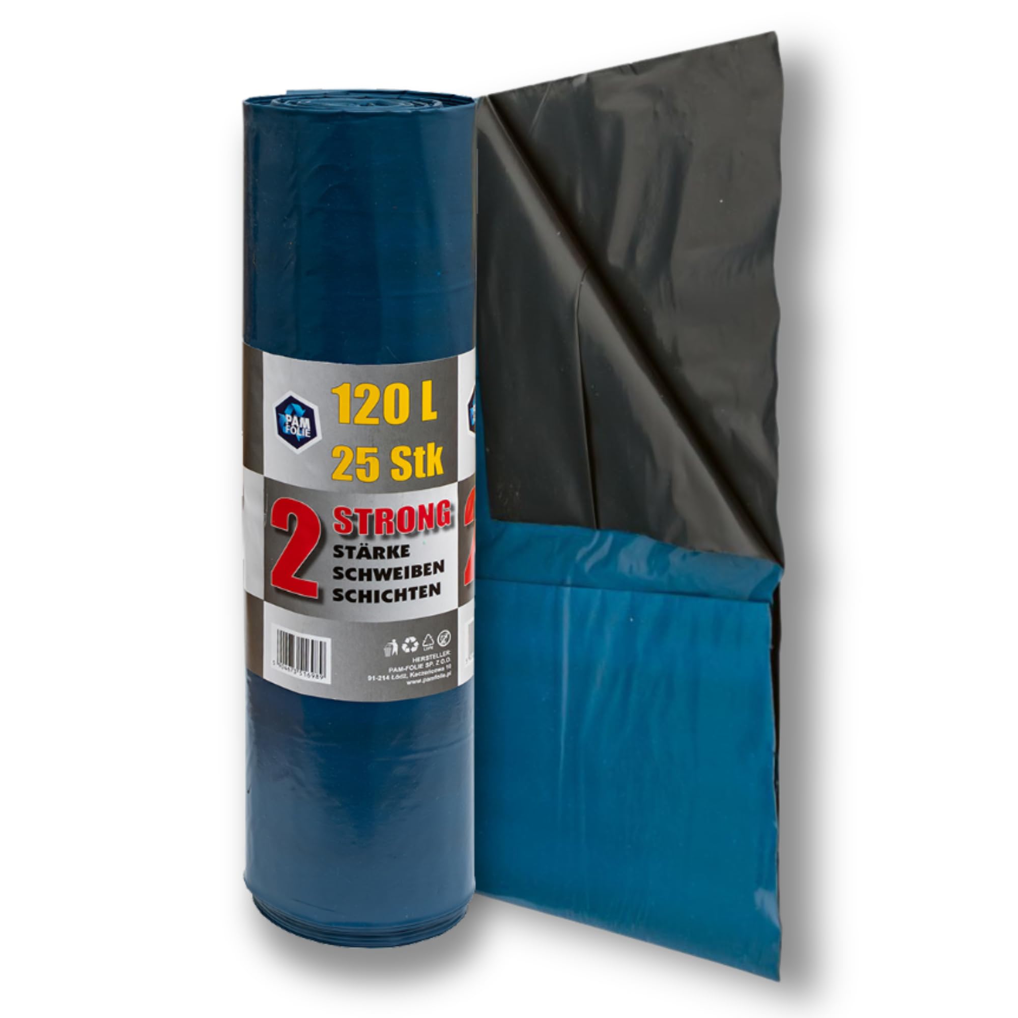 PAM-FOLIE Extra Starke Müllsäcke 120L - 25 Stück - Grosse, Dicke Abfallsäcke - 70x110cm - Doppelschicht - schwarzer, blauer Müllbeutel - Bauschuttsäcke - Bauschuttsäcke, universal