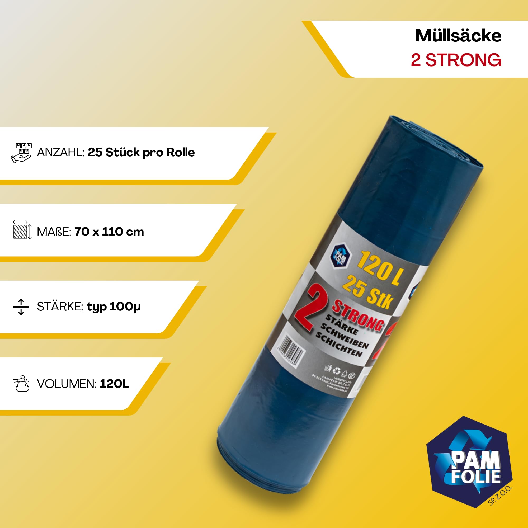 • Extra strapazierfähige Abfallsäcke: Jede Rolle enthält 25 Säcke mit einem Fassungsvermögen von 120 Litern. Die 2Strong-Müllsäcke, gefertigt aus dicker und robuster Hochleistungsfolie (Typ 100 Mikron), sind speziell dafür entwickelt, selbst den härtesten Anforderungen standzuhalten. Die 2Strong-Müllsäcke sind ein Produkt, das mit Blick auf höchste Qualität entwickelt wurde.