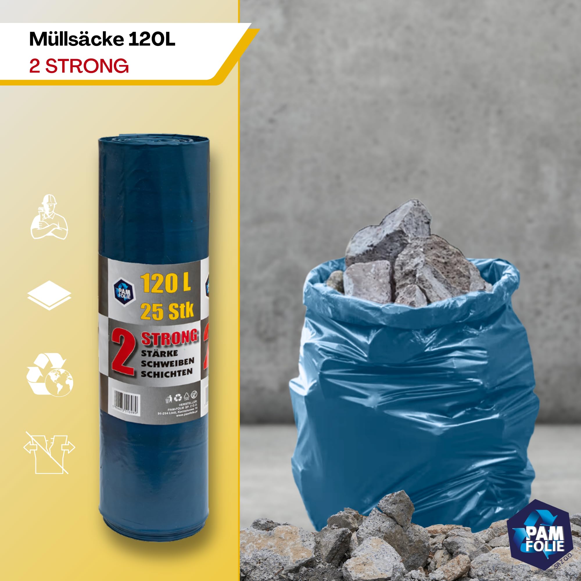 PAM-FOLIE Extra Starke Müllsäcke 120L - 25 Stück - Große, Dicke Abfallsäcke - 70x110cm - Doppelschicht - schwarzer, blauer Müllbeutel - Bauschuttsäcke - Bauschuttsäcke, universal