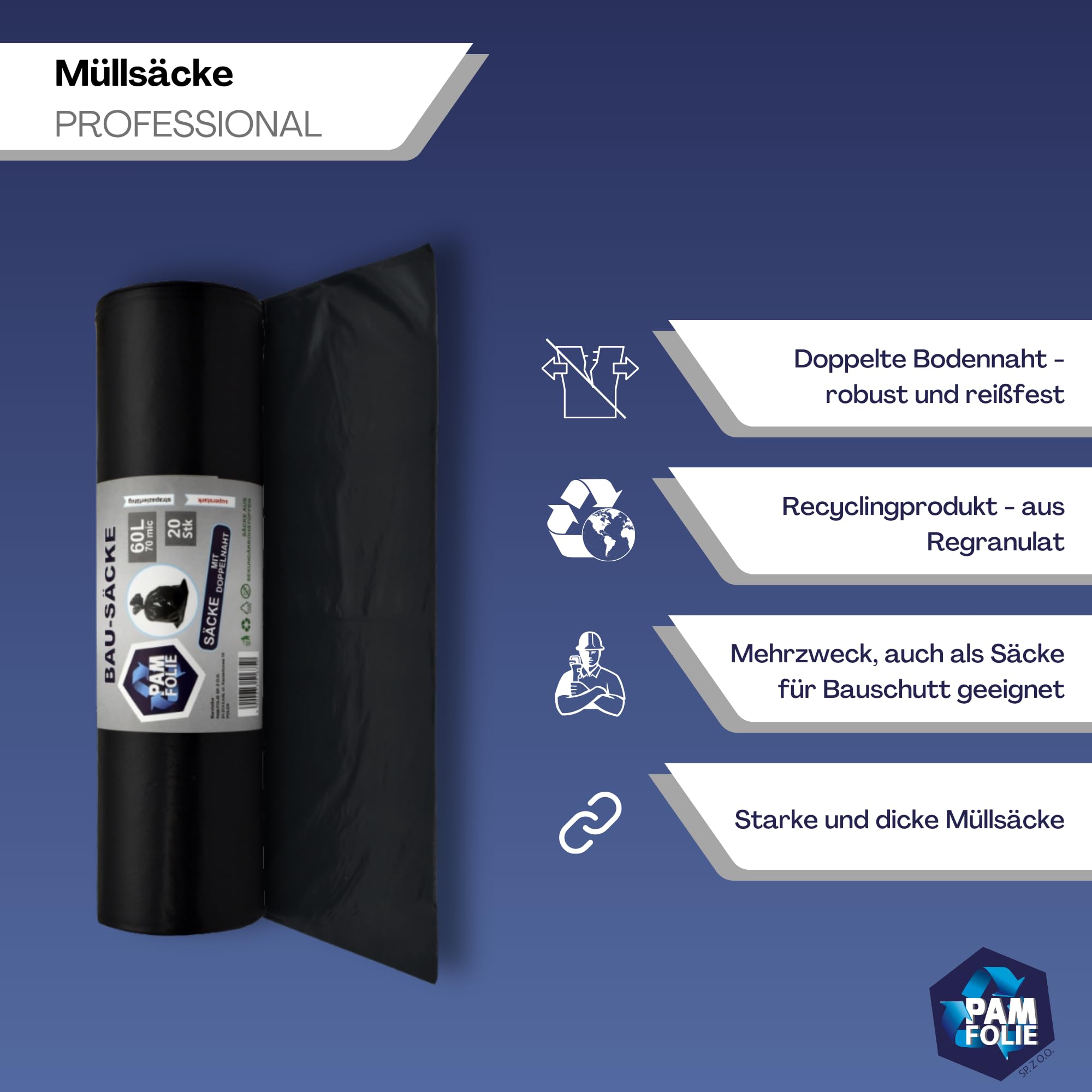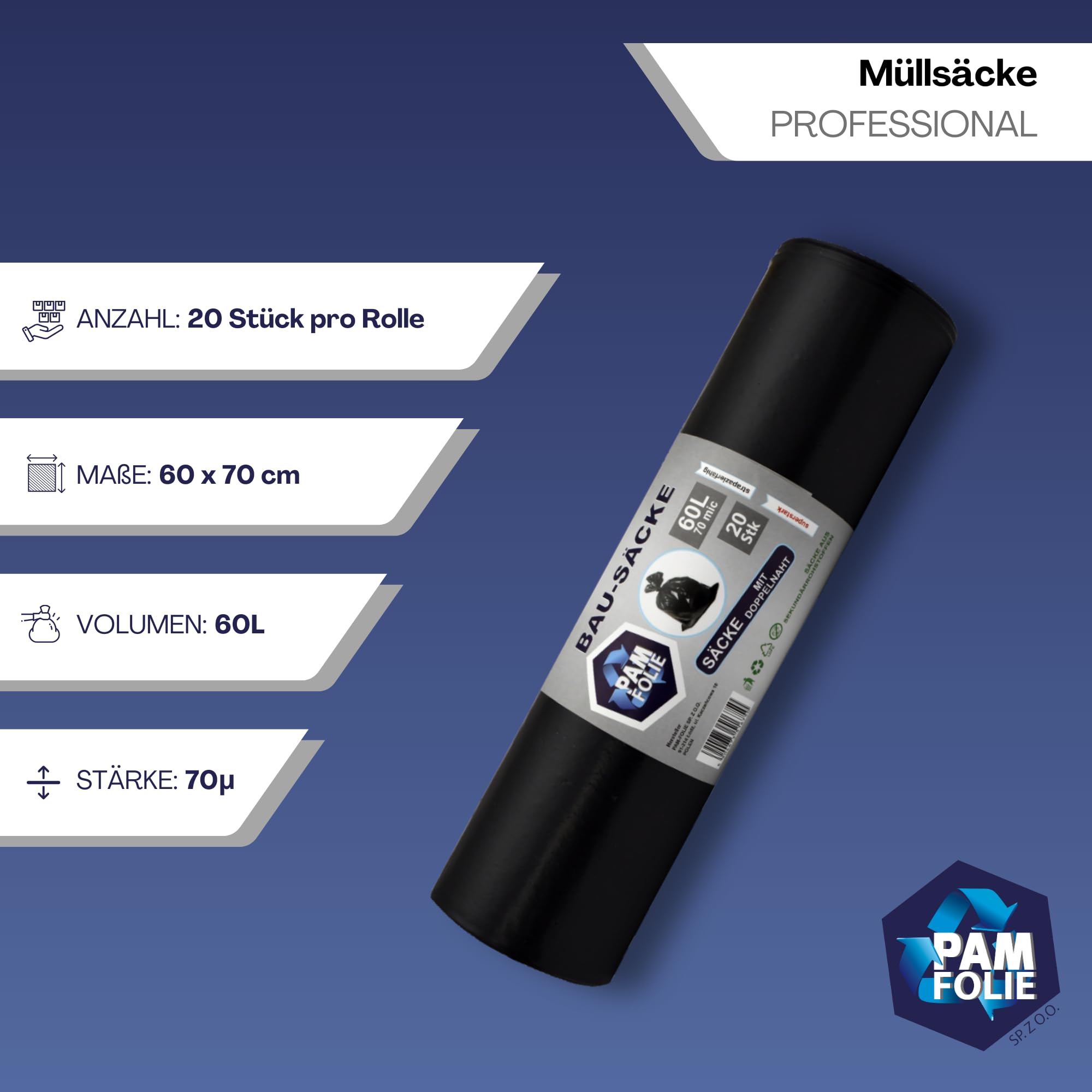 PAM-FOLIE Müllsäcke 60L - 20 Stück - Bausäcke Professional - Extra Dicke Abfallsäcke - 60x70cm - 70µm - Starke, schwarze Müllbeutel - Bauschuttsäcke - Säcke für Bauschutt Abfalls