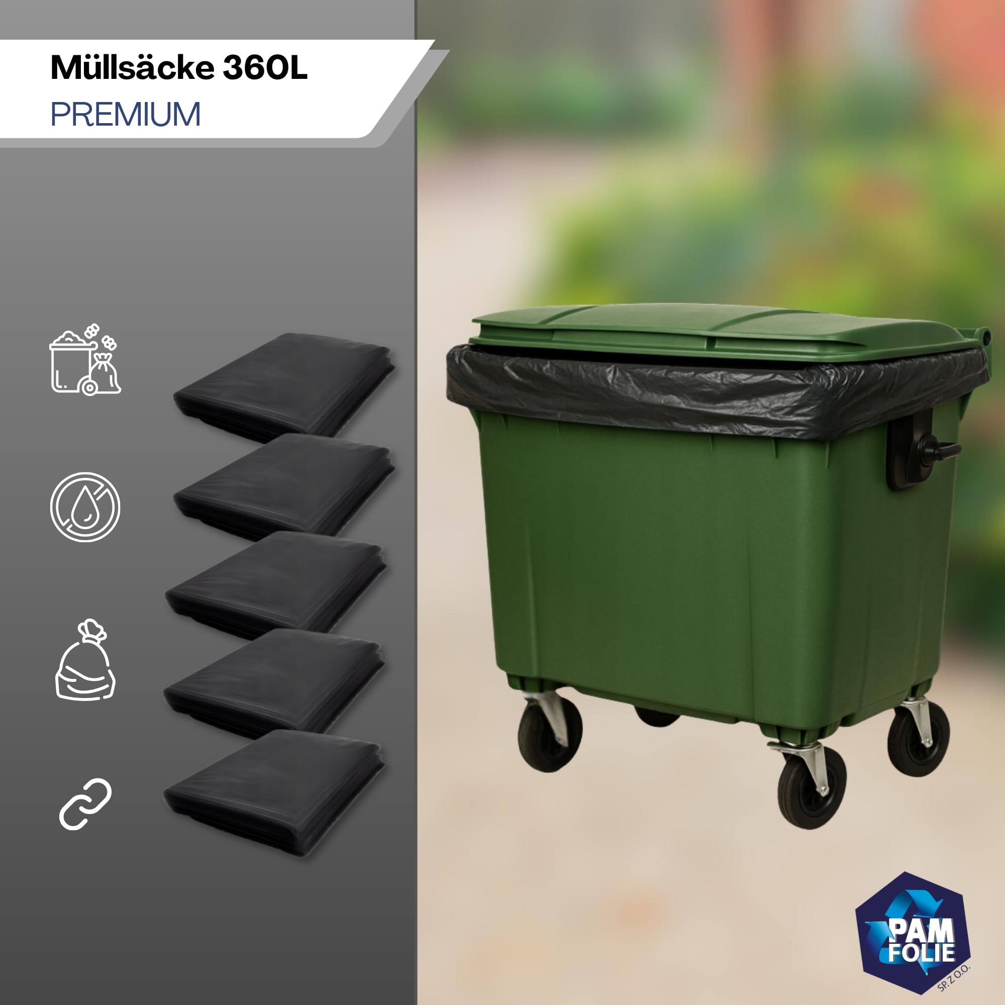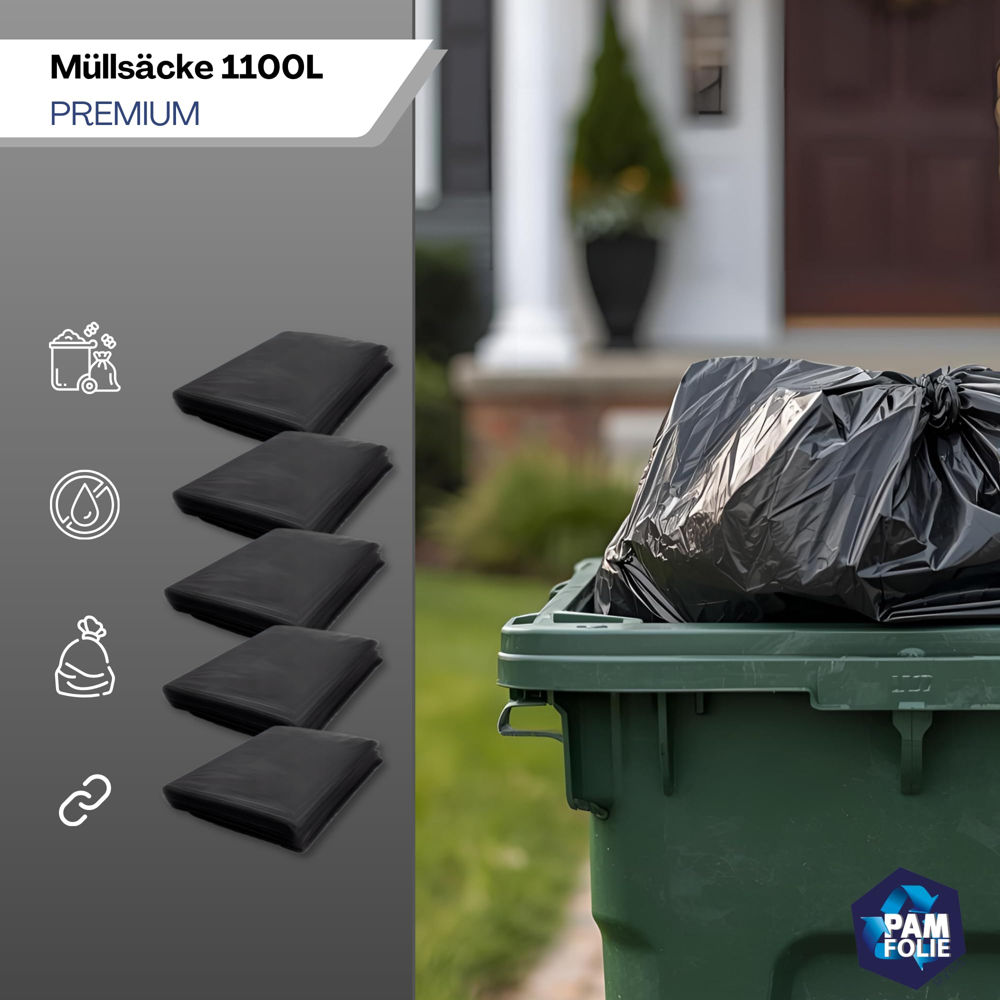 PAM-FOLIE Müllsäcke 1100L für Müllcontainer - 5 Stück - Set - XXL Grosse, Starke, Dicke Abfallsäcke - 235 cm x 180 cm - 50µm - Schutzhülle - Müllbeutel Schwarz - Universelle Säcke