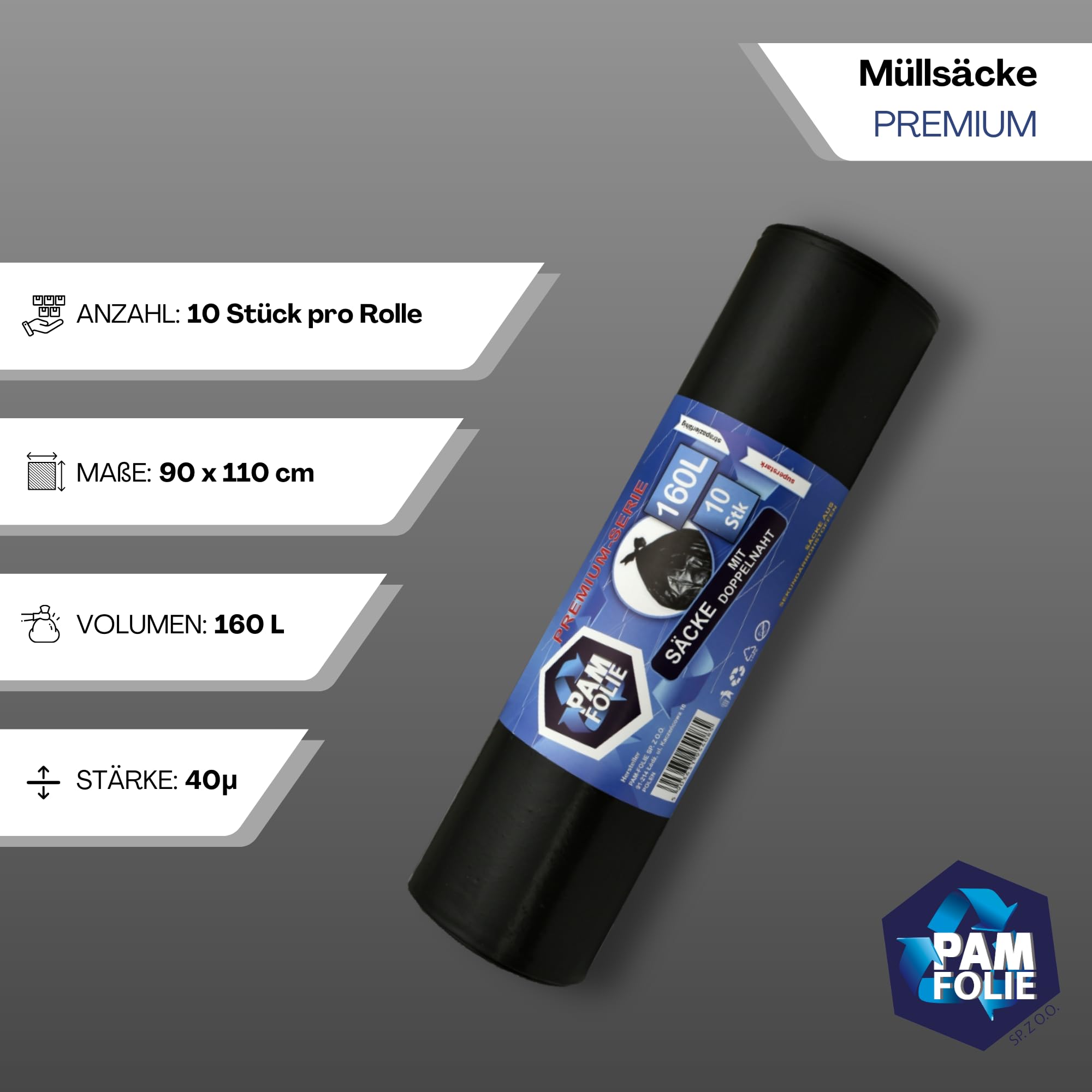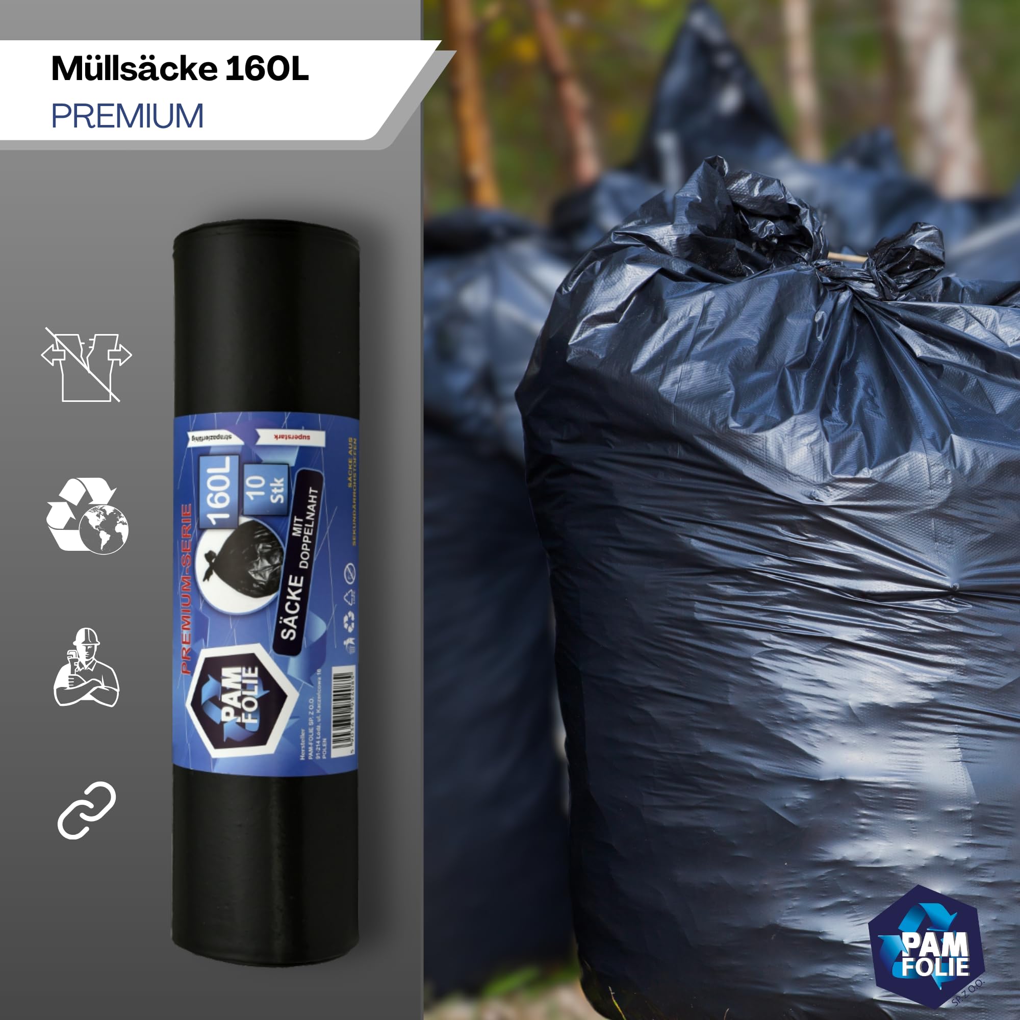 PAM-FOLIE Müllsäcke 160L - 10 Stück - Dicke, Grosse Abfallsäcke, Premium - 90x110cm - 40µm - schwarzer Müllbeutel - Bauschuttsäcke - Säcke für Bauschutt Abfalls