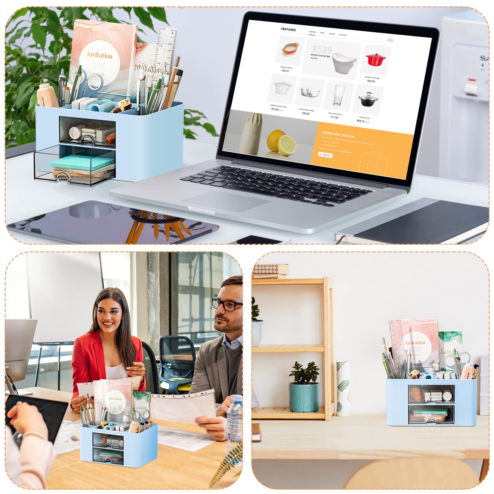 - Multifunktion: Oben befinden sich fünf Partitionen, die verschiedene kleine Bürovorräte speichern und klassifizieren und den Raum angemessen nutzen können. Die beiden transparenten Schubladen in der Mitte machen es Ihnen leichter, zu finden, was Sie brauchen. Die Oberseite der Schublade ist so konzipiert, dass Sie die Schublade leicht herausziehen können.