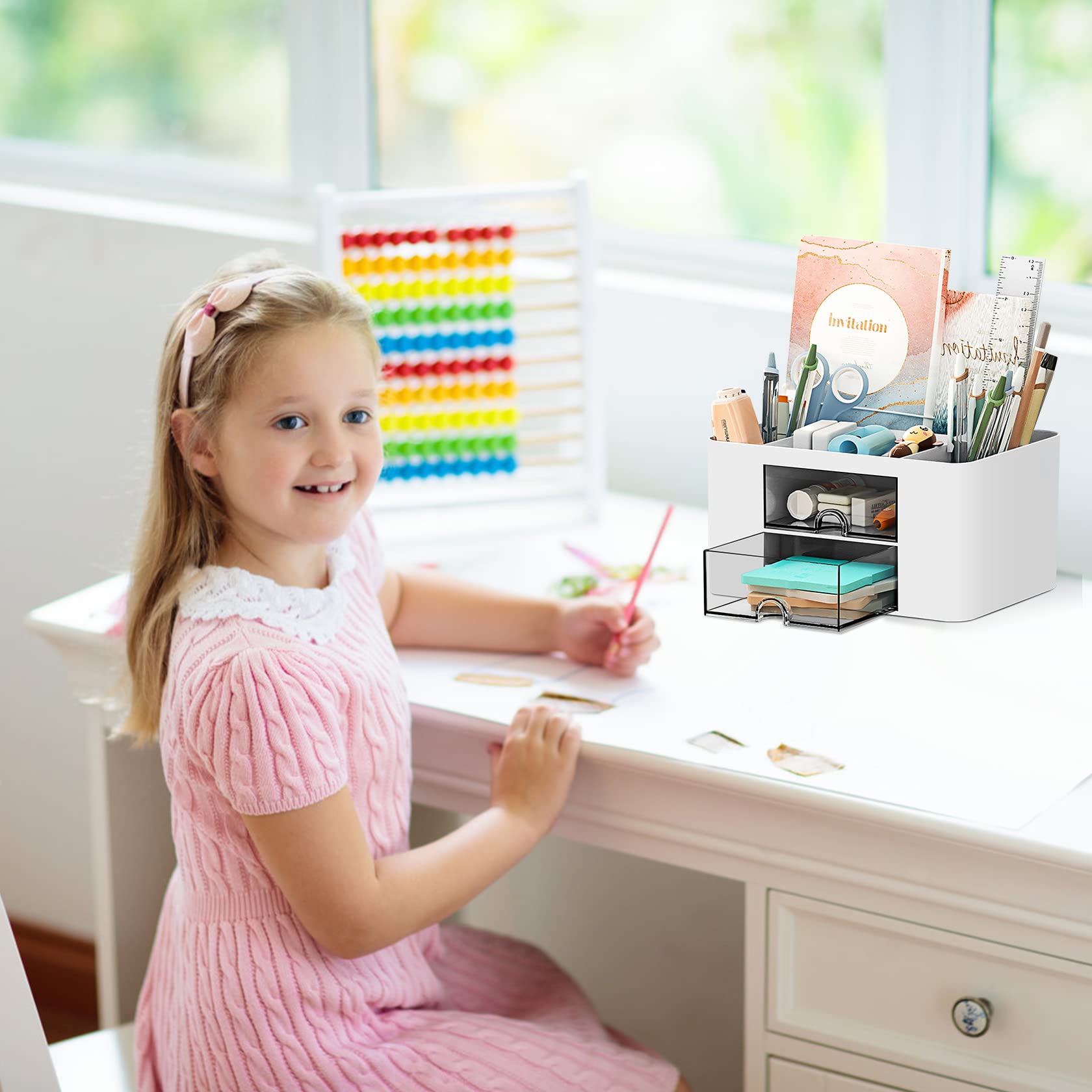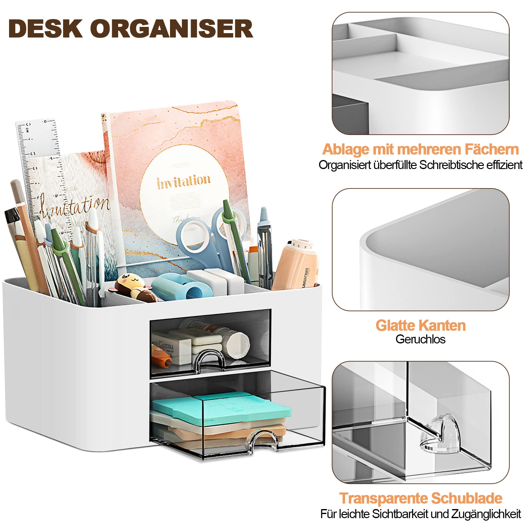 PAMIYO Schreibtisch Organizer 7 Fächer Plastik Büro Organizer, Multifunktionaler Stiftehalter Schreibtisch mit Schublade,Tisch Organizer aus Kunststoff, Stifteköcher für Büro Zuhause Schule (Weiss)