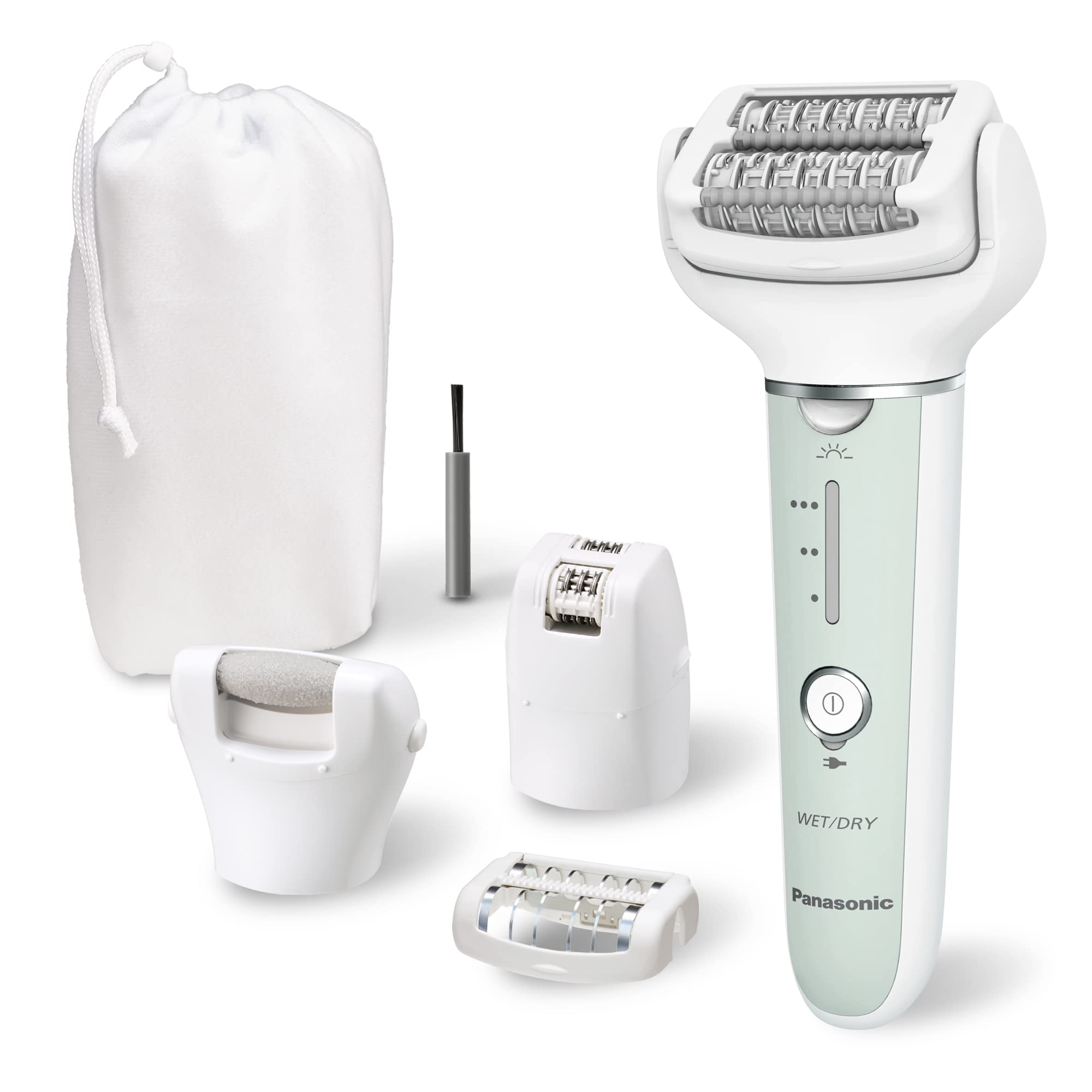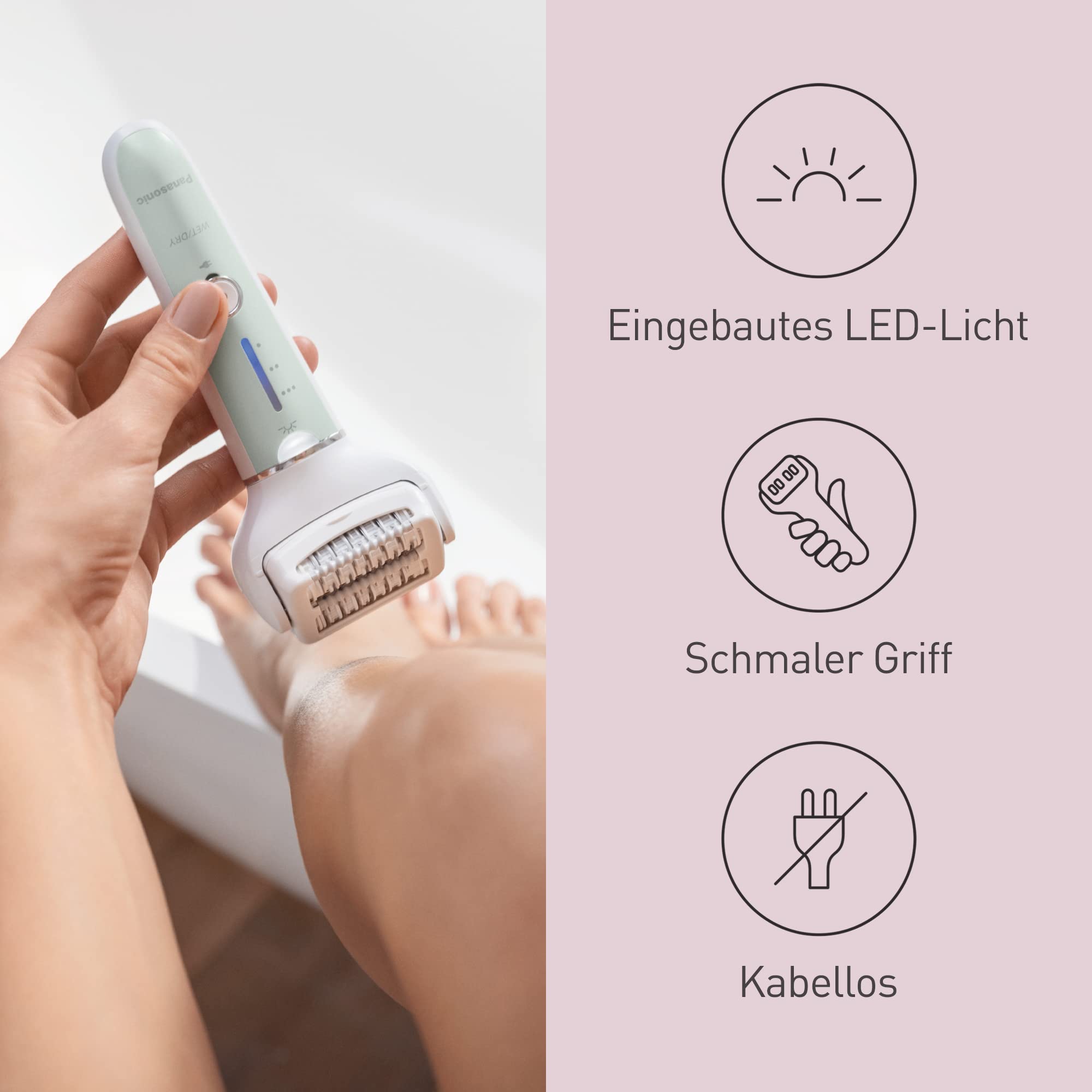 Panasonic ES-EY70 Nass/Trockenepilierer Damen, Dual Disc mit 60 Pinzetten, 90° schwenkbarer Kopf, 3 Geschwindigkeiten & LED-Licht, 30 Min. Betrieb, kabellos, Haarentferner, Fußpflegekopf.