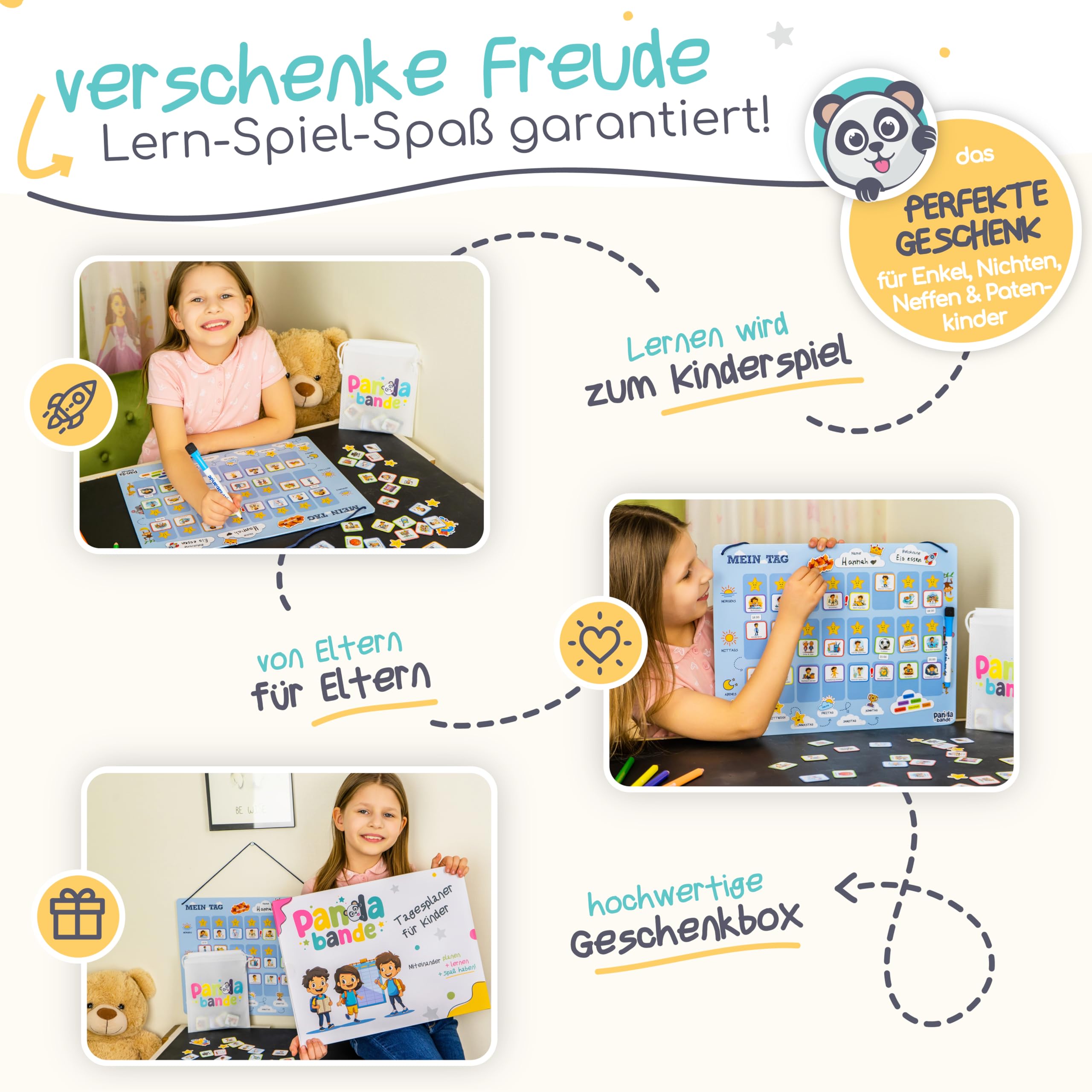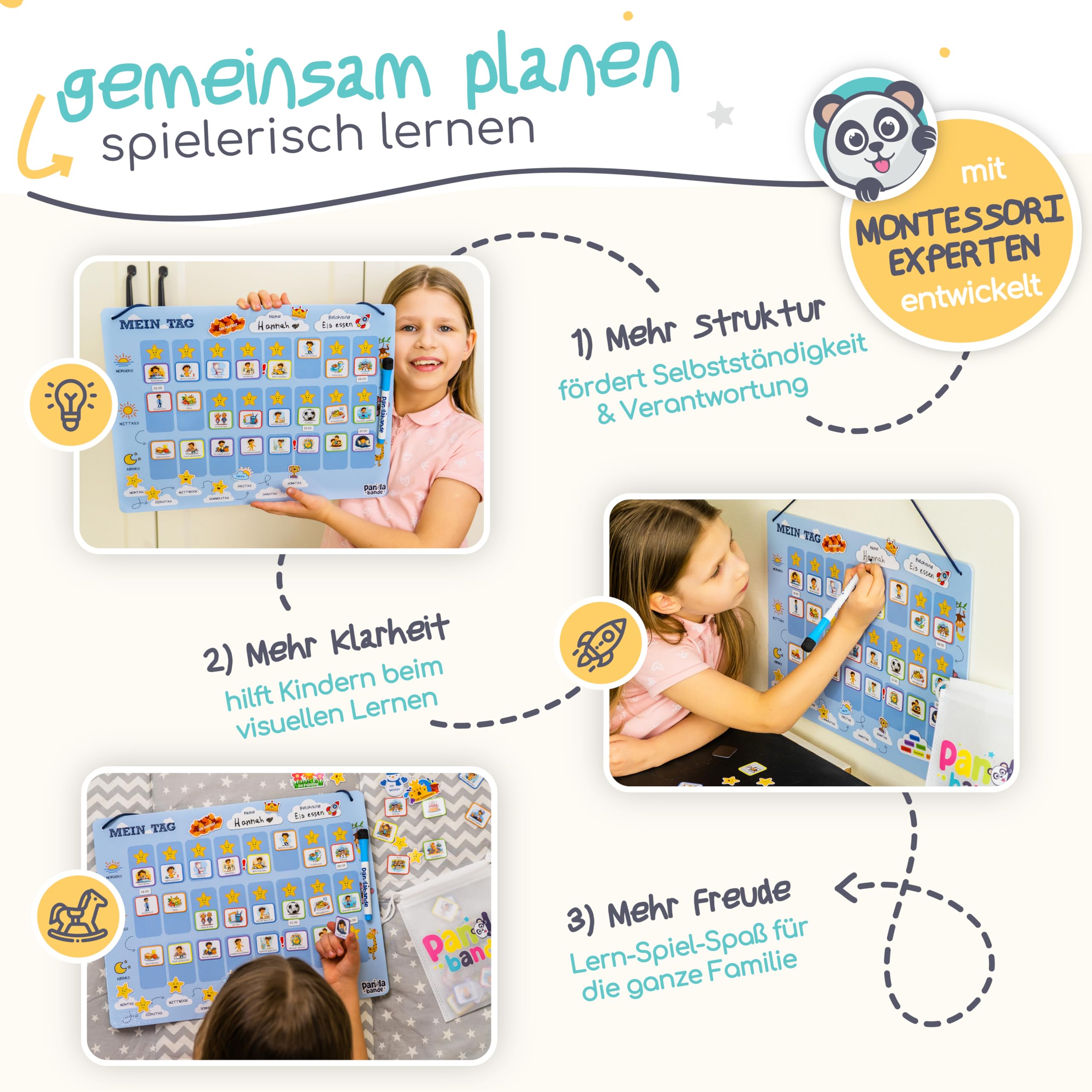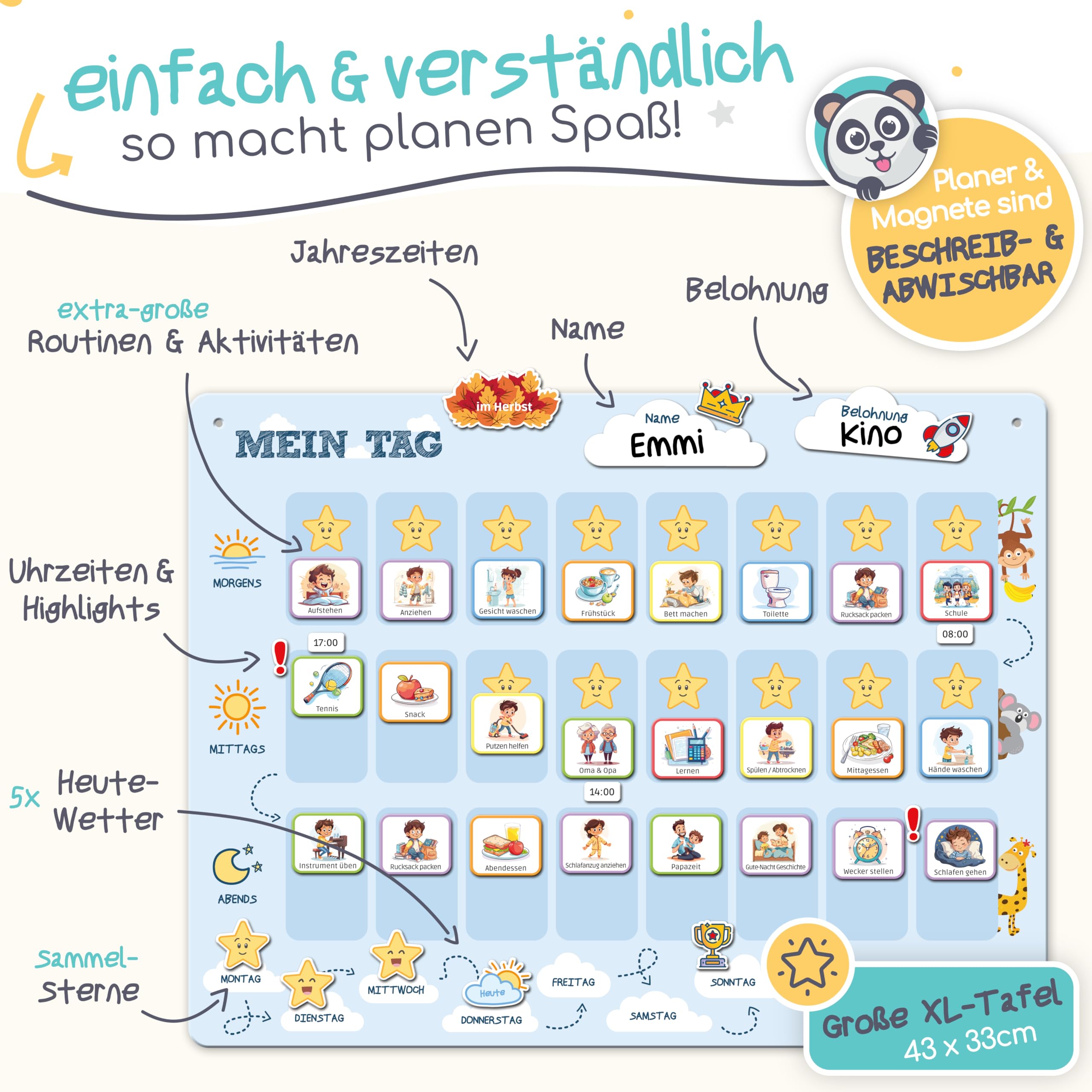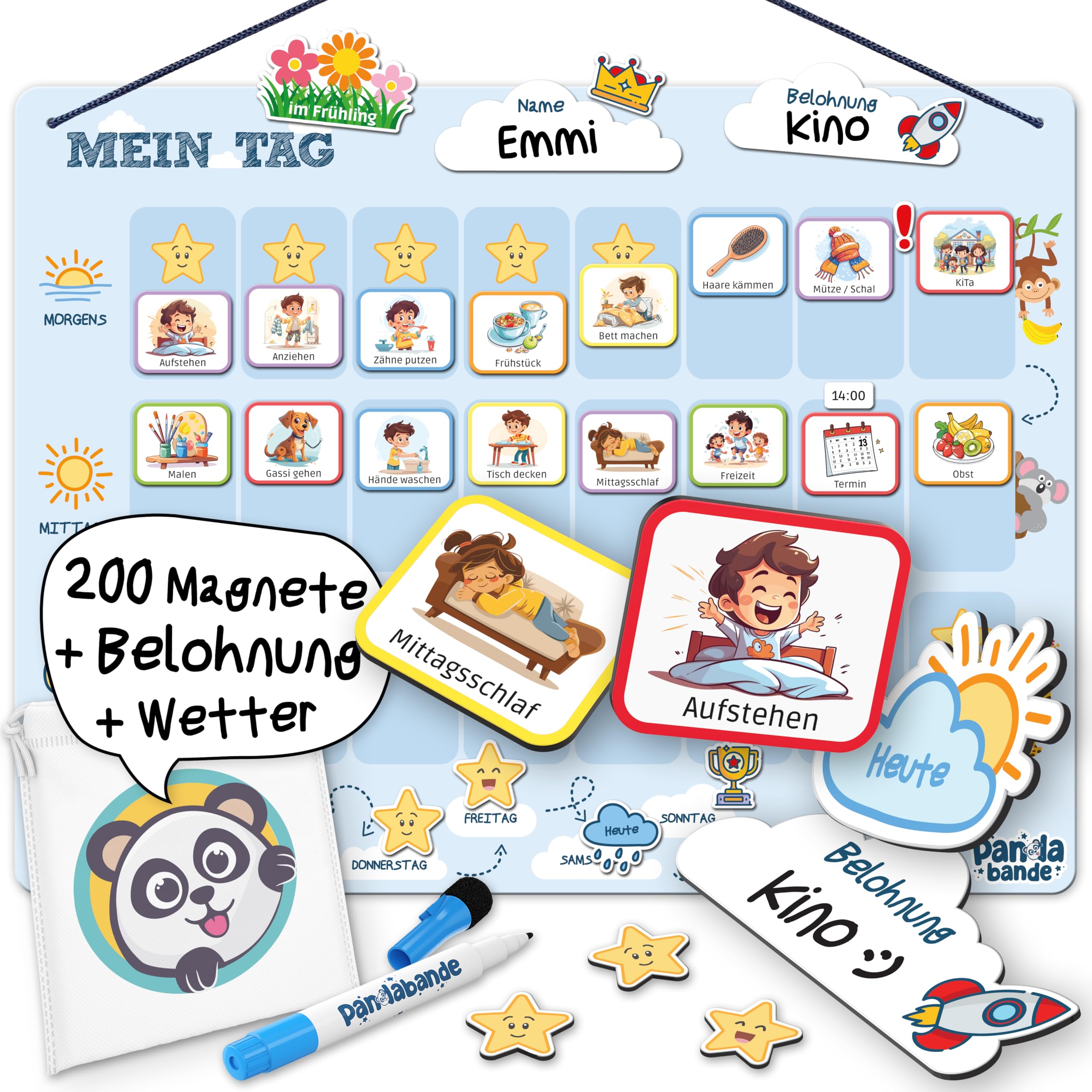 PANDABANDE® Montessori Tagesplaner Kinder [Belohnung, Wetter, 200 Magnete] - Routine Planer Kind - Ideale Aufgabentafel, Tagesplan, Tagesablauf Plan für Morgenroutine & Abendroutine