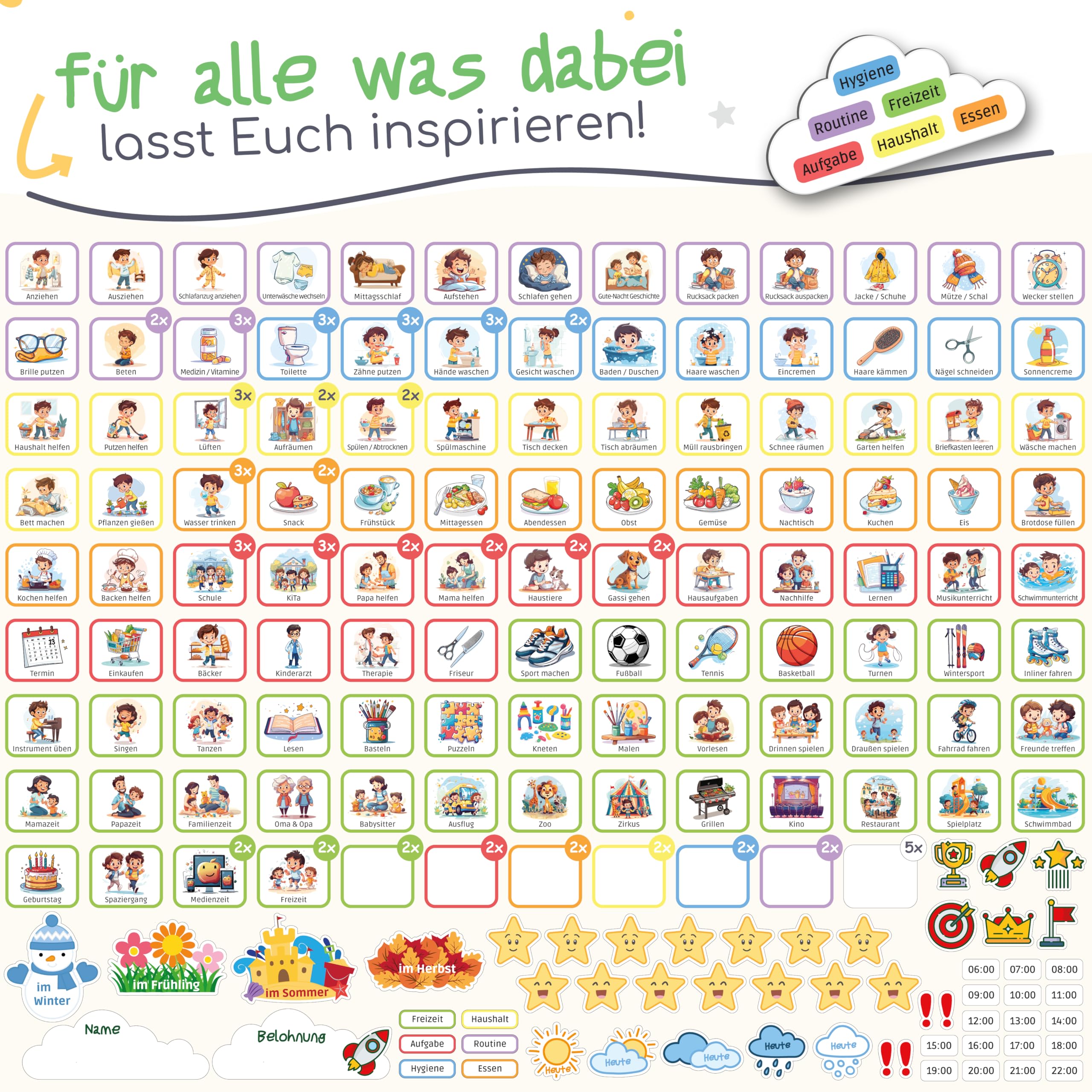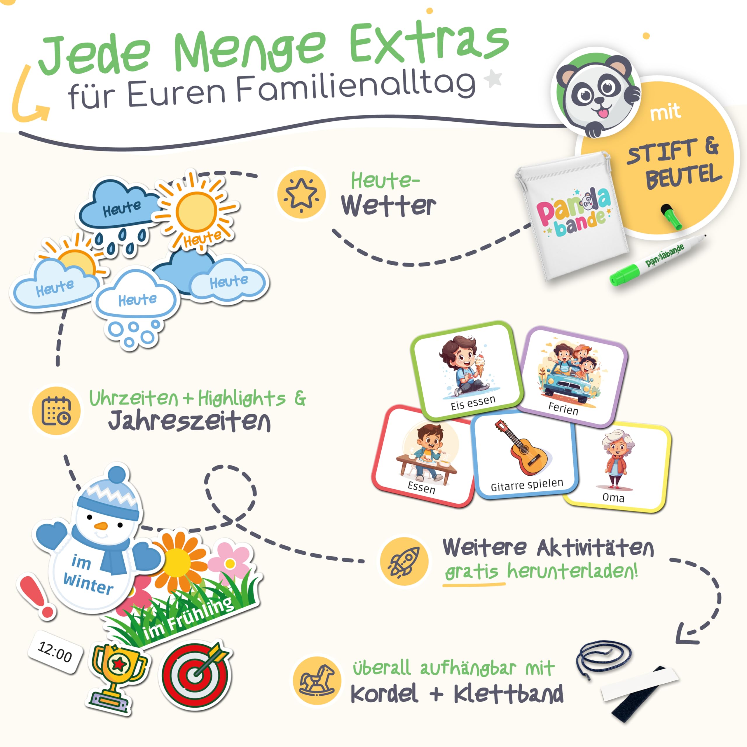 Mit dem Montessori Tagesplaner Kinder Routine von der Pandabande kannst Du Deinem Kind ganz einfach auf spielerische Art tägliche Routinen erlernen. So förderst Du nicht nur die Selbstständigkeit Deines Kindes nach dem Montessori-Konzept, sondern es lernt auch den Tagesablauf und entwickelt dabei ein natürliches Zeitgefühl.Dein Kind kann intuitiv die täglichen Aktivitäten als erledigt markieren, Sterne dafür sammeln und am Ende der Woche eine Belohnung erhalten. Zudem sind zahlreiche weitere Extras wie Wetter, Jahreszeiten, Uhrzeiten und Motivations-Magnete enthalten. So könnt Ihr Euren Tagesablauf ganz individuell gestalten und tägliche Routinen werden mit Spass gemeistert.Alle PANDABANDE Tagesplaner Kinder Routine sind in 4 liebevoll gestalteten kindgerechten Farbvarianten erhältlich: Piraten (blau), Dschungel (grün), Einhörner (rosa), Dinosaurier (gelb). Perfekt für Mädchen oder Jungen oder auch bei mehreren Kindern und Geschwistern, damit jeder seinen eigenen Planer hat.Zudem lassen sich alle PANDABANDE Planer perfekt miteinander kombinieren - so kann beispielsweise der Wochenplaner mit den Routineplanern ergänzt werden oder der Tagesplaner mit der Belohnungstafel erweitert werden. Natürlich lassen sich auch alle Planer zusammen kombinieren - schliesslich hat jeder Planer hat einen anderen pädagogischen Fokus nach dem Montessori-Prinzip.Mit dem Montessori Tagesplaner Kinder Routine von der Pandabande seid ihr als Familie bestens organisiert und Eure Kinder sind mit voller Vorfreude dabei!Inhalt:Grosse XL-Tafel mit Schnur und Klettband zum Aufhängen150 Aktivitäten-Magnete mit liebevoll gestalteten Motiven in 6 Kategorien58 Spezial-Magnete wie Wetter, Jahreszeiten, Uhrzeiten, Highlights, SterneÜber 100 weiteren Aktivitäten zum gratis herunterladen und auf Blanko-Magnete aufklebenAbwischbarer magnetischer Stift und Tasche für Magnete