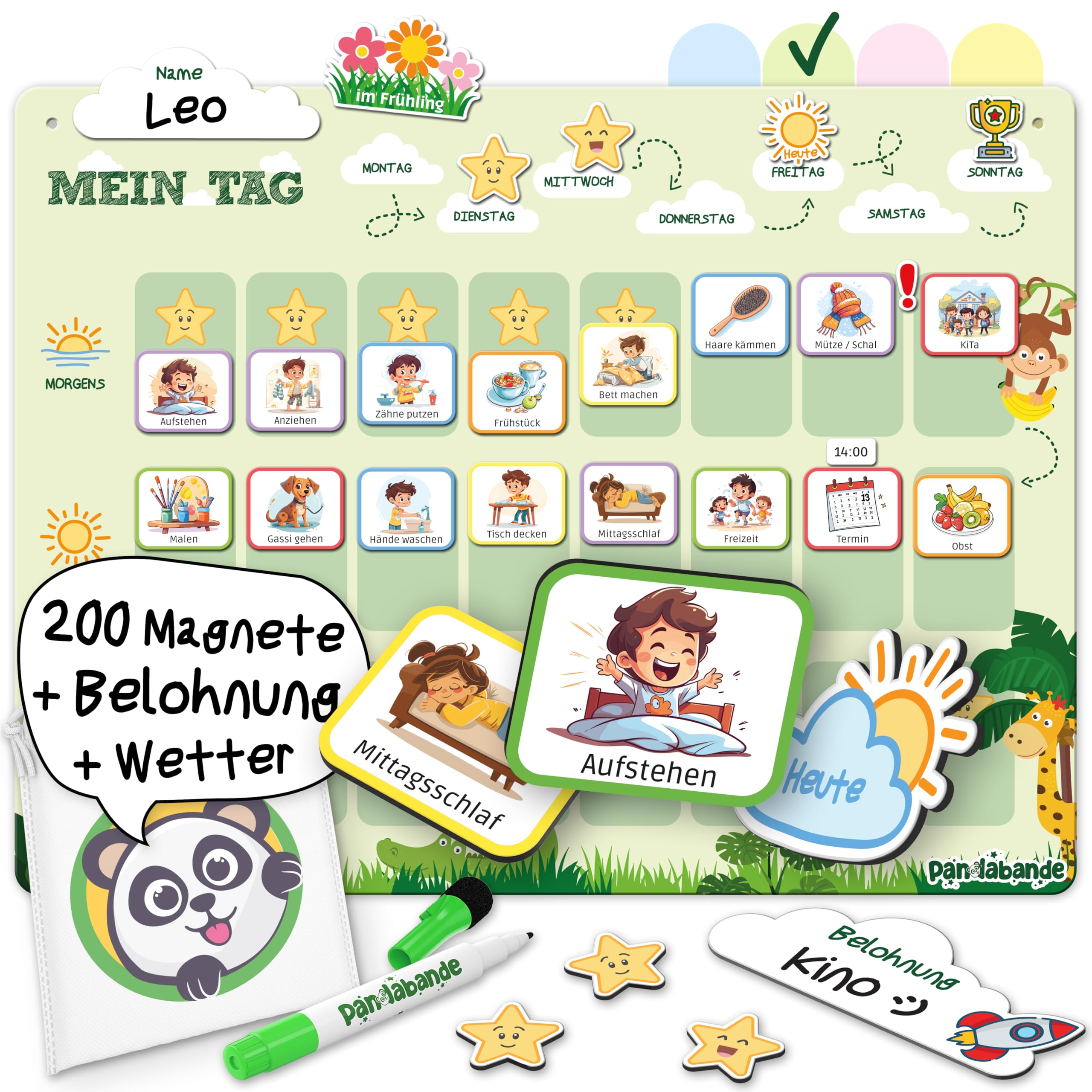 PANDABANDE® Montessori Tagesplaner Kinder Routine [Belohnung, Wetter, 208 Magnete] - Tagesablauf Plan für Morgenroutine & Abendroutine - Idealer Tagesplan Magnetisch, Routineplaner Kind (Dschungel)