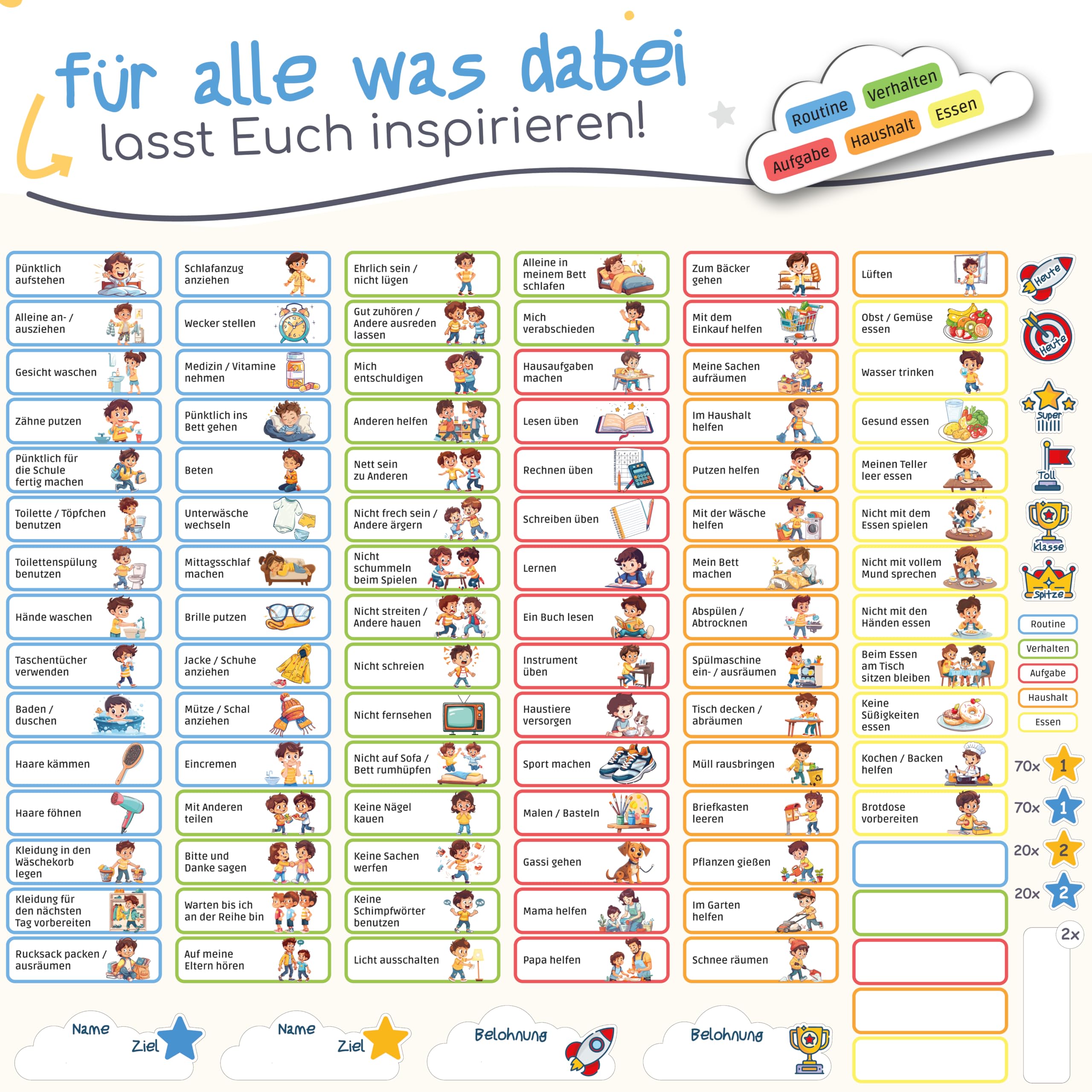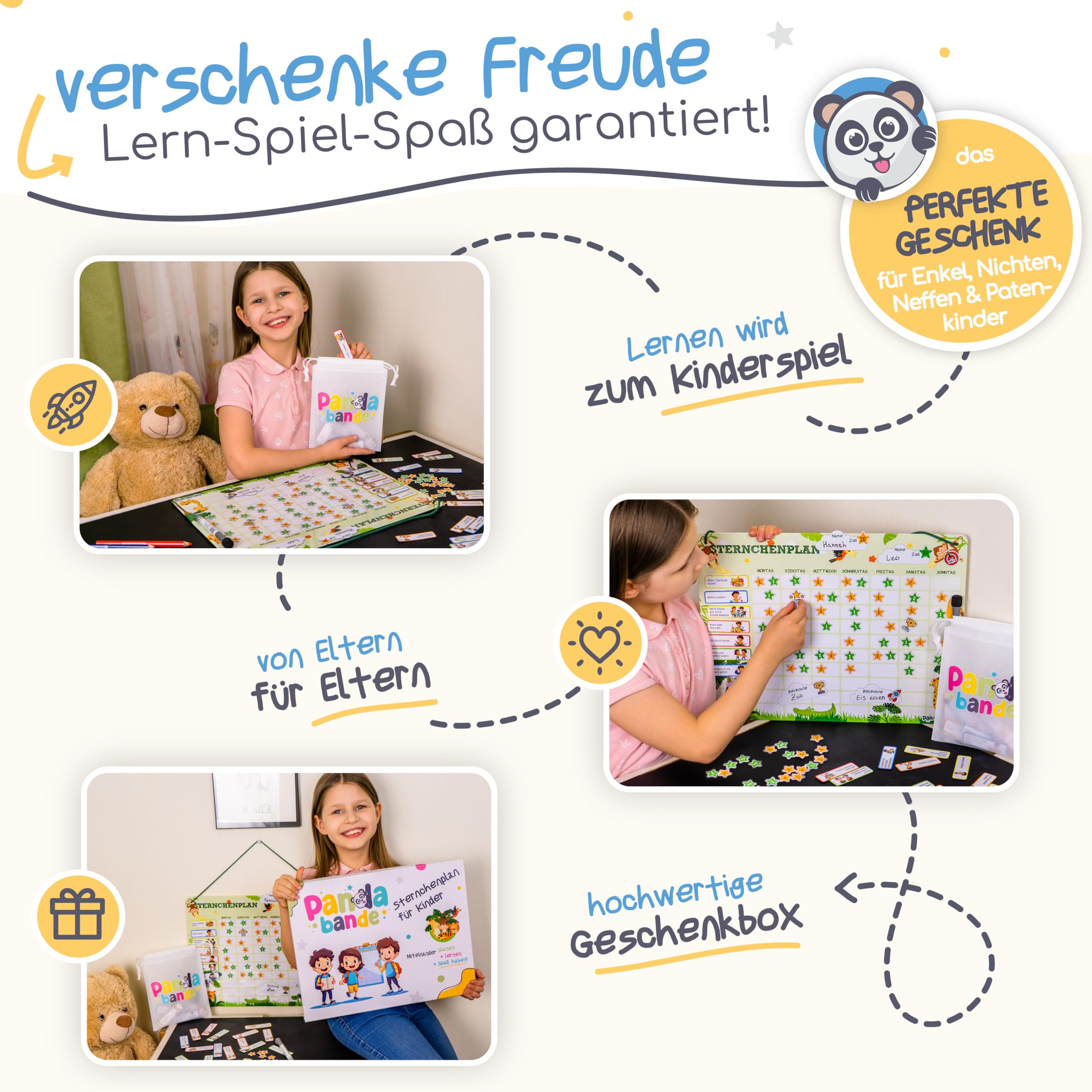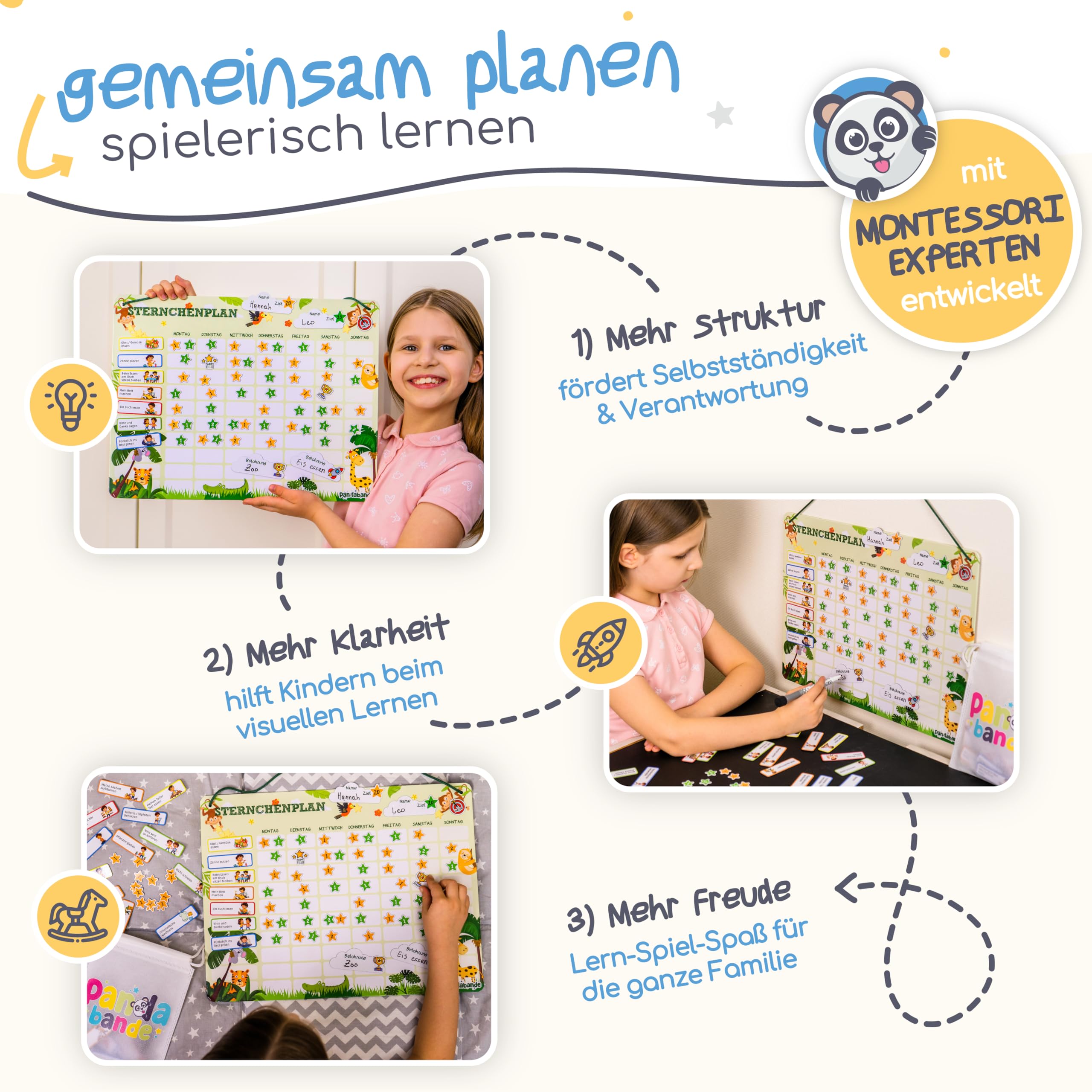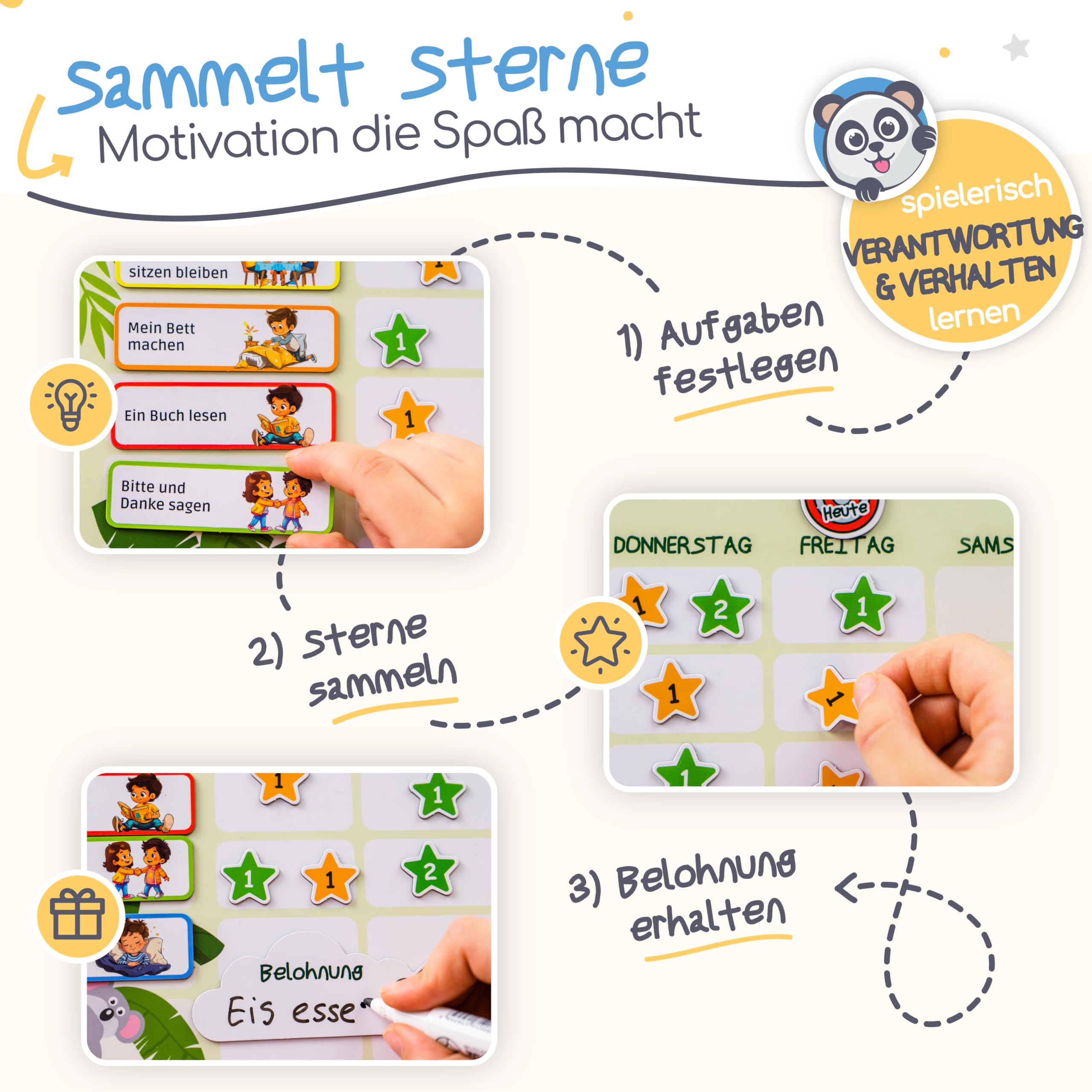 Mit der Montessori Belohnungstafel Kinder von der PANDABANDE kannst Du Deinem Kind ganz einfach auf spielerische Art Verantwortung erlernen. So förderst Du nicht nur die Selbstständigkeit Deines Kindes nach dem Montessori-Konzept, sondern motivierst es auch zu gutem Benehmen und mehr Struktur im Alltag.Gemeinsam könnt Ihr bis zu 10 Aufgaben festlegen, für die Dein Kind Sterne sammeln kann und am Ende der Woche eine Belohnung erhält. Die Bildchen sind kinderleicht verständlich und die extra-grossen Sterne lassen sich ganz einfach platzieren und fördern dabei die Feinmotorik. Zudem könnt Ihr die Tafel durch die zweifarbigen Sterne problemlos auch für 2 Kinder verwenden. Und das Beste daran – für besonders toll gemachte Aufgaben können auch „2er Sterne“ gesammelt werden.Alle PANDABANDE Belohnungstafel Kinder sind in 4 liebevoll gestalteten kindgerechten Farbvarianten erhältlich: Piraten (blau), Dschungel (grün), Einhörner (rosa), Dinosaurier (gelb). Perfekt für Mädchen oder Jungen oder auch bei mehreren Kindern und Geschwistern, damit jeder seinen eigenen Planer hat.Zudem lassen sich alle PANDABANDE Planer perfekt miteinander kombinieren - so kann beispielsweise der Wochenplaner mit den Routineplanern ergänzt werden oder der Tagesplaner mit der Belohnungstafel erweitert werden. Natürlich lassen sich auch alle Planer zusammen kombinieren - schliesslich hat jeder Planer hat einen anderen pädagogischen Fokus nach dem Montessori-Prinzip.Mit der Belohnungstafel Kinder von der PANDABANDE seid ihr als Familie bestens organisiert und Eure Kinder sind mit voller Vorfreude dabei!Inhalt: Grosse XL-Tafel mit Schnur und Klettband zum Aufhängen100 Aufgaben-Magnete mit liebevoll gestalteten Motiven in 5 Kategorien200 zweifarbige Sterne und Motivations- und Heute-MagneteDruckvorlage zum gratis herunterladen und eigene Aktivitäten gestaltenAbwischbarer magnetischer Stift und Tasche für Magnete