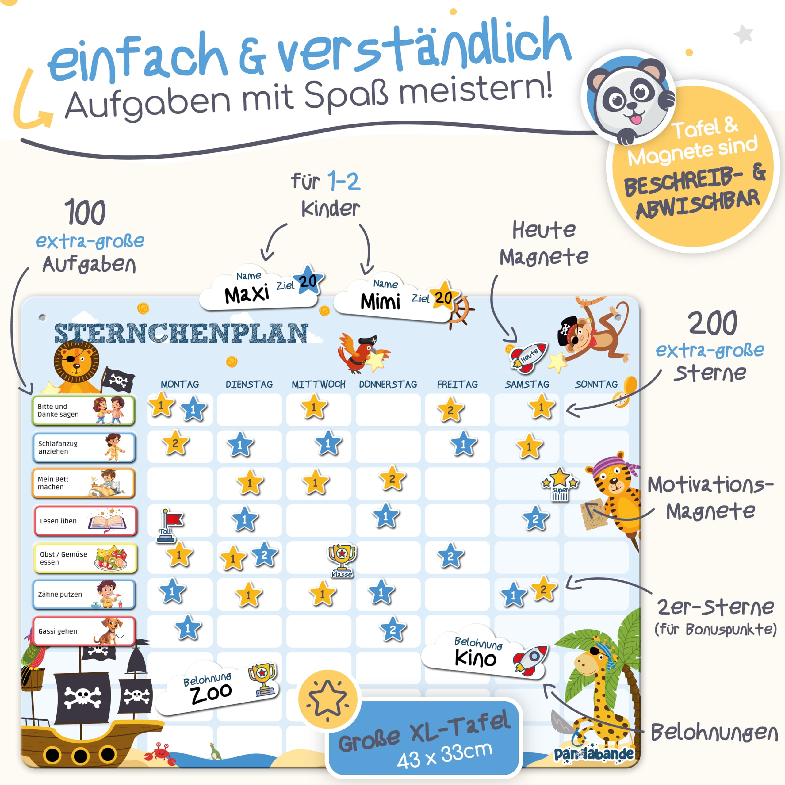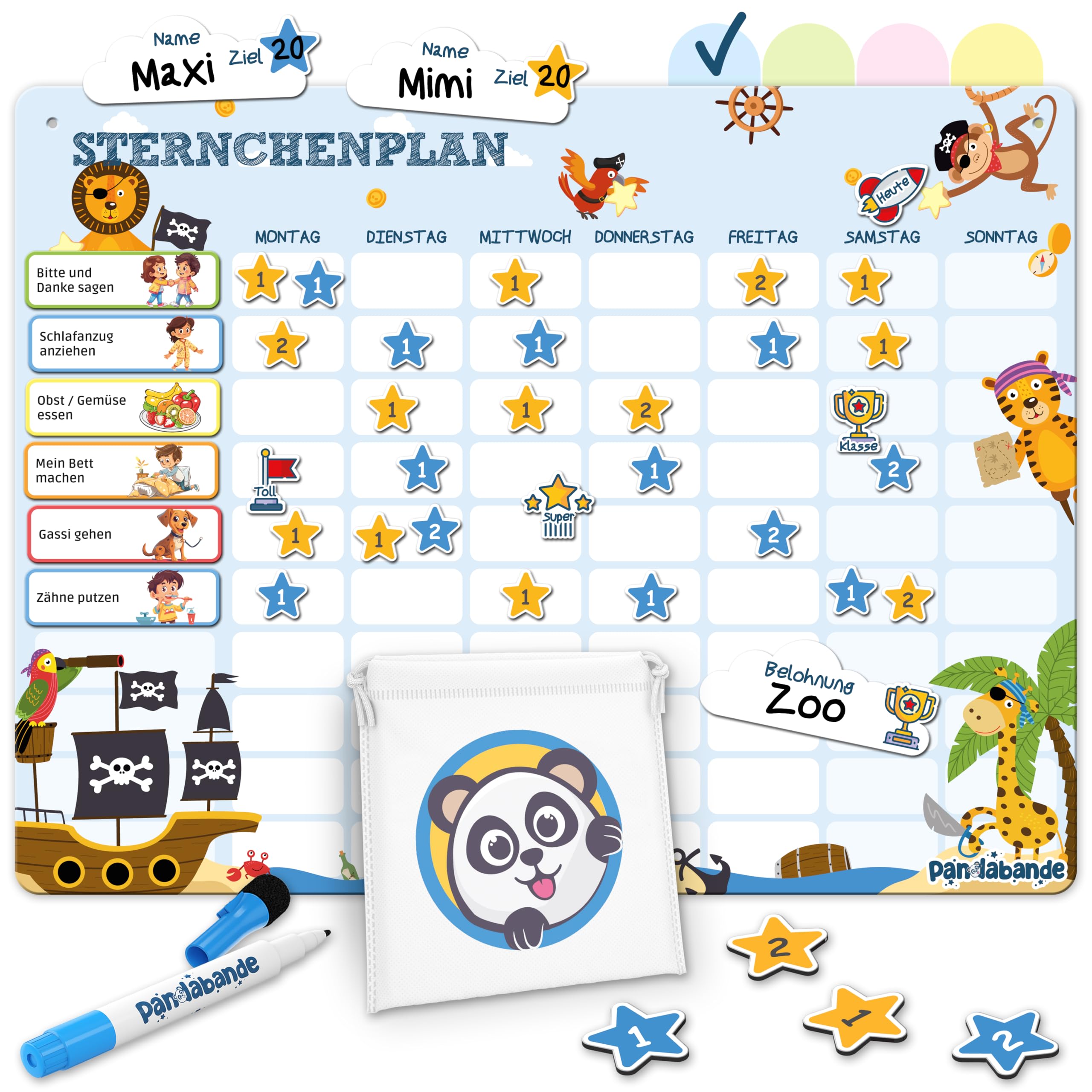 PANDABANDE® Belohnungstafel Kinder [100 Aufgaben, 200 Sterne, 1-2 Kinder] - Belohnungssystem für mehr Verantwortung - Idealer Aufgabenplaner Magnetisch, Wochenplaner Kind, Routine Planer (Piraten)