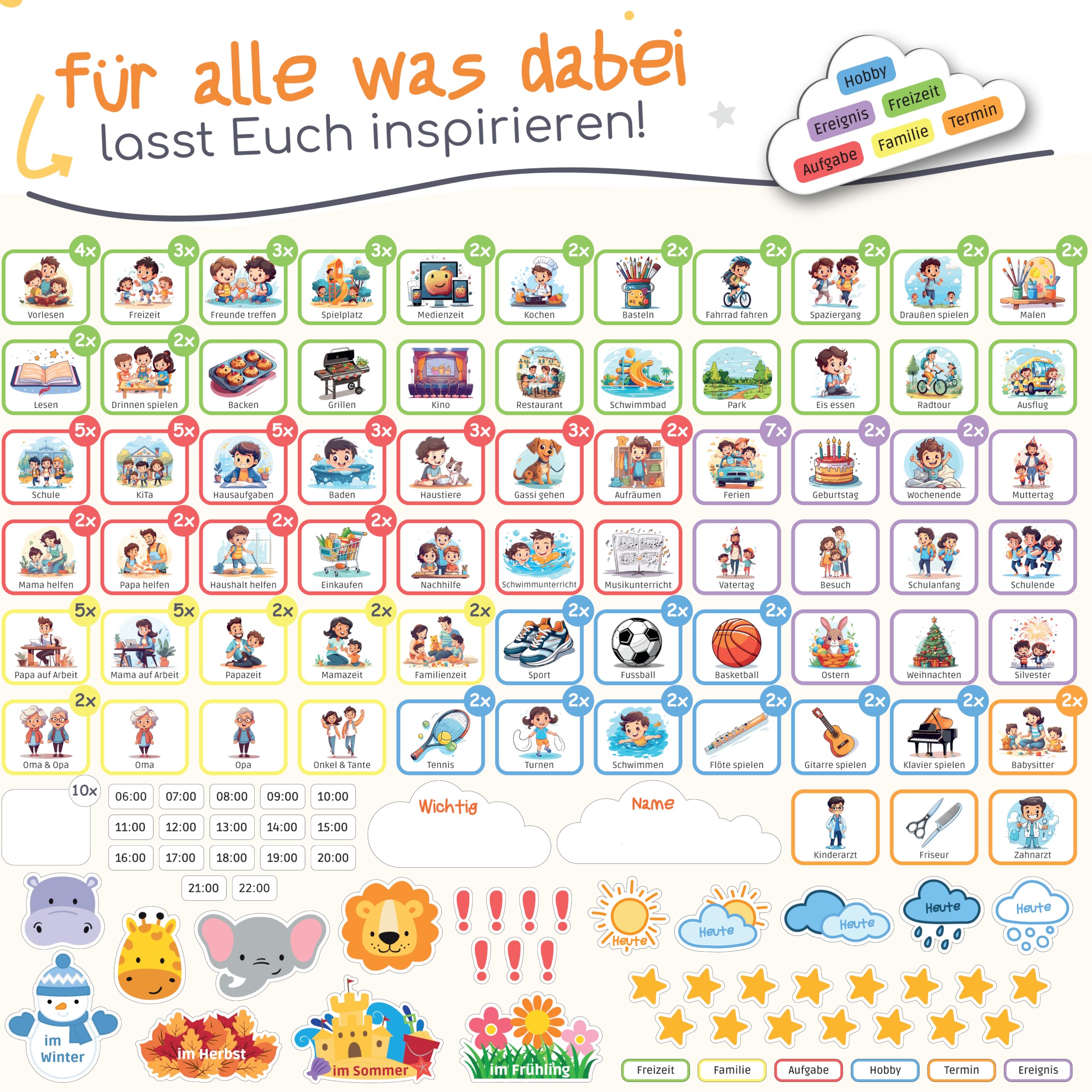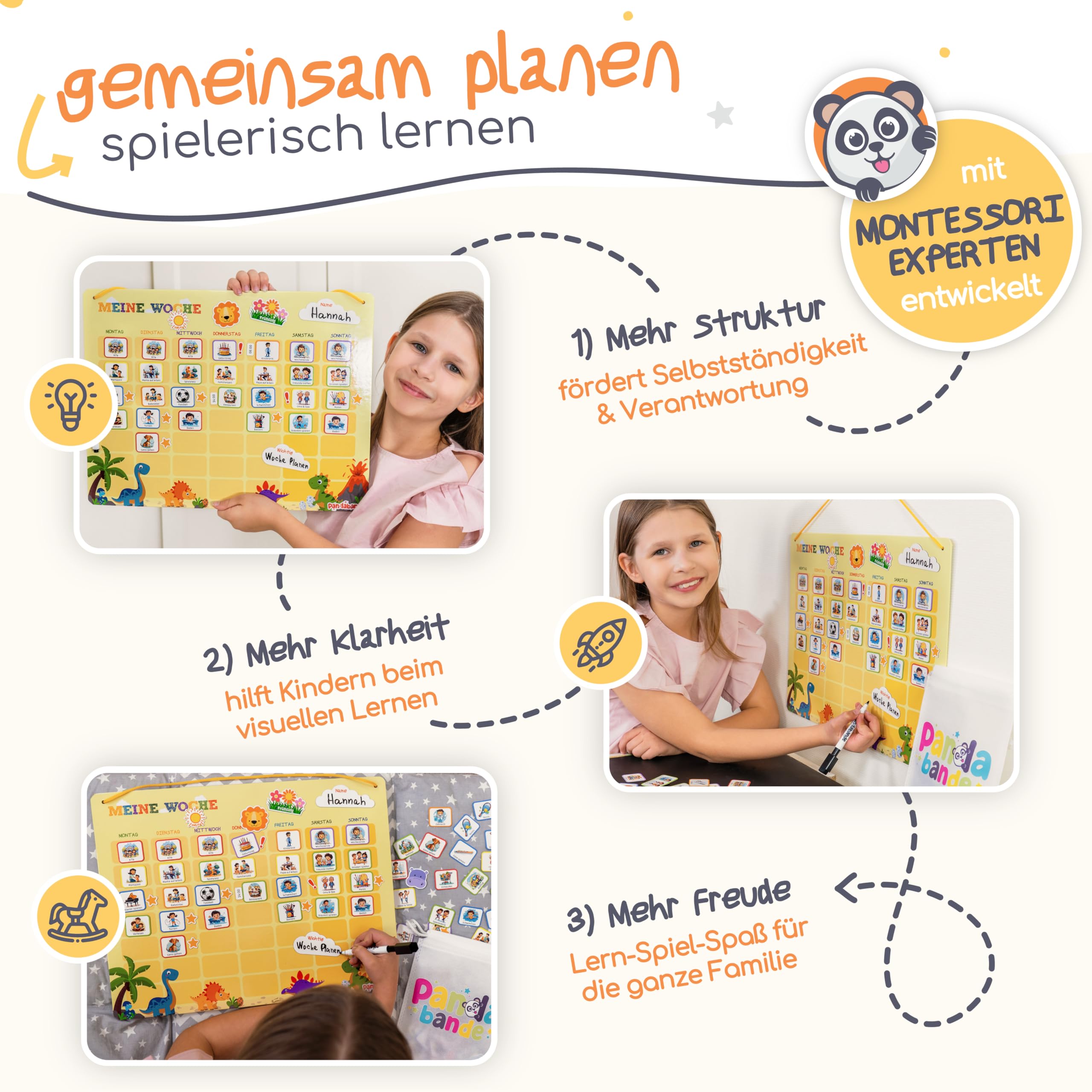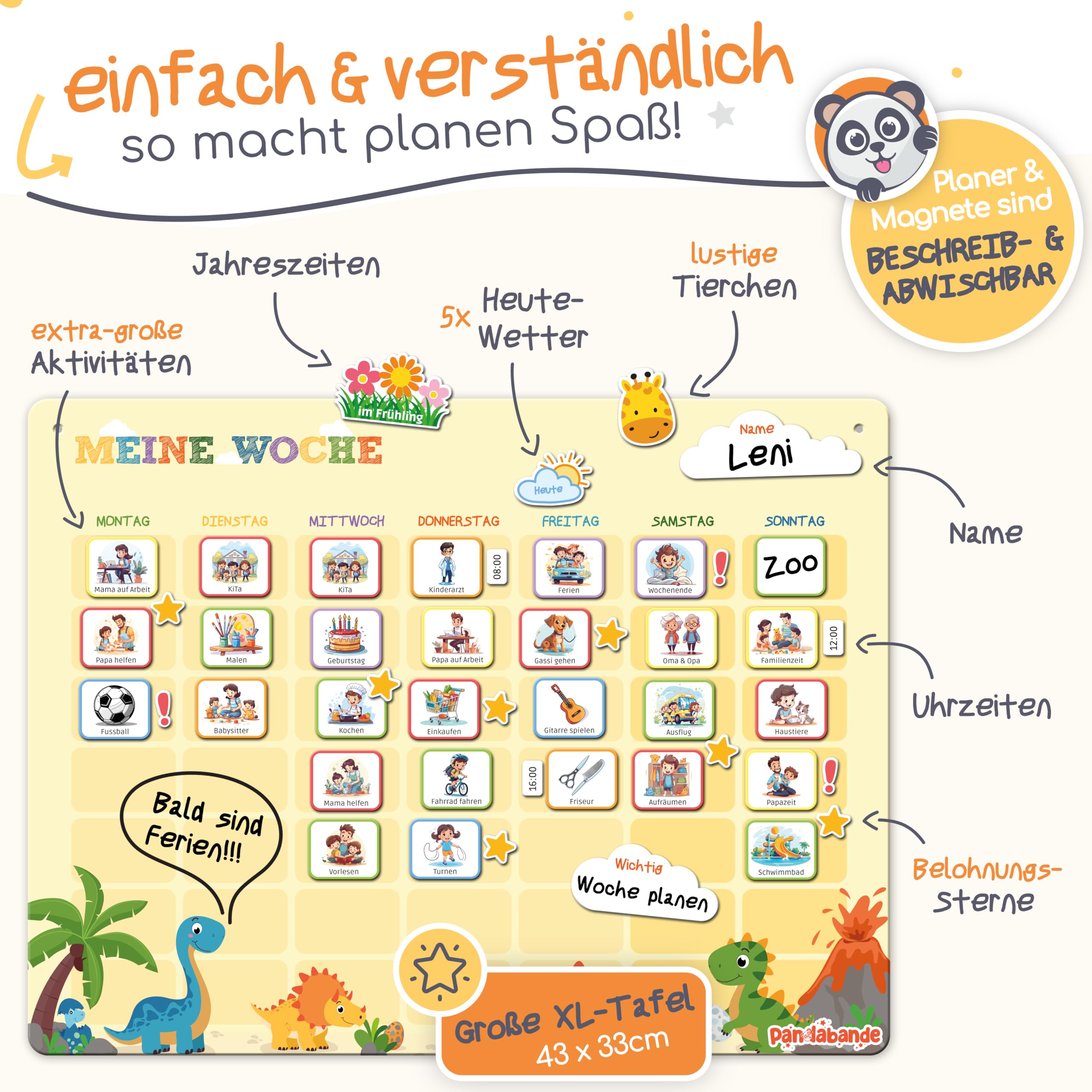 Mit dem Montessori Wochenplaner Kinder von der Pandabande kannst Du Deinem Kind ganz einfach auf spielerische Art die Woche erlernen. So förderst Du nicht nur die Selbstständigkeit Deines Kindes nach dem Montessori-Konzept, sondern es lernt auch die Wochentage und entwickelt dabei ein natürliches Zeitgefühl.Dein Kind erhält einen Überblick über anstehende Aktivitäten, kann Sterne für erledigte Aufgaben sammeln und am Ende der Woche eine kleine Belohnung erhalten. Zudem sind zahlreiche weitere Extras wie Wetter, Jahreszeiten, Uhrzeiten und Highlights-Magnete enthalten. So könnt Ihr Eure Woche ganz individuell gemeinsam planen und anstehende Aufgaben werden mit Spass gemeistert.Alle PANDABANDE Wochenplaner Kinder sind in 4 liebevoll gestalteten kindgerechten Farbvarianten erhältlich: Piraten (blau), Dschungel (grün), Einhörner (rosa), Dinosaurier (gelb). Perfekt für Mädchen oder Jungen oder auch bei mehreren Kindern und Geschwistern, damit jeder seinen eigenen Planer hat.Zudem lassen sich alle PANDABANDE Planer perfekt miteinander kombinieren - so kann beispielsweise der Wochenplaner mit den Routineplanern ergänzt werden oder der Tagesplaner mit der Belohnungstafel erweitert werden. Natürlich lassen sich auch alle Planer zusammen kombinieren - schliesslich hat jeder Planer hat einen anderen pädagogischen Fokus nach dem Montessori-Prinzip.Mit dem Montessori Wochenplaner Kinder von der Pandabande seid ihr als Familie bestens organisiert und Eure Kinder sind mit voller Vorfreude dabei!Inhalt:Grosse XL-Tafel mit Schnur und Klettband zum Aufhängen150 Aktivitäten-Magnete mit liebevoll gestalteten Motiven in 6 Kategorien60 Spezial-Magnete wie Wetter, Jahreszeiten, Uhrzeiten, Highlights, SterneÜber 100 weiteren Aktivitäten zum gratis herunterladen und auf Blanko-Magnete aufklebenAbwischbarer magnetischer Stift und Tasche für Magnete