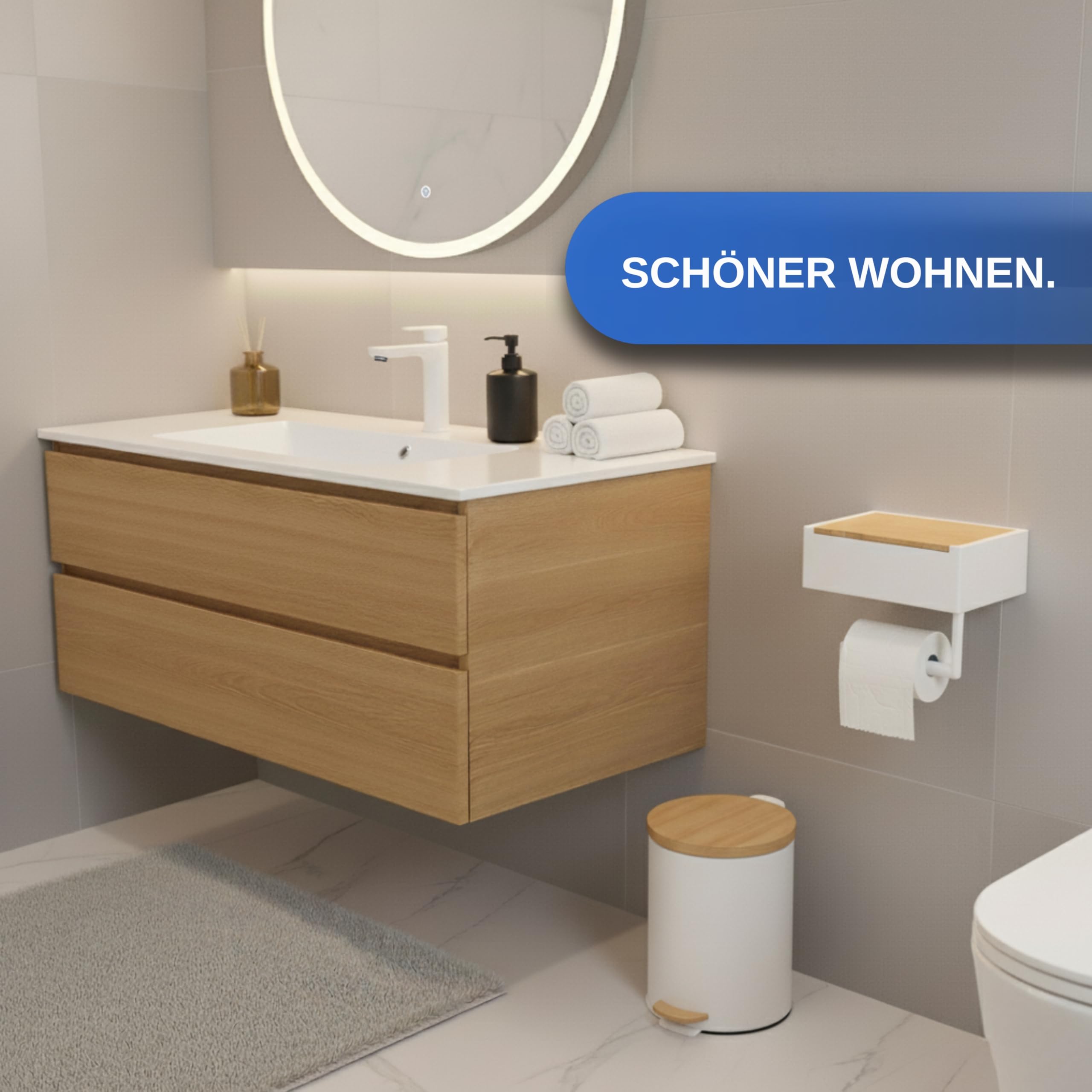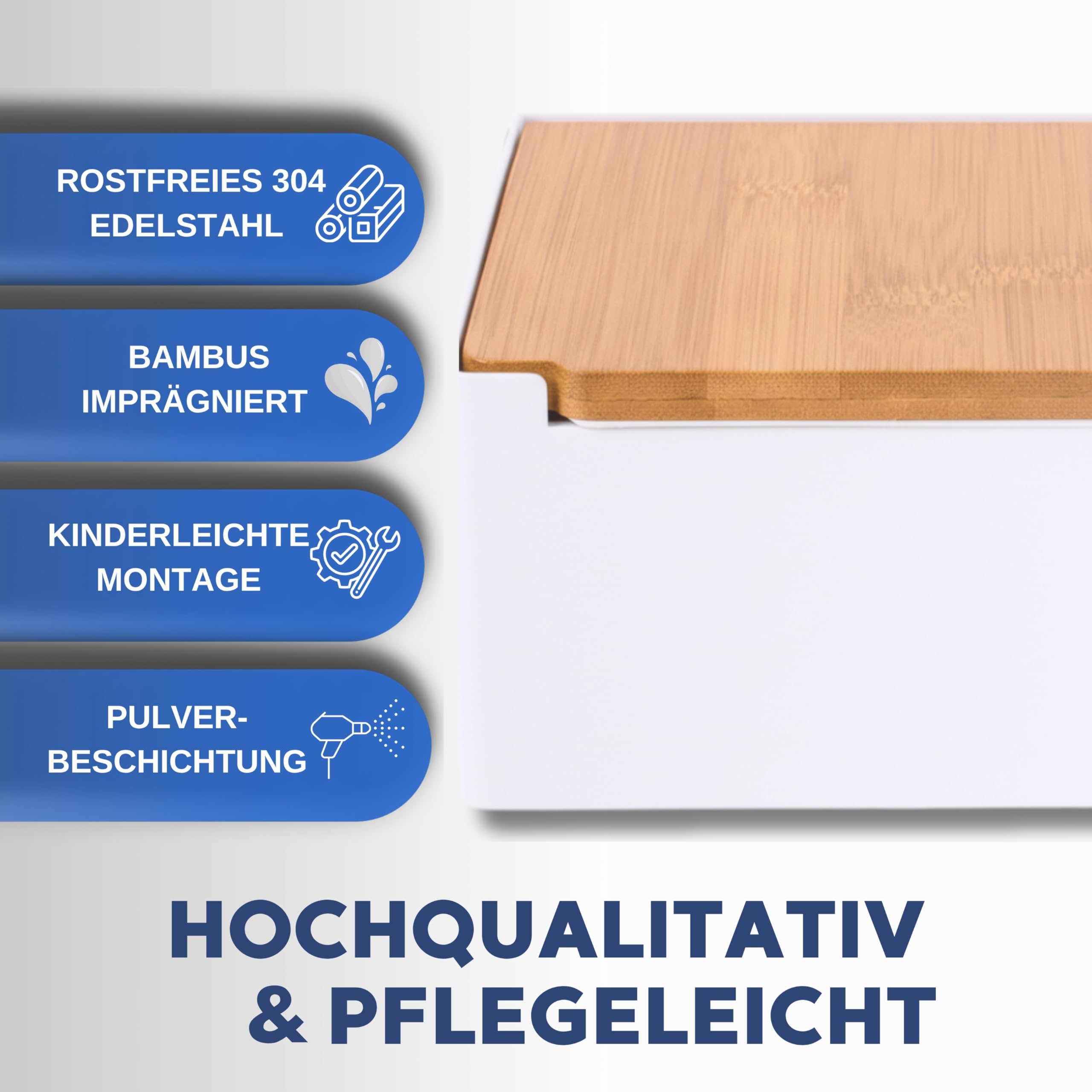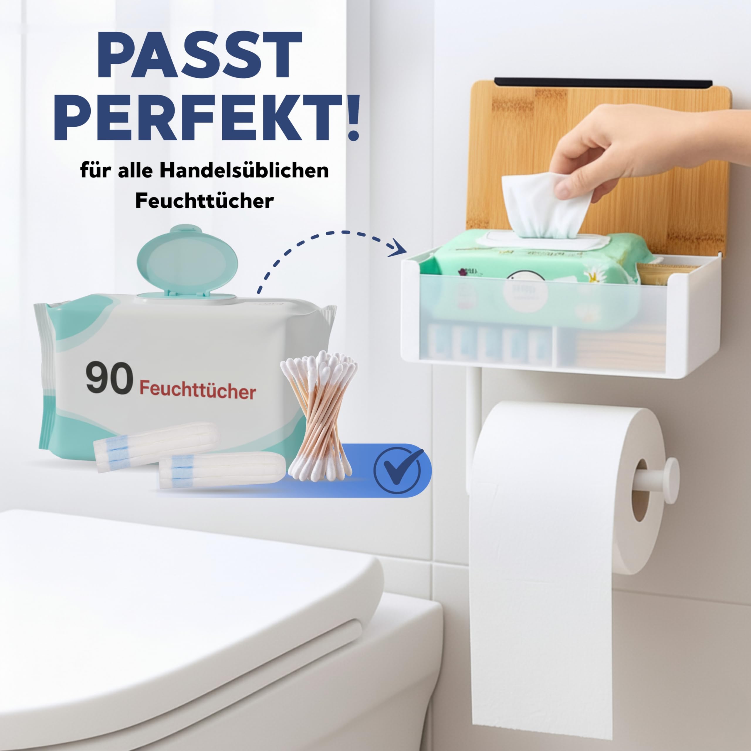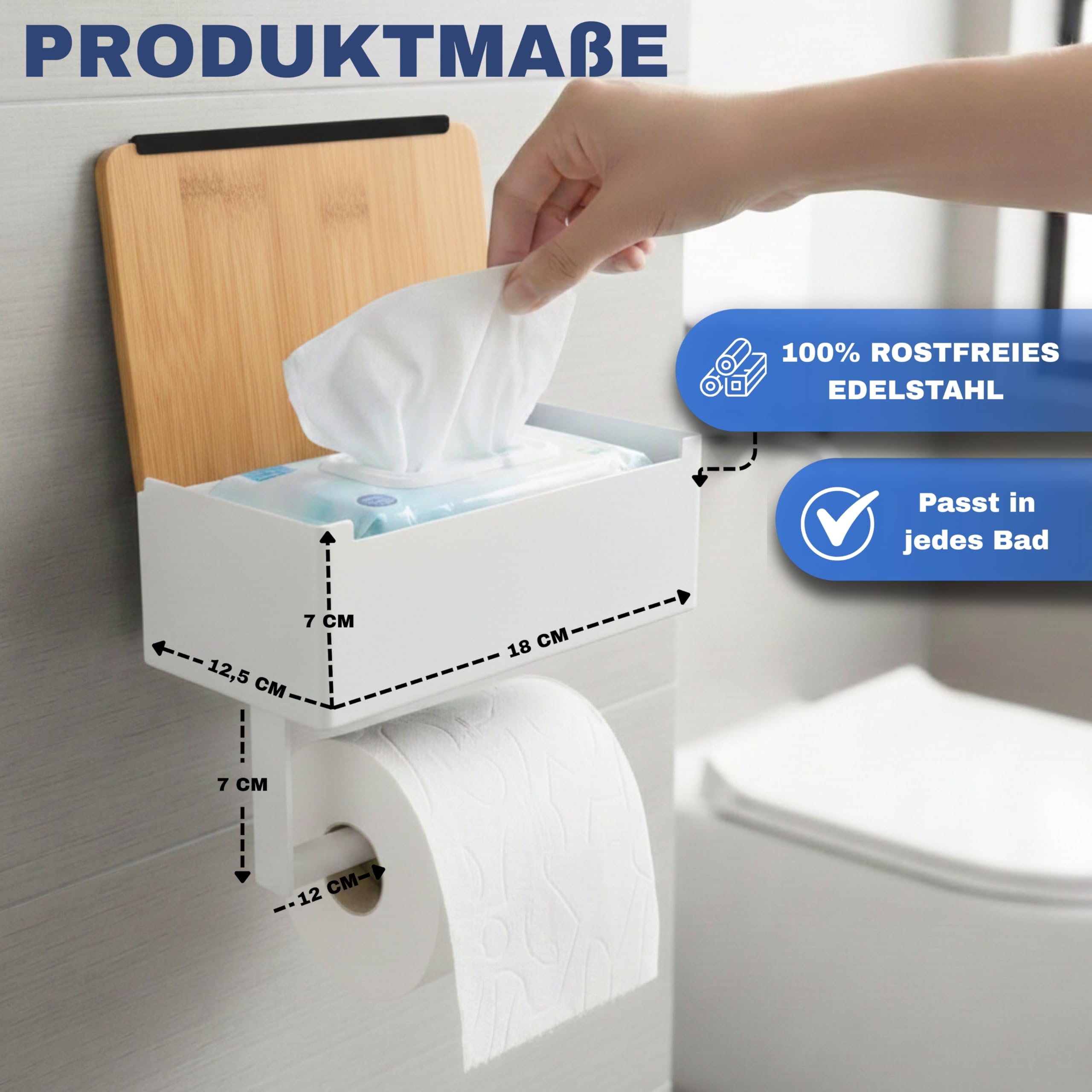 Pandonix® Toilettenpapierhalter mit Feuchttücherbox - Edelstahl & Bambus - Toilettenpapierhalter ohne Bohren - Weiss - klopapierhalter mit feuchttücherbox
