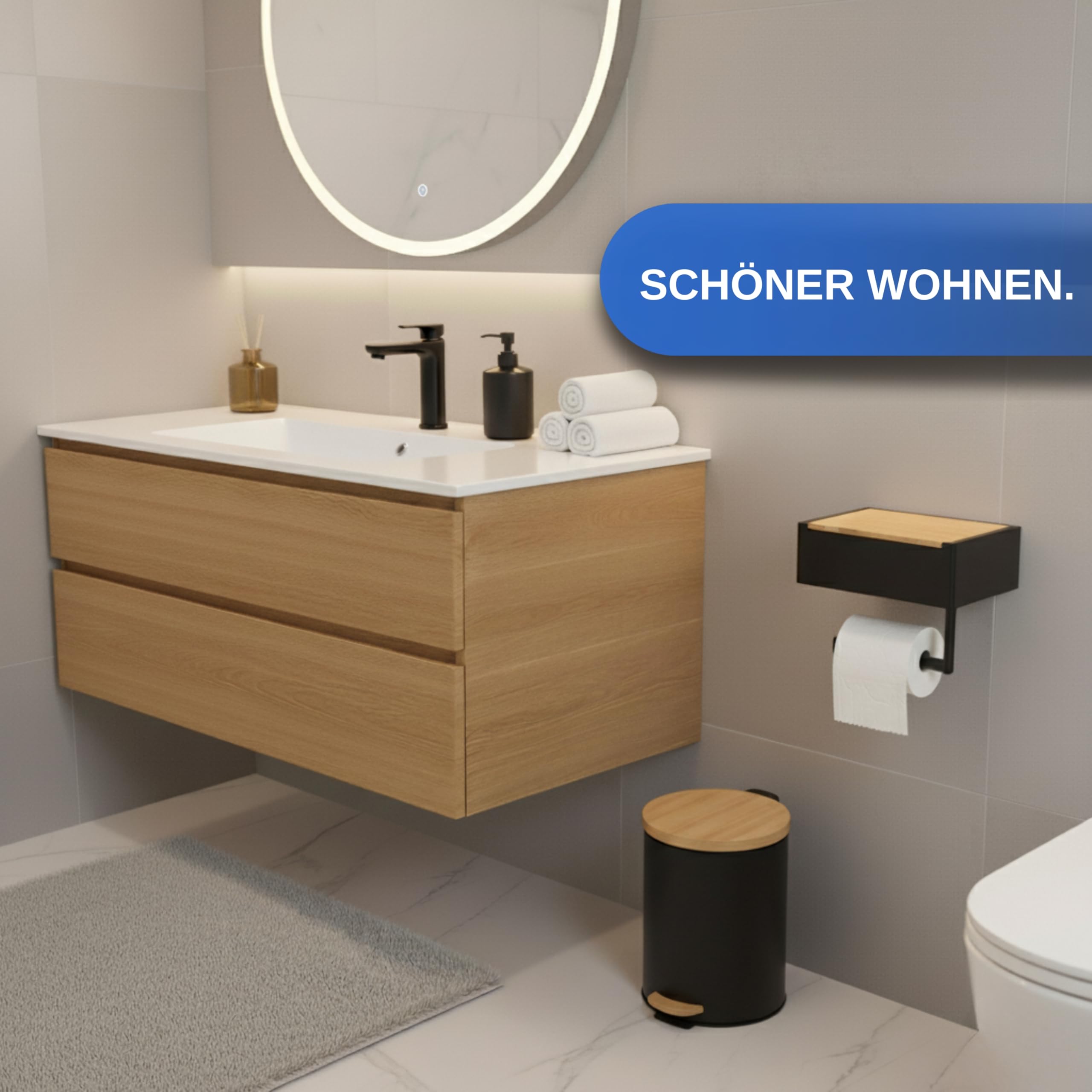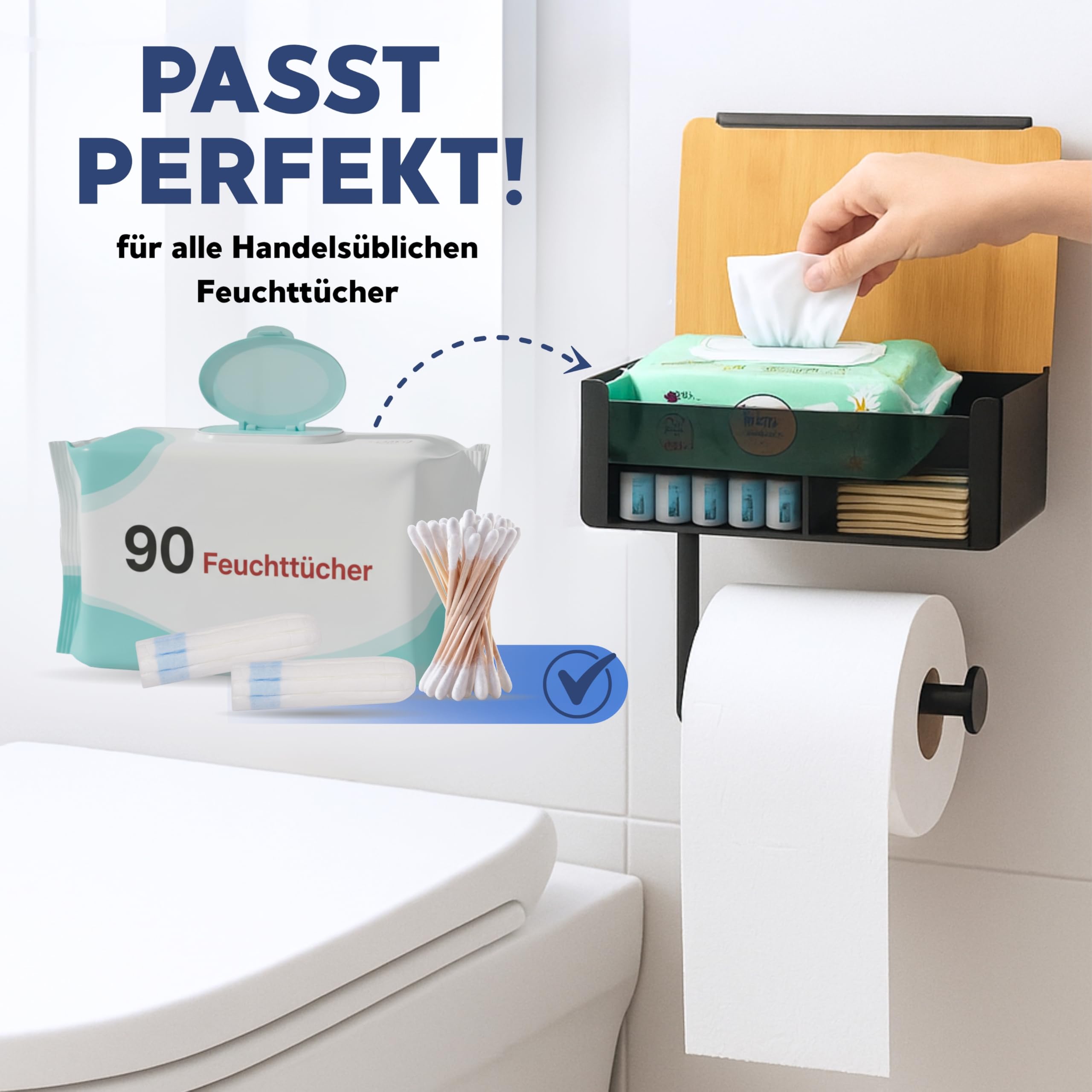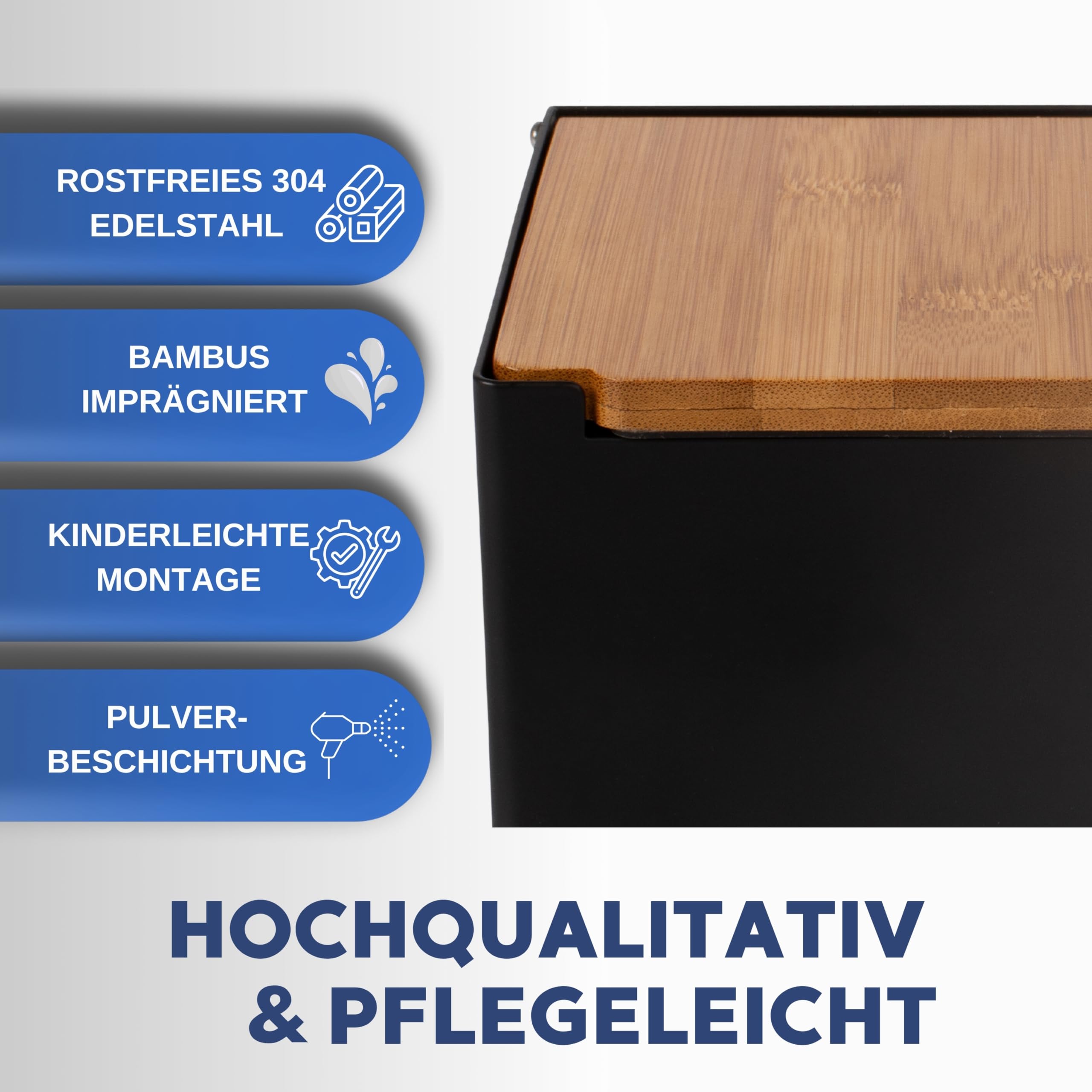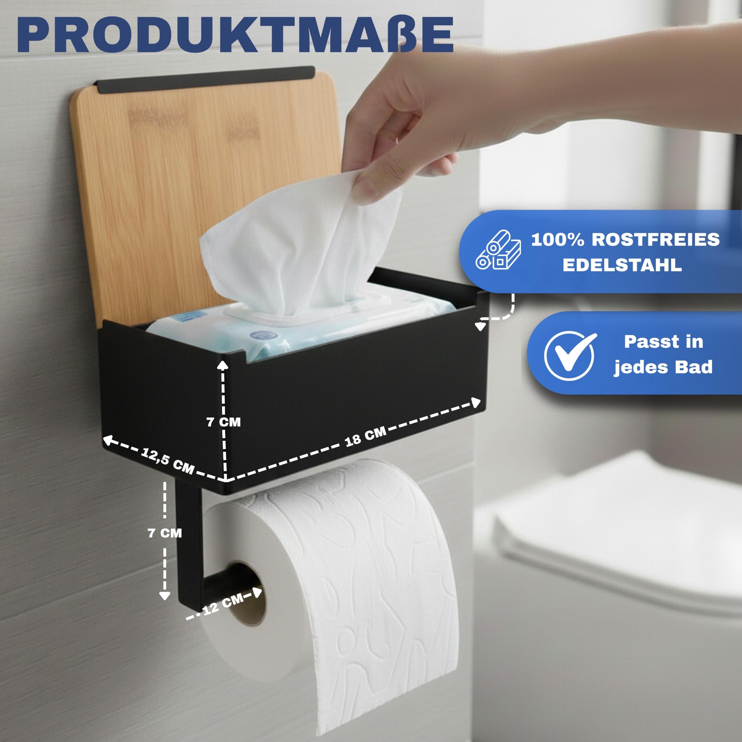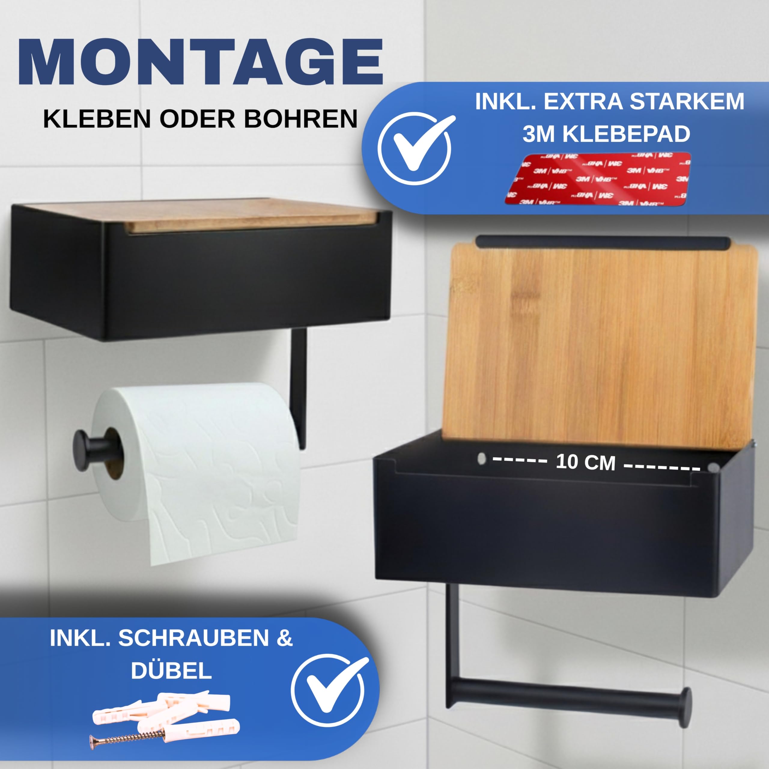 Pandonix® Toilettenpapierhalter mit Feuchttücherbox - Edelstahl & Bambus - Toilettenpapierhalter ohne Bohren - [Schwarz] - klopapierhalter mit feuchttücherbox