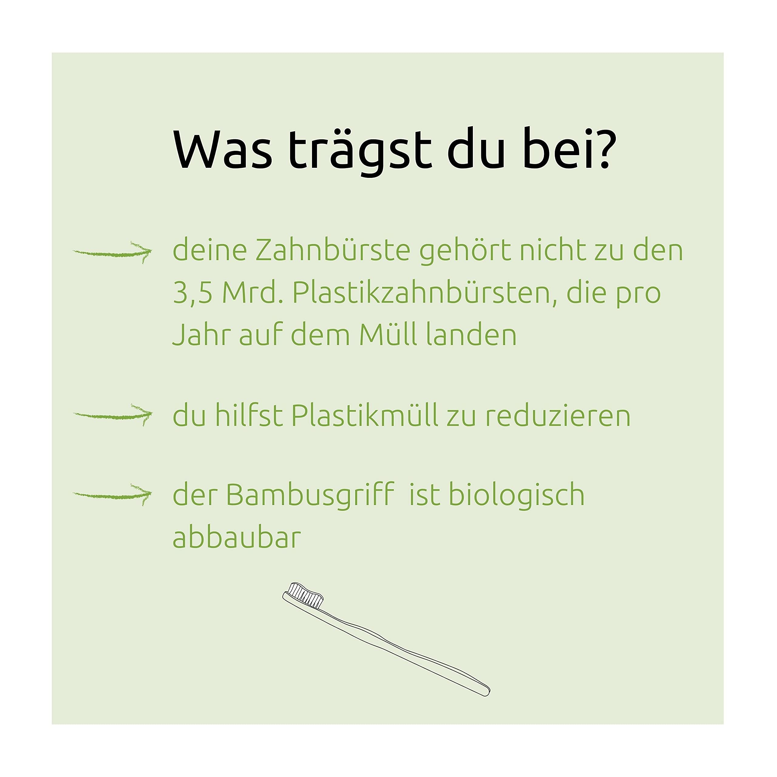 Pandoo Zahnbürsten sind die nachhaltige Alternative zu herkömmlichen Zahnbürsten aus Kunststoff und Holz. Perfekt für den täglichen Gebrauch. Zudem sind sie nachhaltig, vegan, angenehm weich und robust. Sie bestehen grösstenteils aus natürlichem Bambus. Bambus ist eine natürlich nachwachsende Ressource, die schnell wächst und daher sehr nachhaltig ist. Ausserdem hat es antibakterielle Eigenschaften und ist extrem widerstandsfähig. Die Zahnbürste ist 100% BPA-frei und kommt ohne schädliche Weichmacher aus.